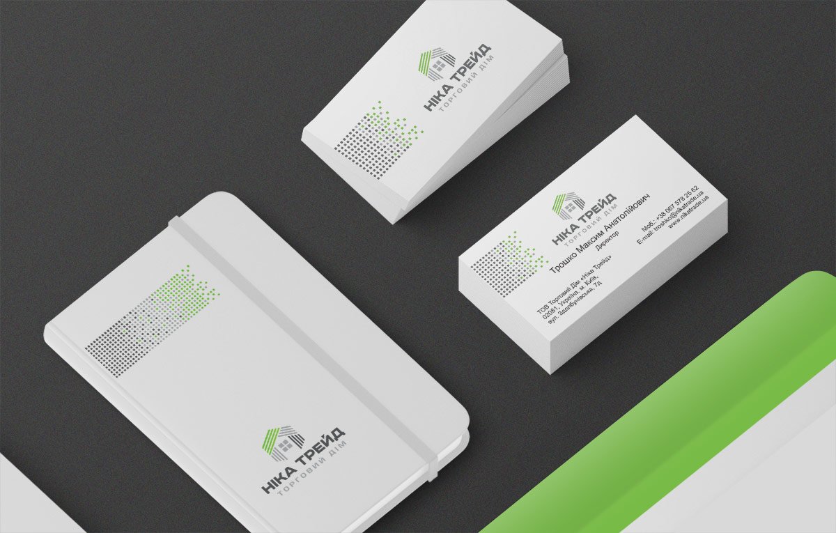 Шрифтове написання назви “НІКА ТРЕЙД” розроблено дизайнерами нашої студії та виконане у строгому стилі.