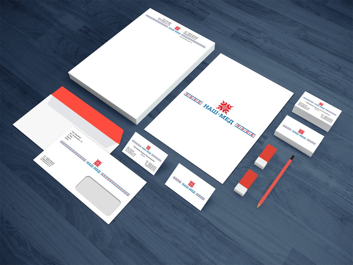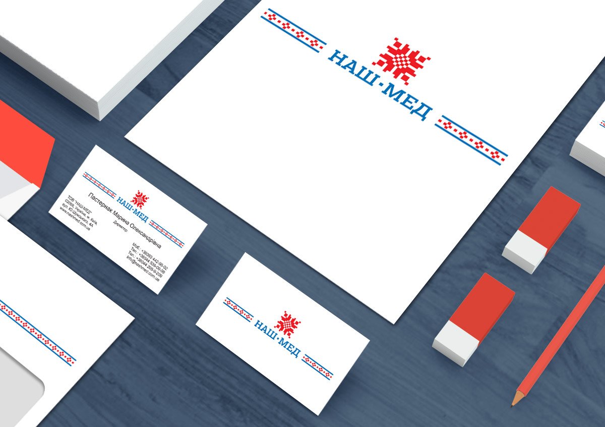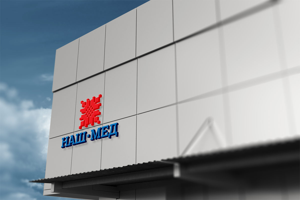 Шрифтове написання назви “НАШ-МЕД” розроблено дизайнерами нашої студії та виконане у строгому стилі.