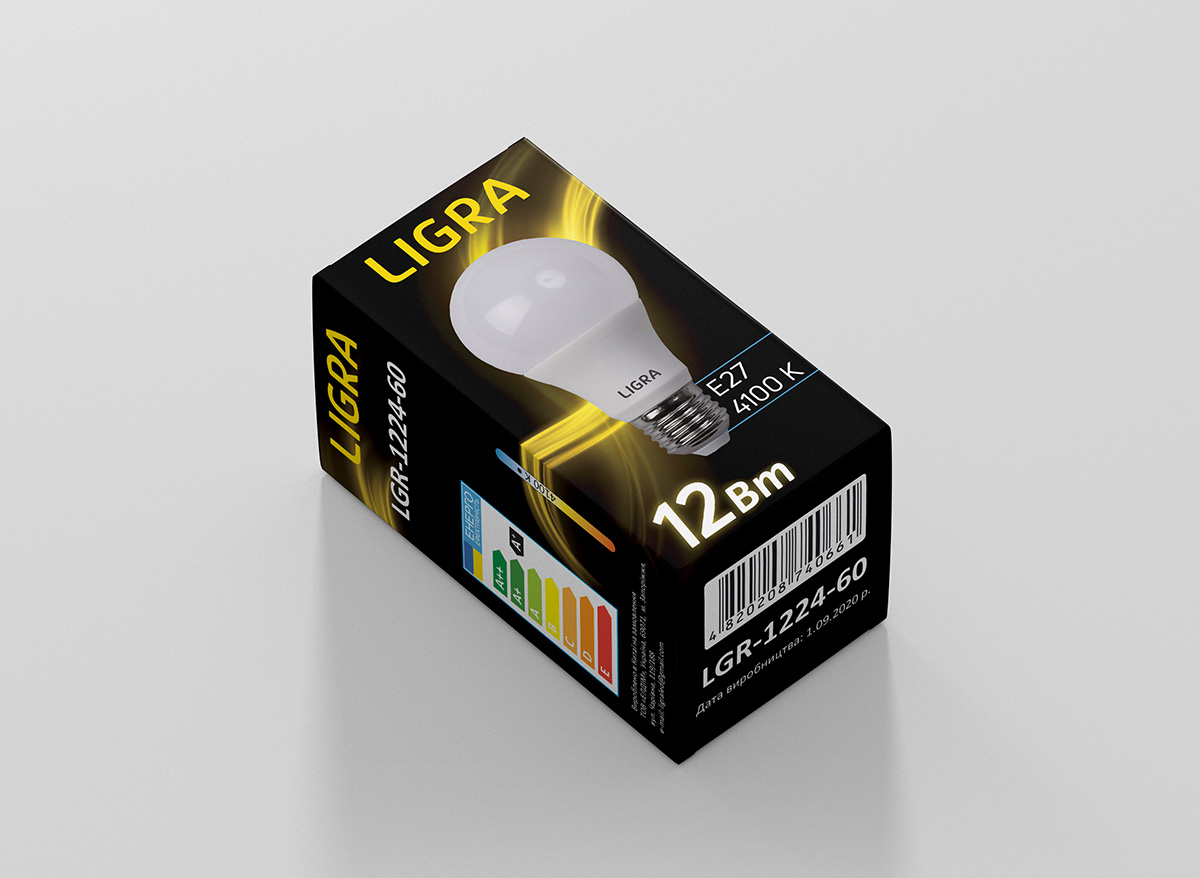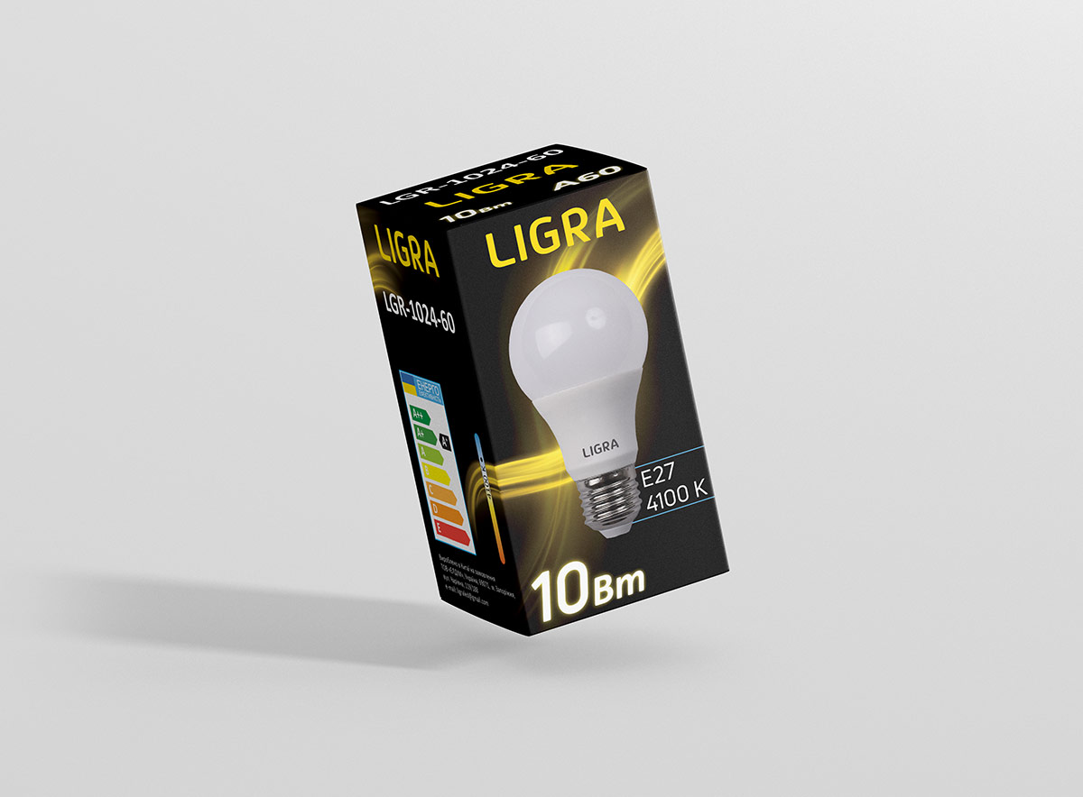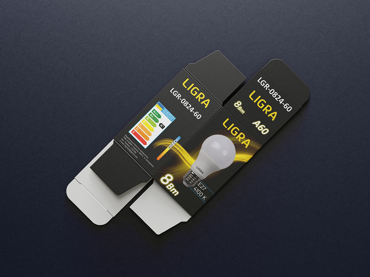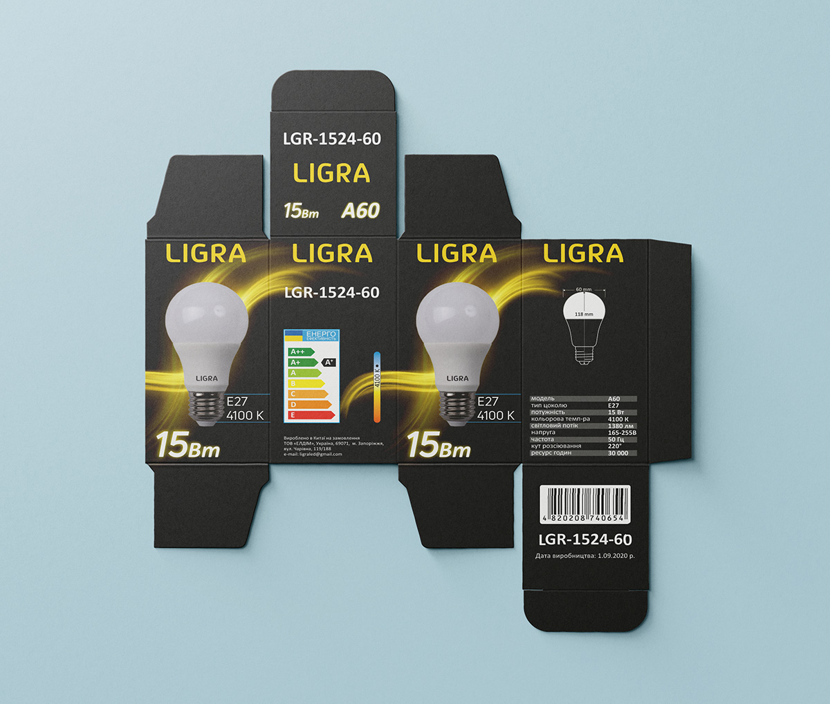 Розробка дизайну упаковки світлодіодних ламп LED ТМ "LIGRA" була виконана після вивчення побажань цільової аудиторії та специфіки регіону продажу (південна область України). Упаковка розроблена в яскравому, сучасному та життєрадісному стилі.