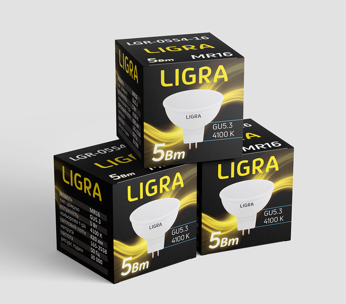 Основу асортименту ТМ "LIGRA" складають прості, базові моделі світлодіодних ламп і світильників, створені на основі надійних, перевірених часом рішень в галузі енергозберігаючого освітлення. Вся світлотехніка відрізняється помірною ціною при високих параметрах надійності та довговічності, і орієнтована на прагматичних споживачів, які воліють купувати якісні товари, не сплачуючи за додаткові опції. Ми сподіваємося, що розроблений дизайн упаковки ламп сприятиме зміцненню бренду на українському ринку, відбиваючи високу якість продукції.