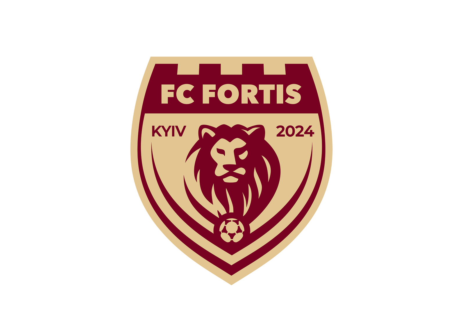 Під головою лева розташований футбольний м'яч, що безпосередньо пов'язує емблему з її спортивною суттю, підкреслюючи відданість грі та прагнення до досконалості. Верхня частина щита оформлена у вигляді зубців вежі, символізуючи неприступність, силу традицій та велич. Цей елемент відсилає до ідеї фортифікації - укріпленої споруди, що логічно перегукується з назвою клубу FC FORTIS (від латинського "fortis" - сильний, міцний, хоробрий).
