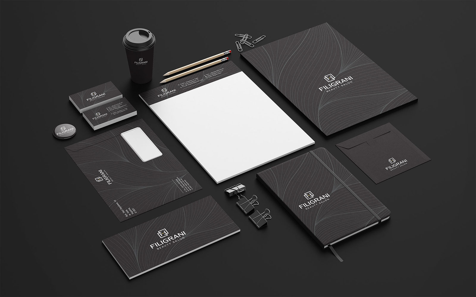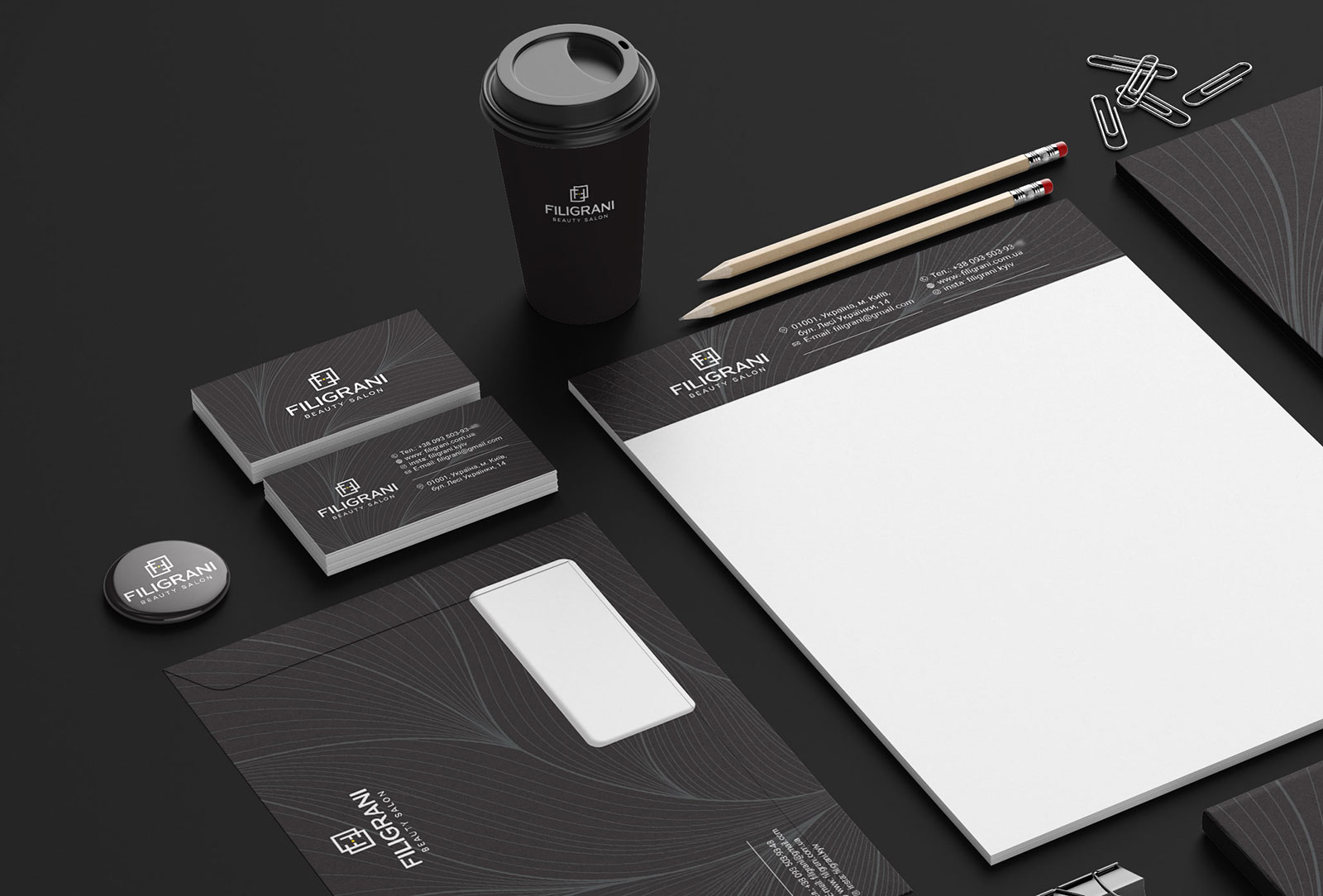У рамках роботи було сформовано повний комплект фірмових носіїв: візитні картки, бланки, конверти та інші елементи ділової комунікації. Кожна позиція розроблена так, щоб сприйматися єдиною візуальною мовою FILIGRANI — акуратно, лаконічно та професійно.