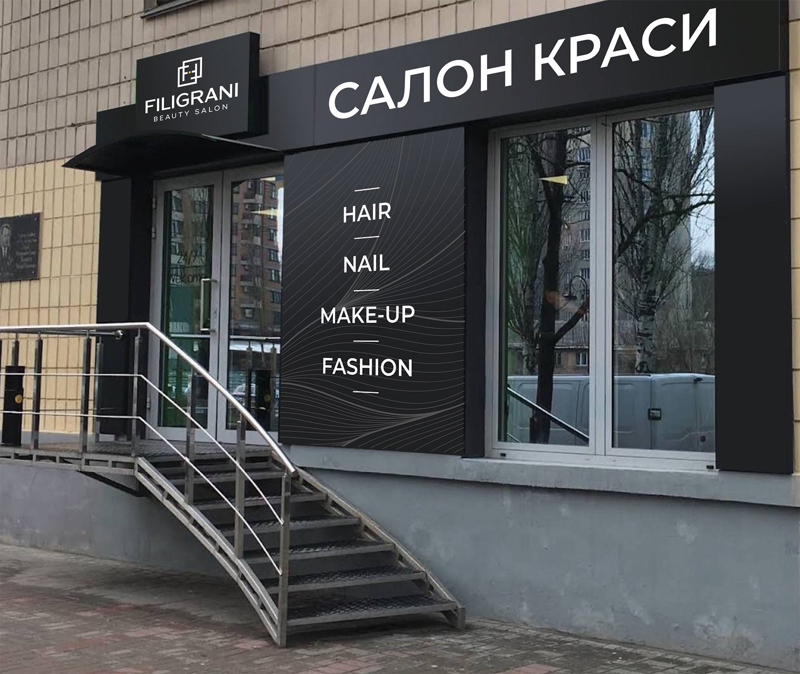 Невід'ємною частиною візуальної ідентичності бренду стало оформлення фасаду. Дизайн фасаду був розроблений з урахуванням фірмового стилю та корпоративної колірної гами, що забезпечує повну відповідність візуальної системи як усередині, так і зовні. Такий підхід дозволяє створювати цілісний образ салону краси та посилює його запам'ятовування.