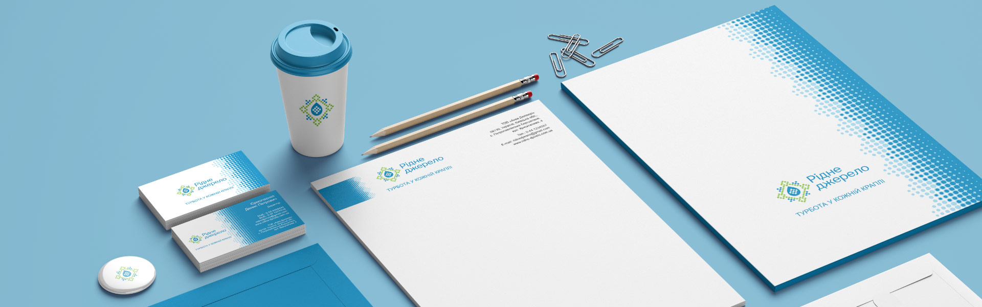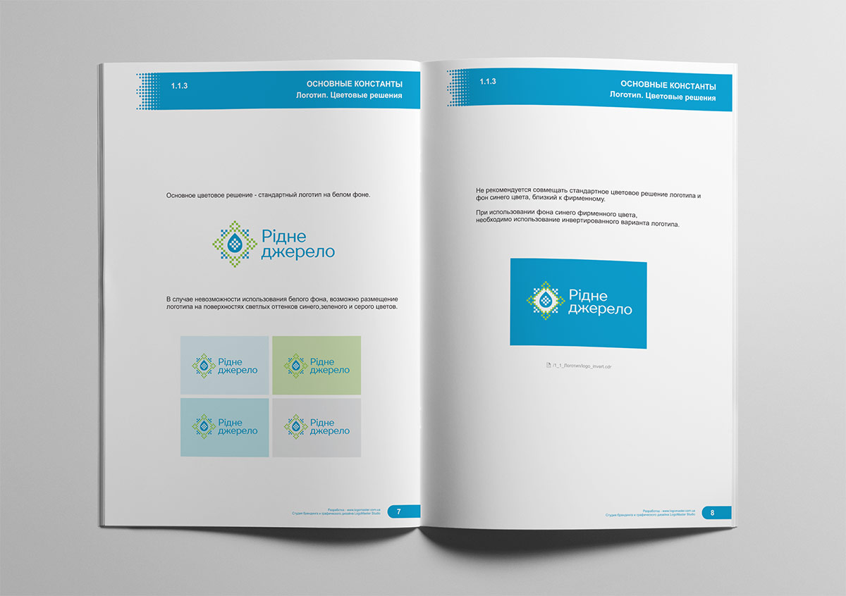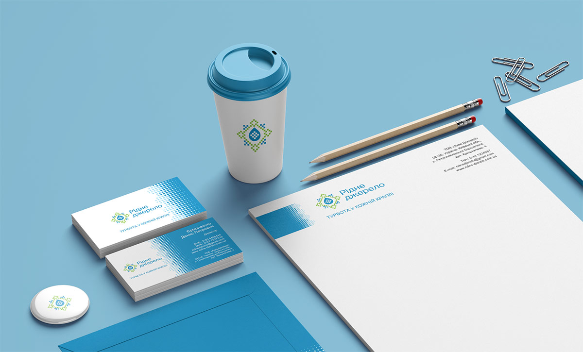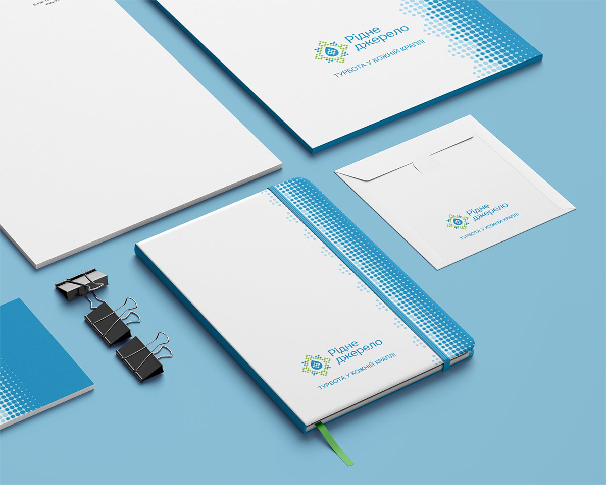Шрифтовое написание названия “Рідне джерело” разработано дизайнерами нашей студии и выполнено в строгом стиле.
