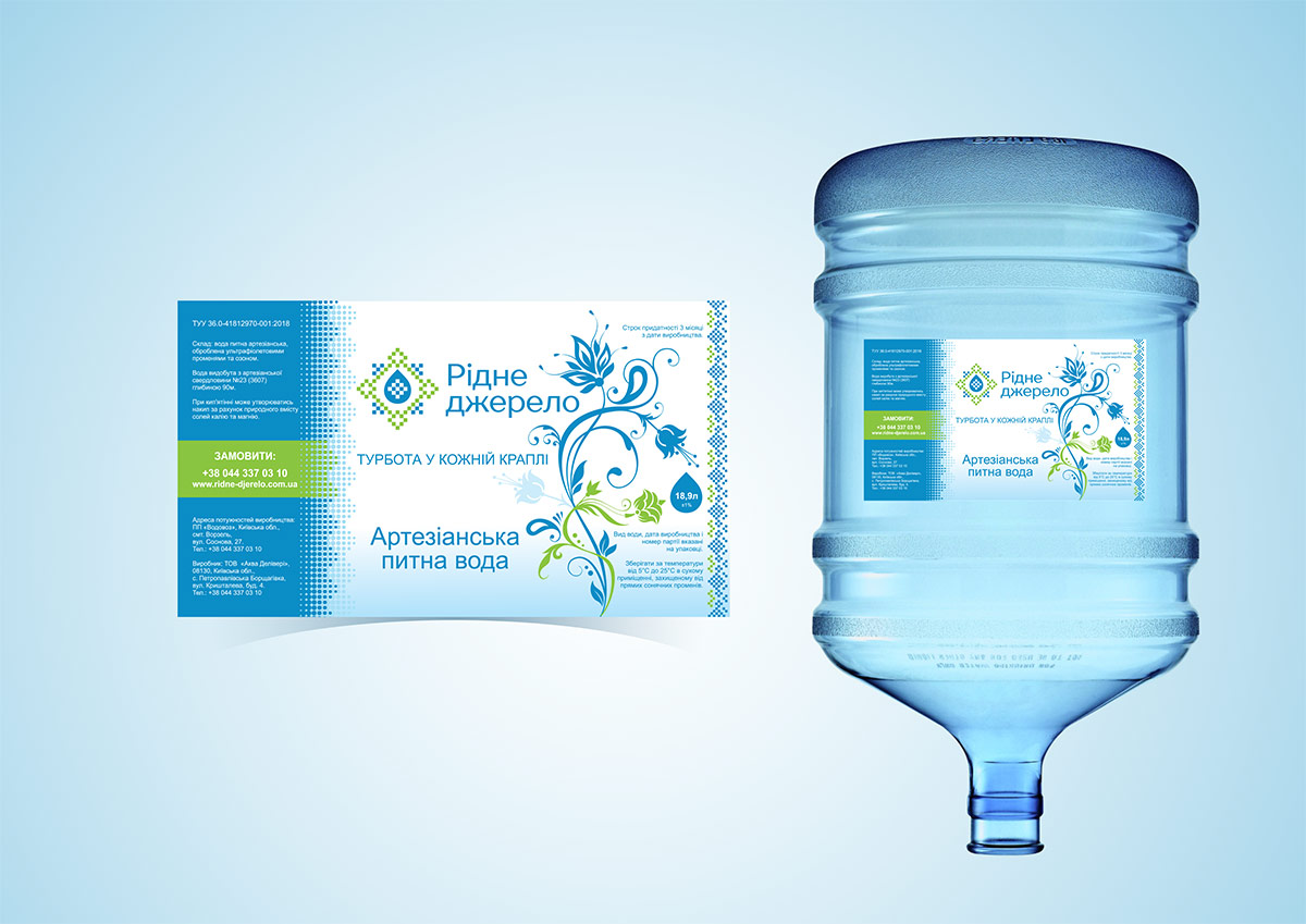 В основе дизайна этикетки для бутыля воды на 19 литров лежит разработанный фирменный стиль, который был дополнен элементами Петриковской росписи (цветочки), а так же украинским орнаментом. Общее цветовое решение выдержано в базовых цветах бренда. Разработанная этикетка очень сильно отличается по своей подаче от аналогичных торговых марок на рынке артезианской воды в городе Киеве, что и требовалось сделать в рамках заказа.