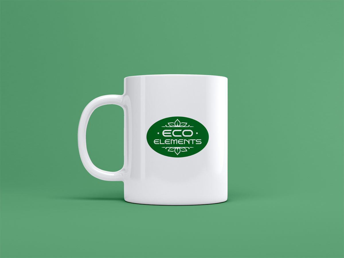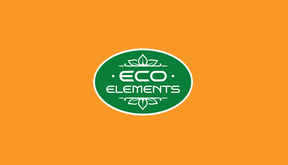 Логотип выполнен в виде овала с названием “ECO ELEMENTS”, которое сверху и снизу обрамляют листики, напоминающие стилизованную корону (для передачи высокого уровня продукции).