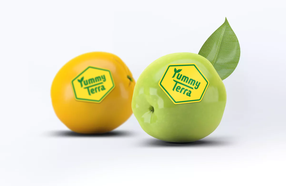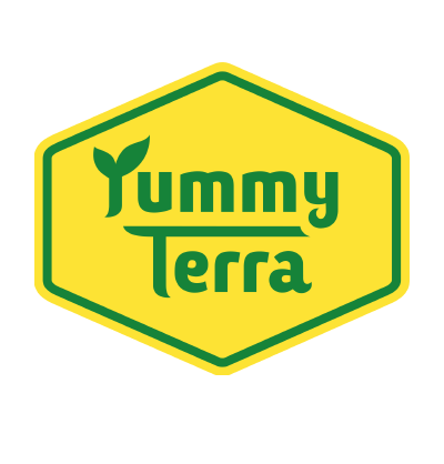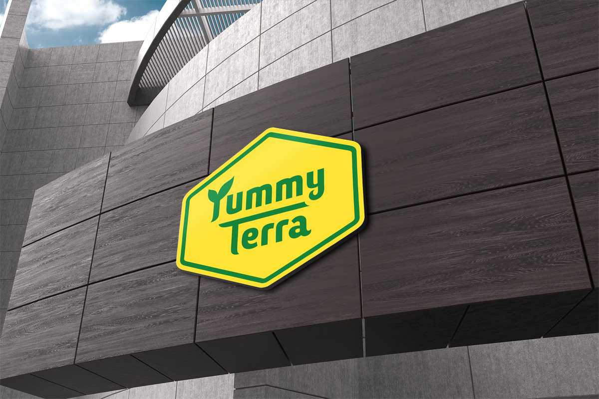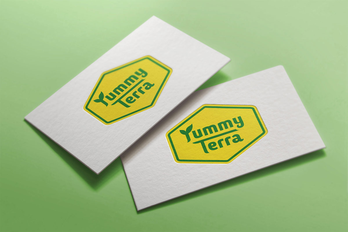 Логотип выполнен в виде шестиугольника, в который вписано название “Yummy Terra”, где первая буква названия разработана в виде листочков растения. Шрифтовое написание названия в логотипе разработано дизайнерами нашей студии.