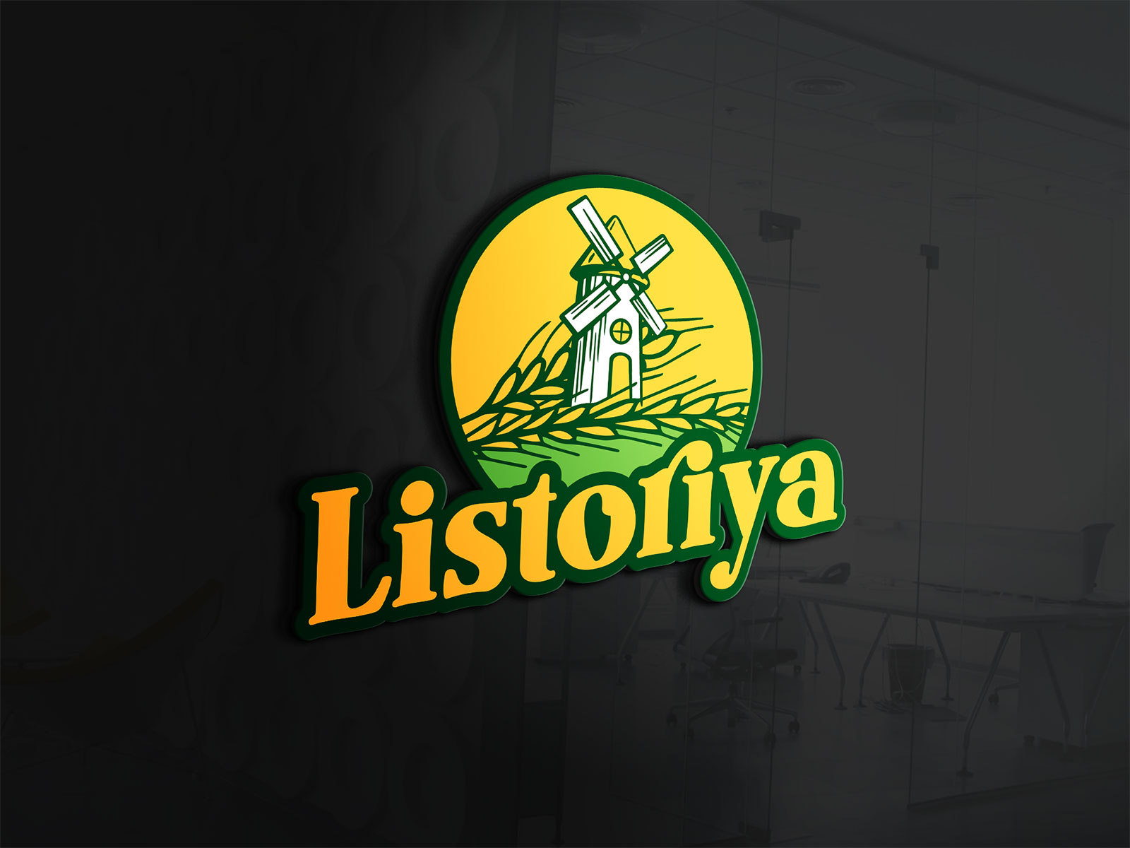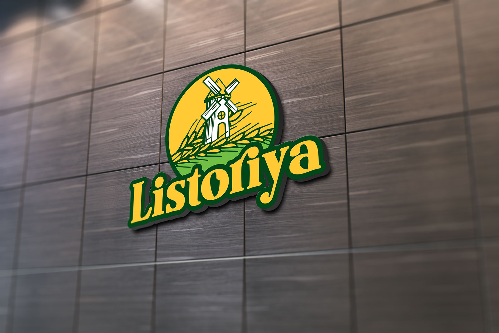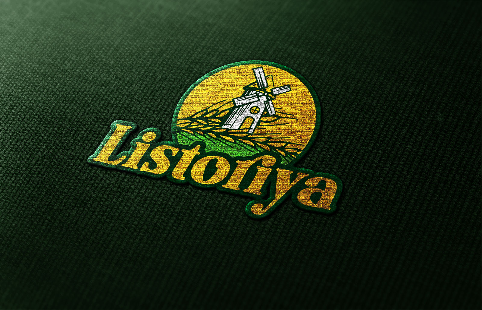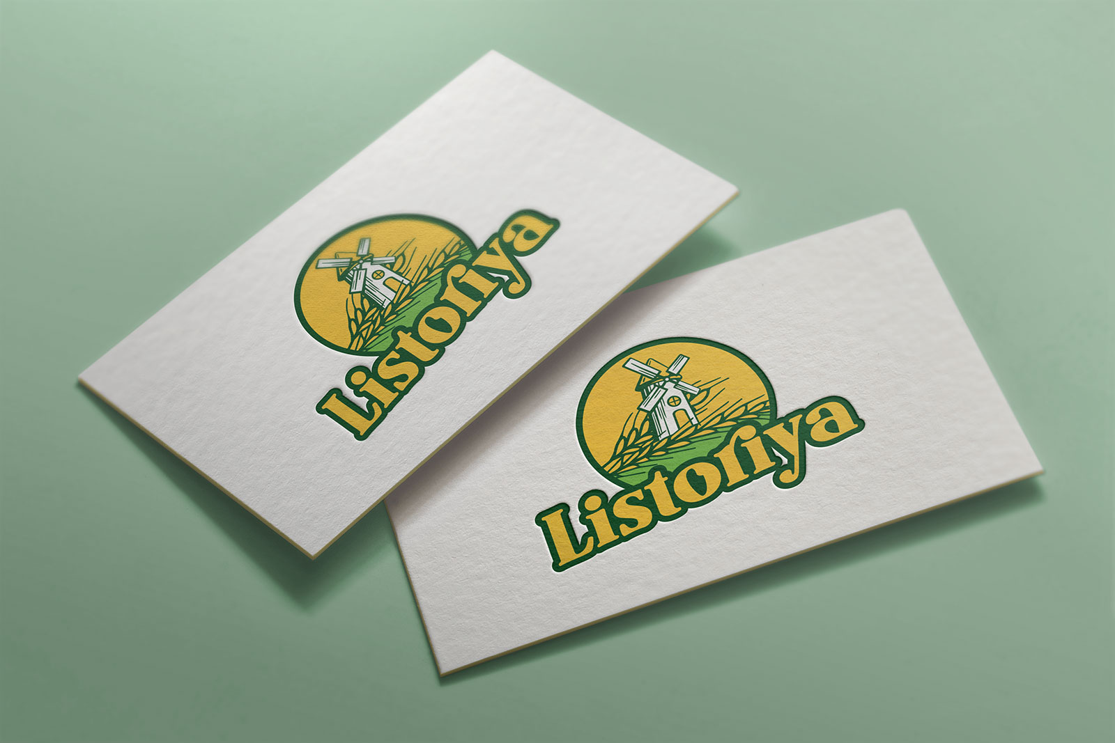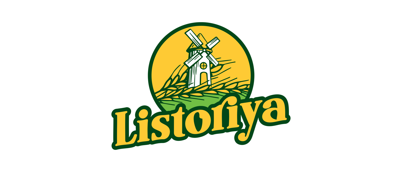 Разработанный логотип выполнен в виде рисованной мельницы в круге с колосками и отражает традиции и естественность продукции бренда "Listoriya."