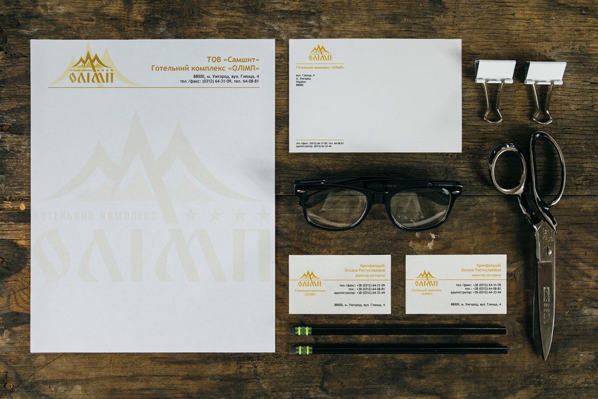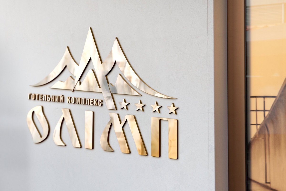 Основне завдання логотипу – бути тематичним, впізнаваним, оригінальним та незабутнім. Графічна частина логотипу виконана у вигляді гір – грецький Олімп та відображає високу якість послуг та сервісу готелю. Золотистий колір логотипу підкреслює статус 4-х зіркового готелю та ресторану.