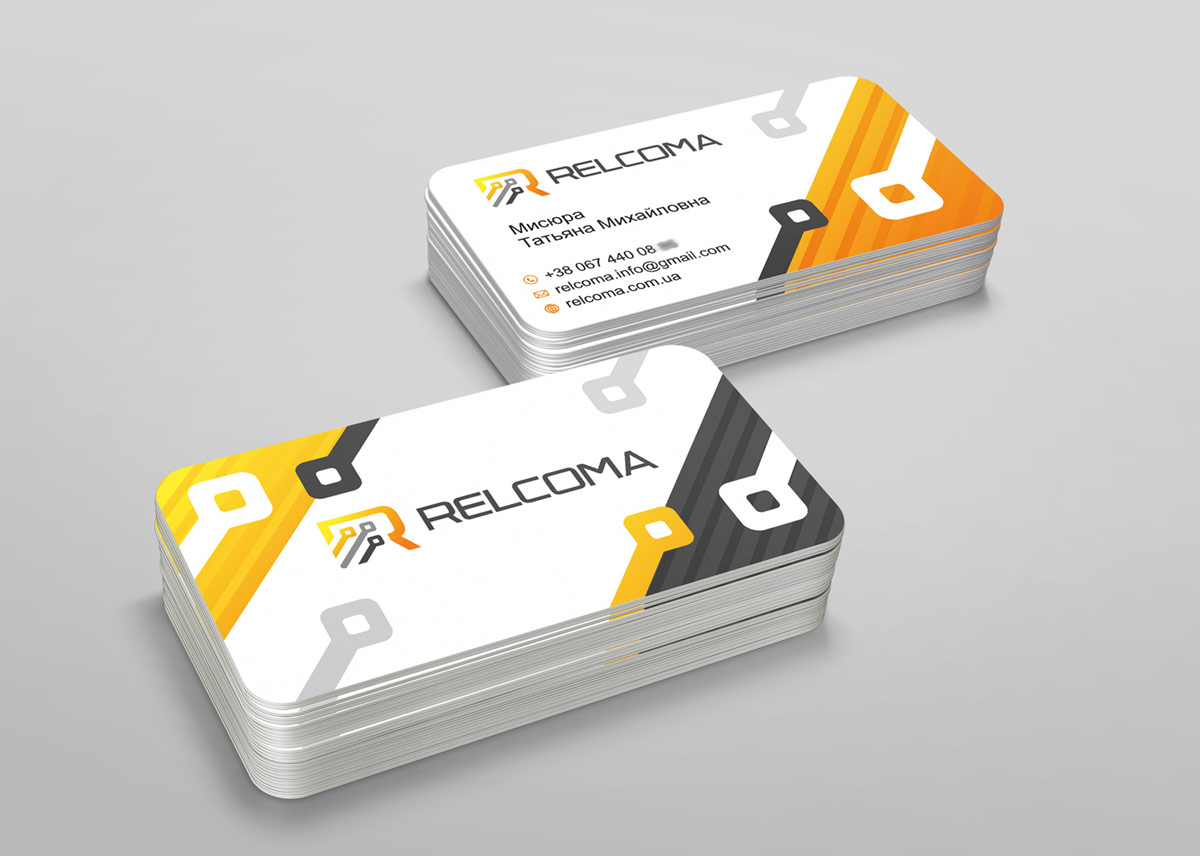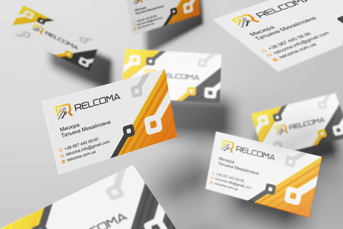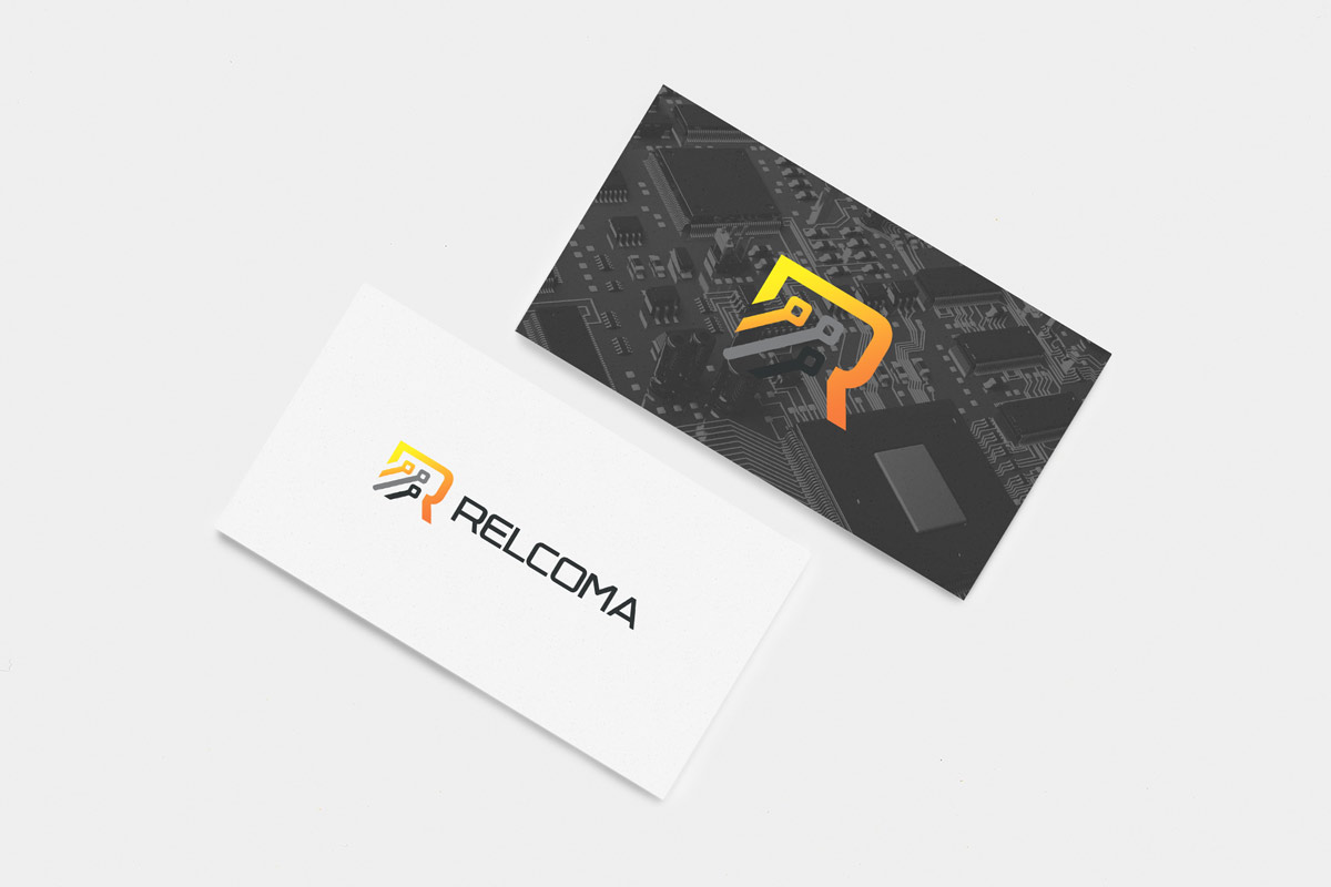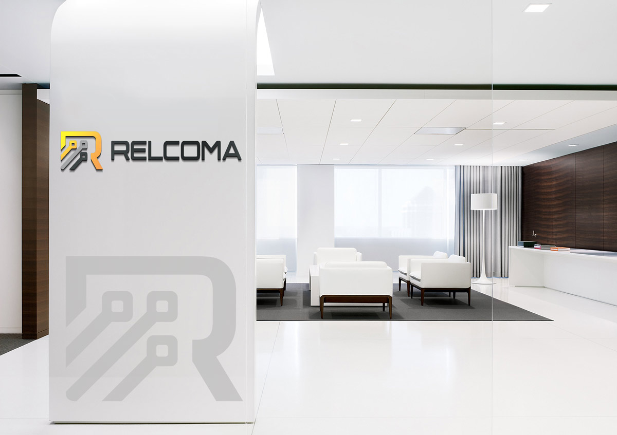 Графічна частина логотипу виконана у вигляді головної літери назви "R" і трьох електричних контактів, спрямованих по висхідній зліва направо, для відображення динаміки діяльності компанії, що дуже важливо у сфері продажів. У логотипі RELCOMA використано ущільнений шрифт, розроблений дизайнерами нашої студії. Графітовий колір логотипу відображає стабільність, лідерство та надійність компанії.