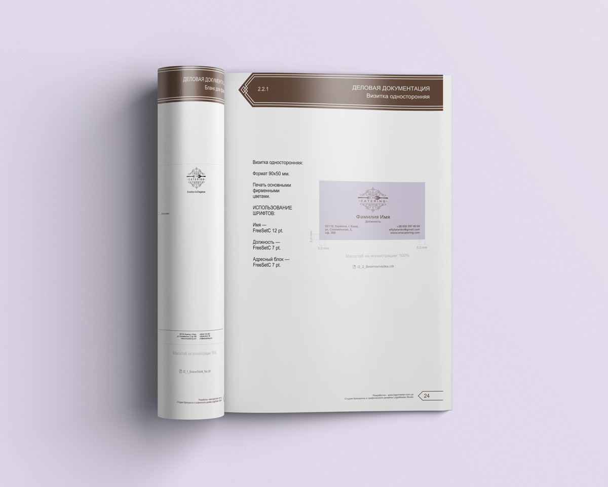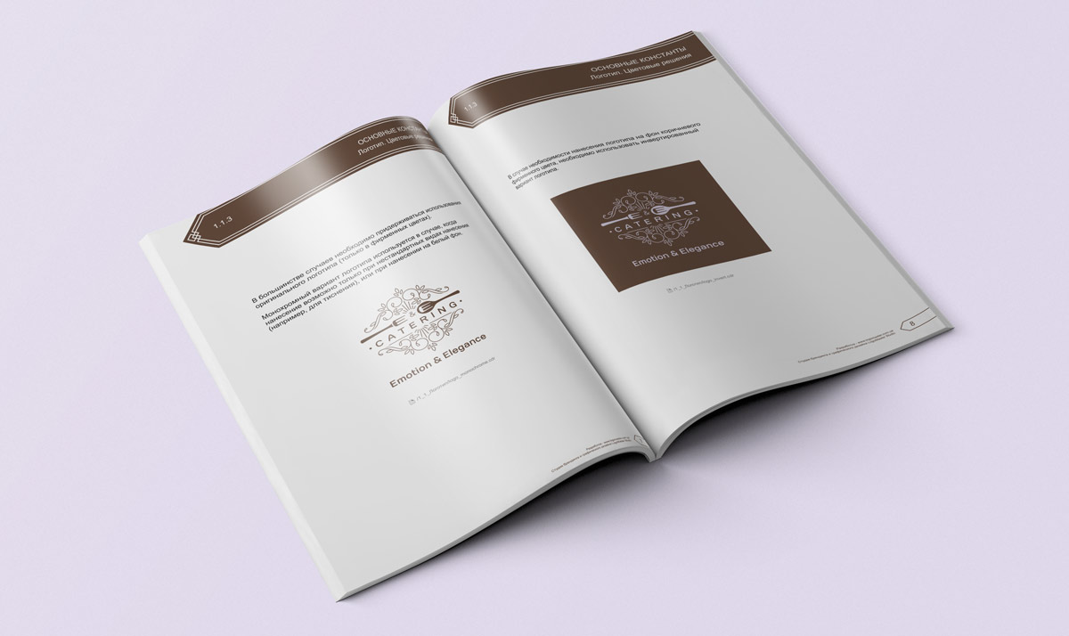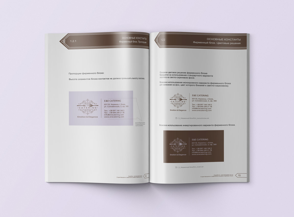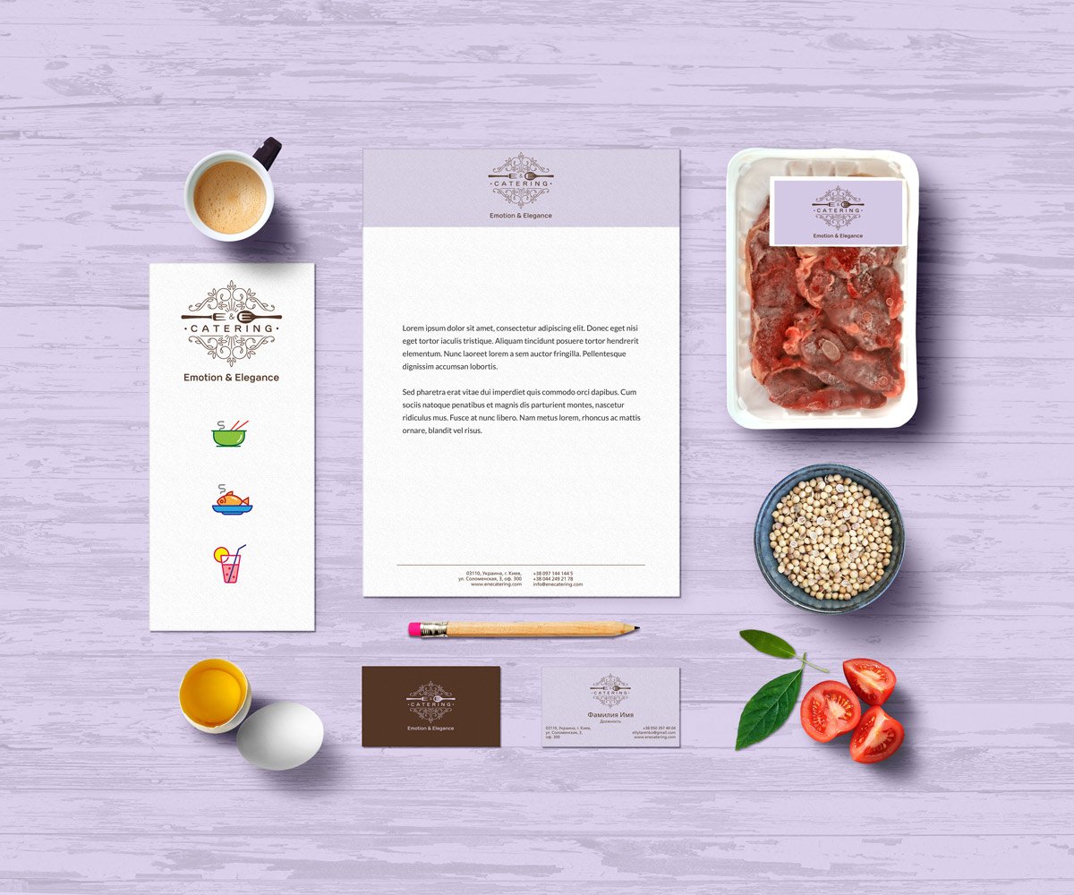 Протягом місяця було виконано завдання щодо створення та погодження бренд бука кейтерингової служби E&E Catering. Особливу увагу Замовник просив приділити опису логотипу та його нанесення на різні площини, створення фірмового стилю, з яким відвідувач зустрінеться на вивісці, в інтер'єрі закладу, кабінетних табличках, одязі персоналу та інше.