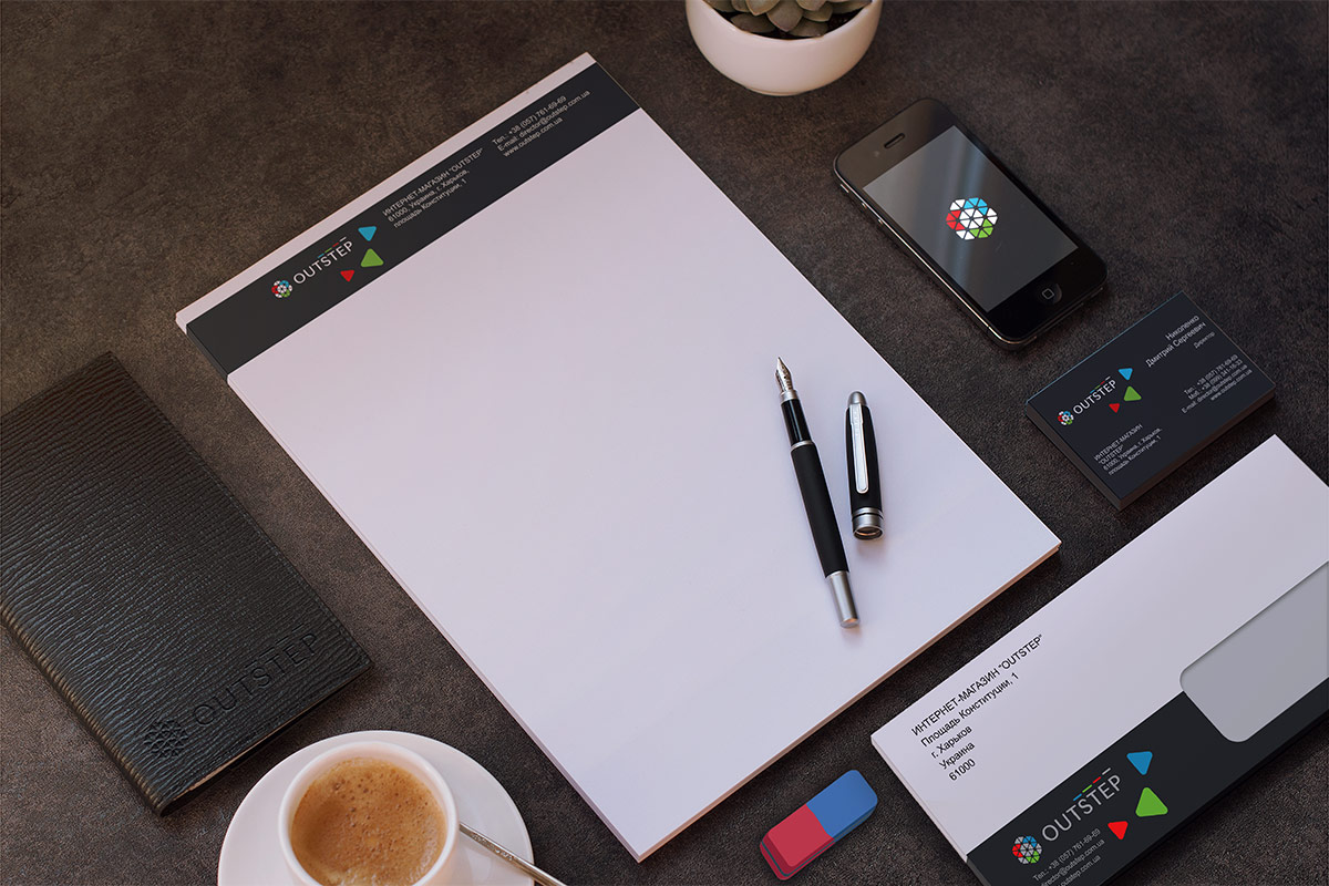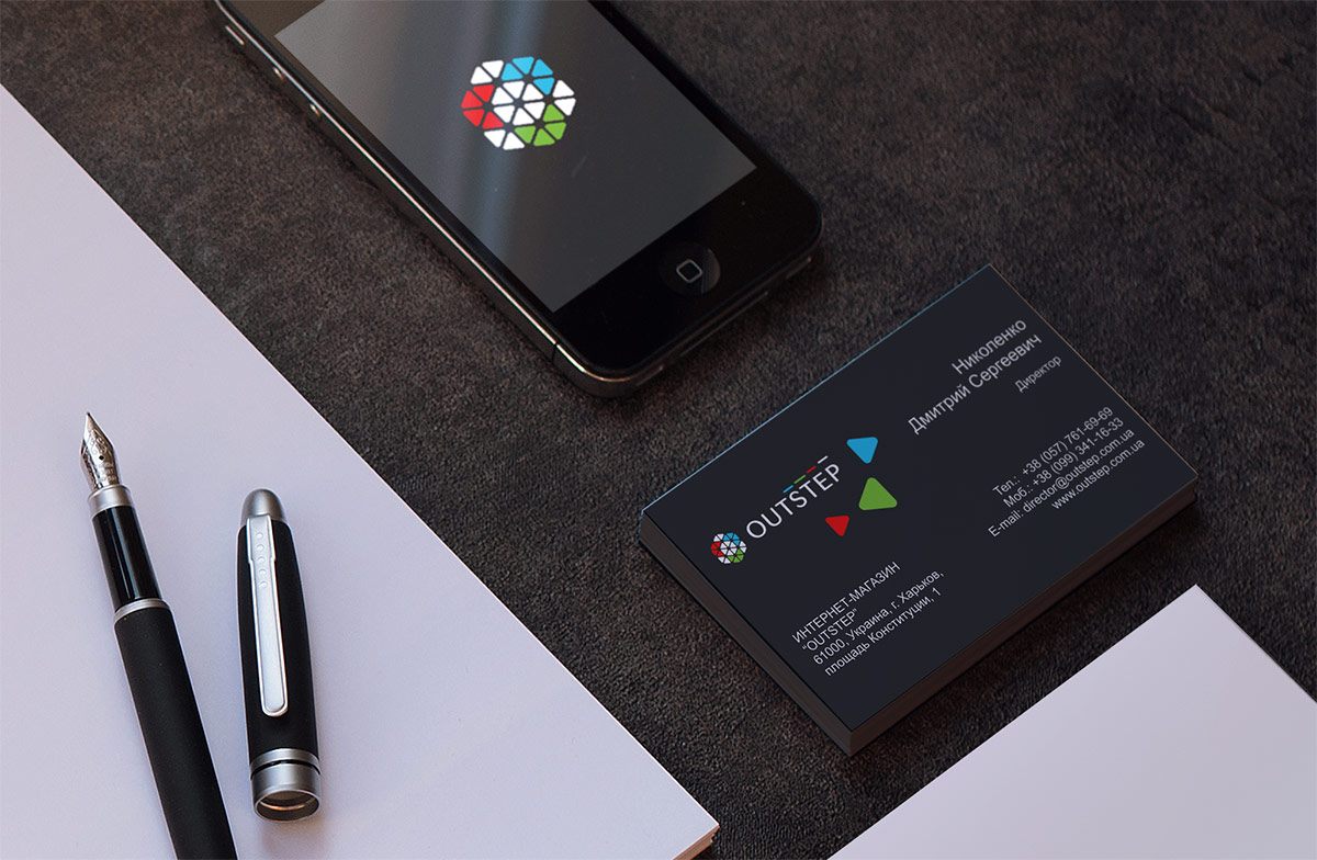 Знак розробленого логотипу виконаний у вигляді абстрактної фігури – куба. Кольорові стрілочки відбивають розширення компанії та сфер діяльності. Над назвою OUTSTEP присутні сходи, які частково передають зміст назви та говорять про постійний розвиток та розширення асортименту інтернет-магазину.