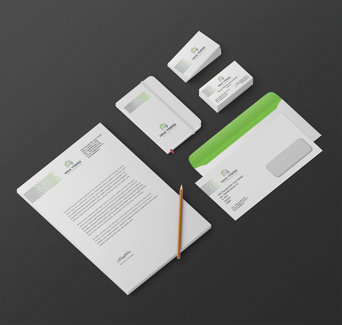 Особливу увагу хочеться приділити фірмовому стилю, який дизайнери студії пропрацювали досить ретельно. В рамках замовлення було розроблено стандартний набір документів: візитні картки, конверти, фірмовий бланк. Розроблений фірмовий стиль з елементами як маленьких квадратів (коробок) підкреслює сферу діяльності підприємства – торгівля. Основною відмінністю стилю є простота, строгість і запам'ятовуваність.