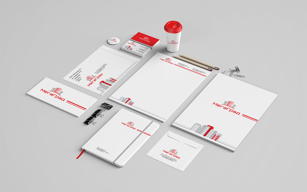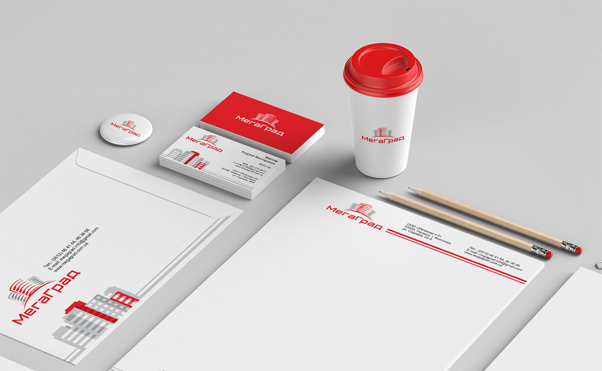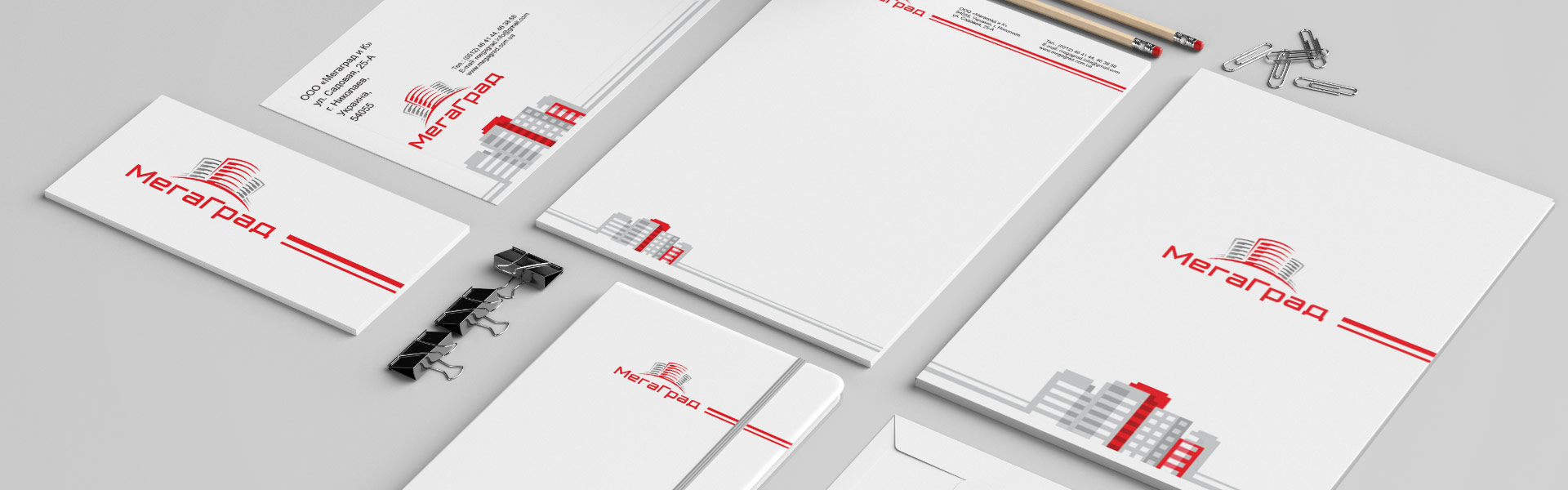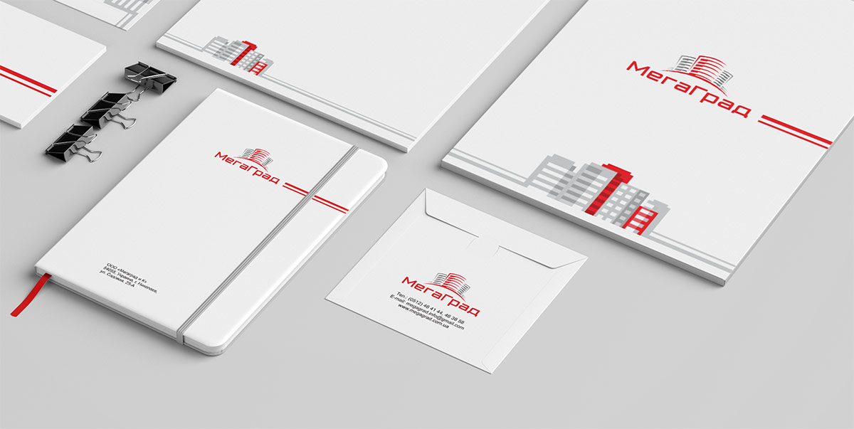 Шрифтове написання назви “МегаГрад” розроблено дизайнерами нашої студії та виконане у строгому стилі.
