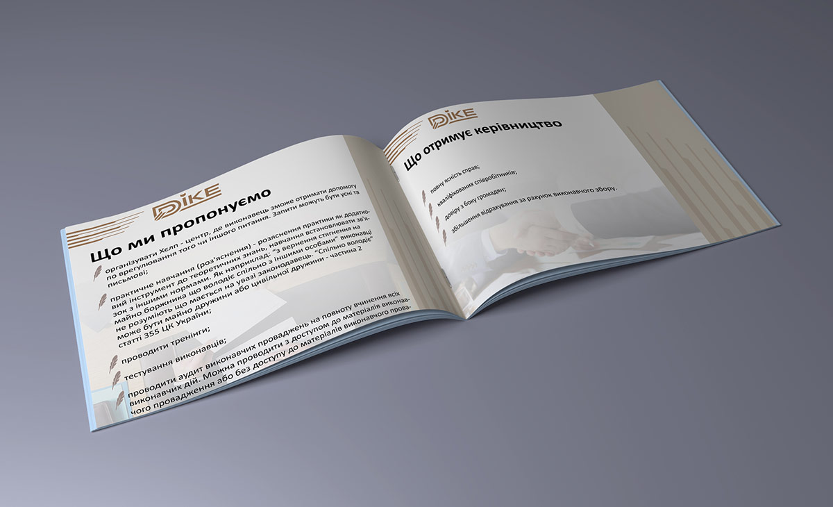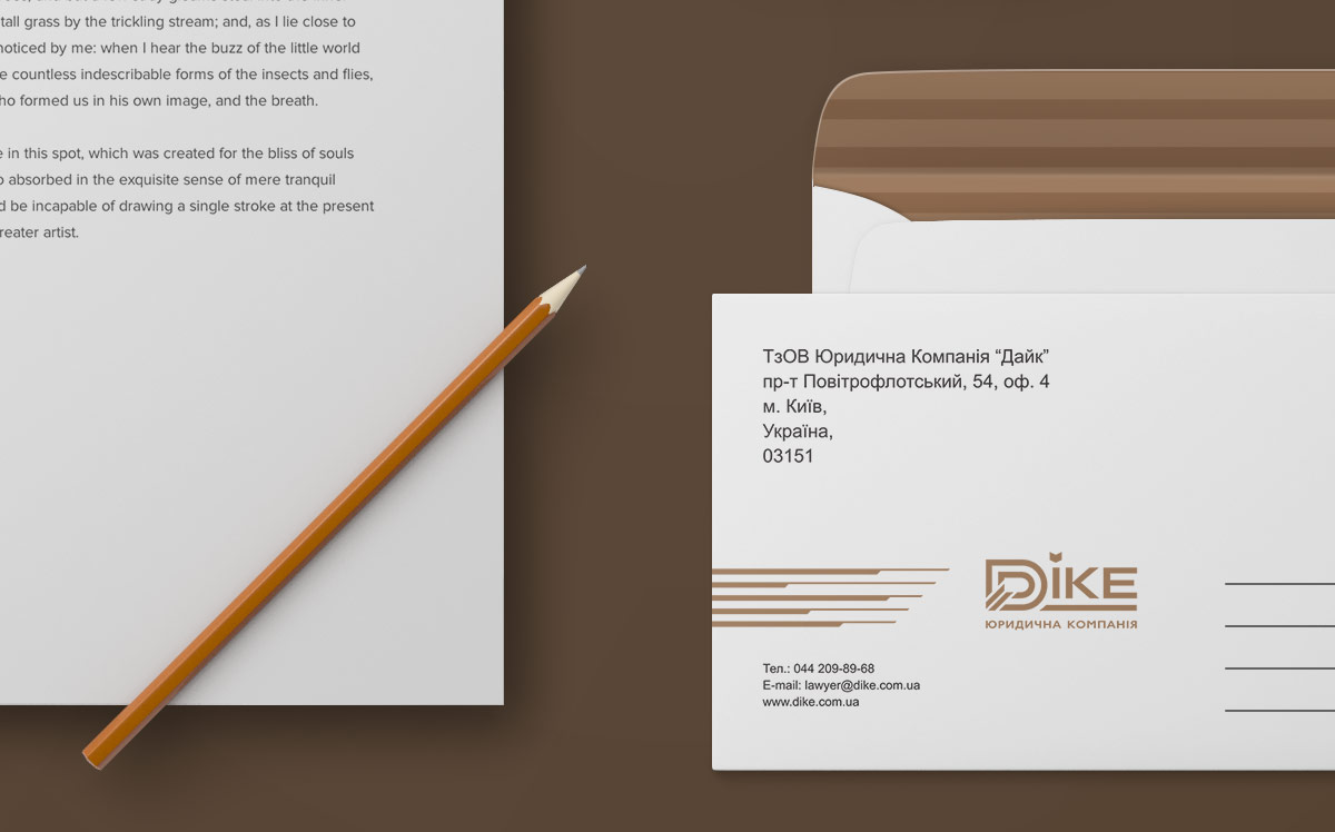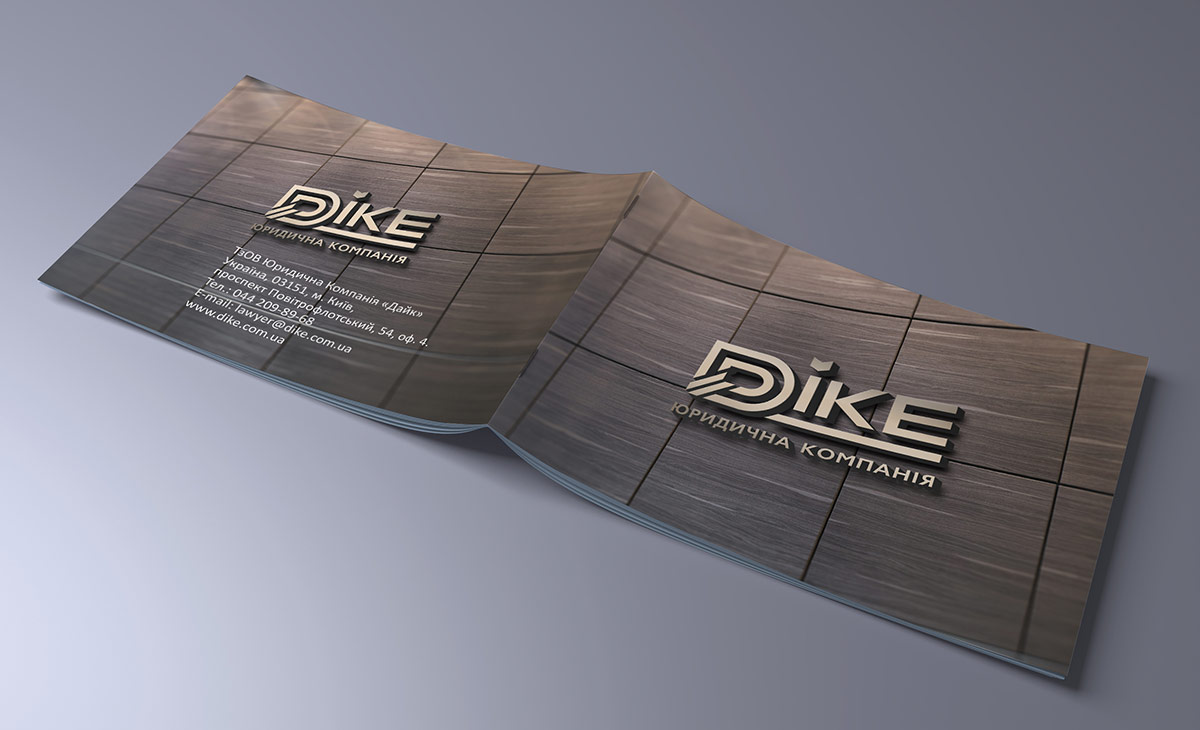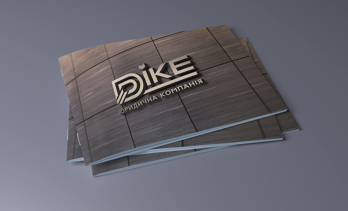 Шрифтове написання назви “DIKE” у логотипі розроблено дизайнерами нашої студії та адаптовано під загальний стиль бренду. Для розшифровки діяльності комплексу було прийнято використовувати в логотипі дескриптор “ЮРИДИЧНА КОМПАНІЯ”.