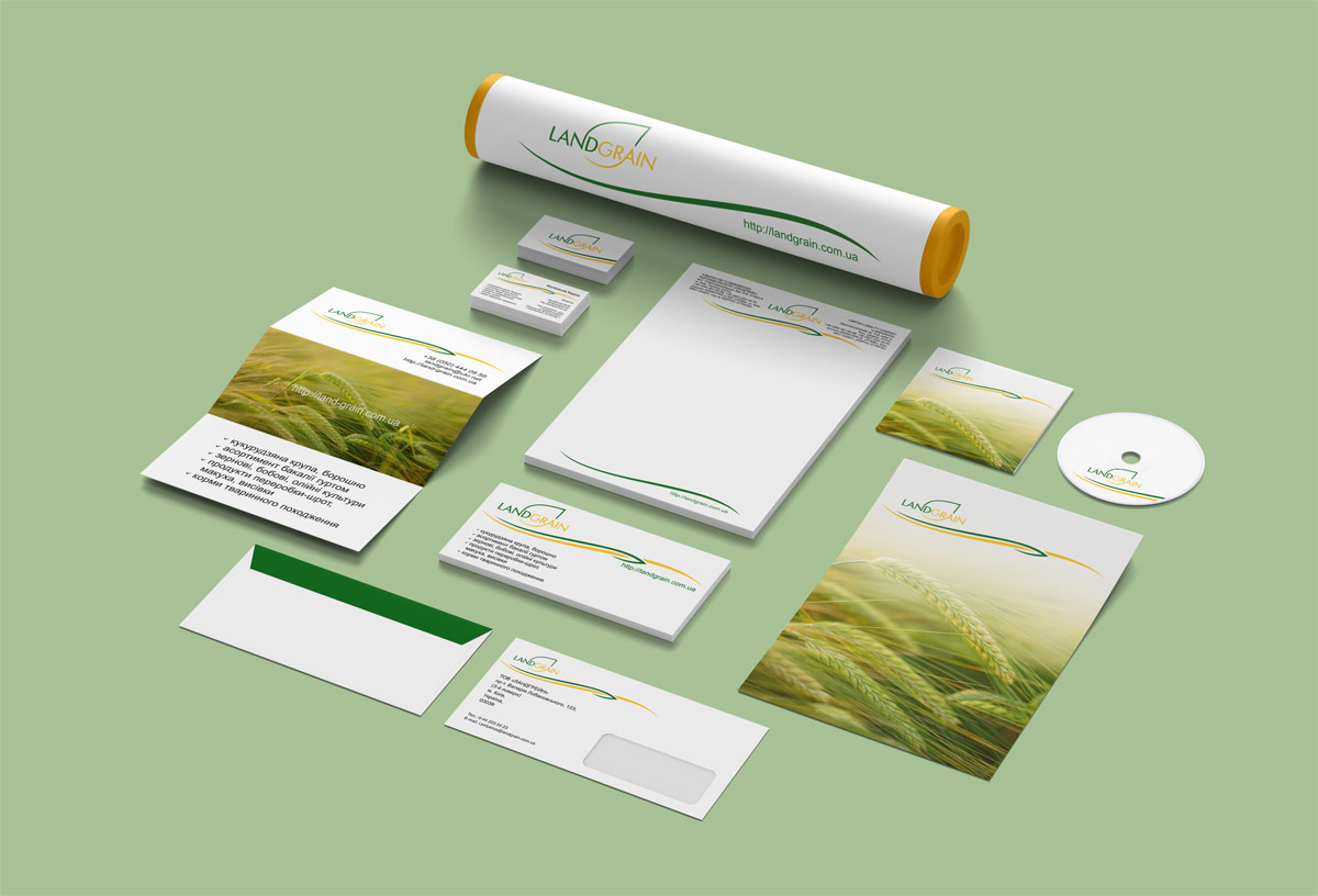 Особливу увагу хочеться приділити фірмовому стилю, який дизайнери студії пропрацювали досить ретельно. В рамках замовлення було розроблено стандартний набір документів: візитні картки, конверти, фірмовий бланк. Розроблений фірмовий стиль з елементами ліній, що перетинаються, у вигляді жовтого поля пшениці та зеленого листочка підкреслюють сферу діяльності компанії.