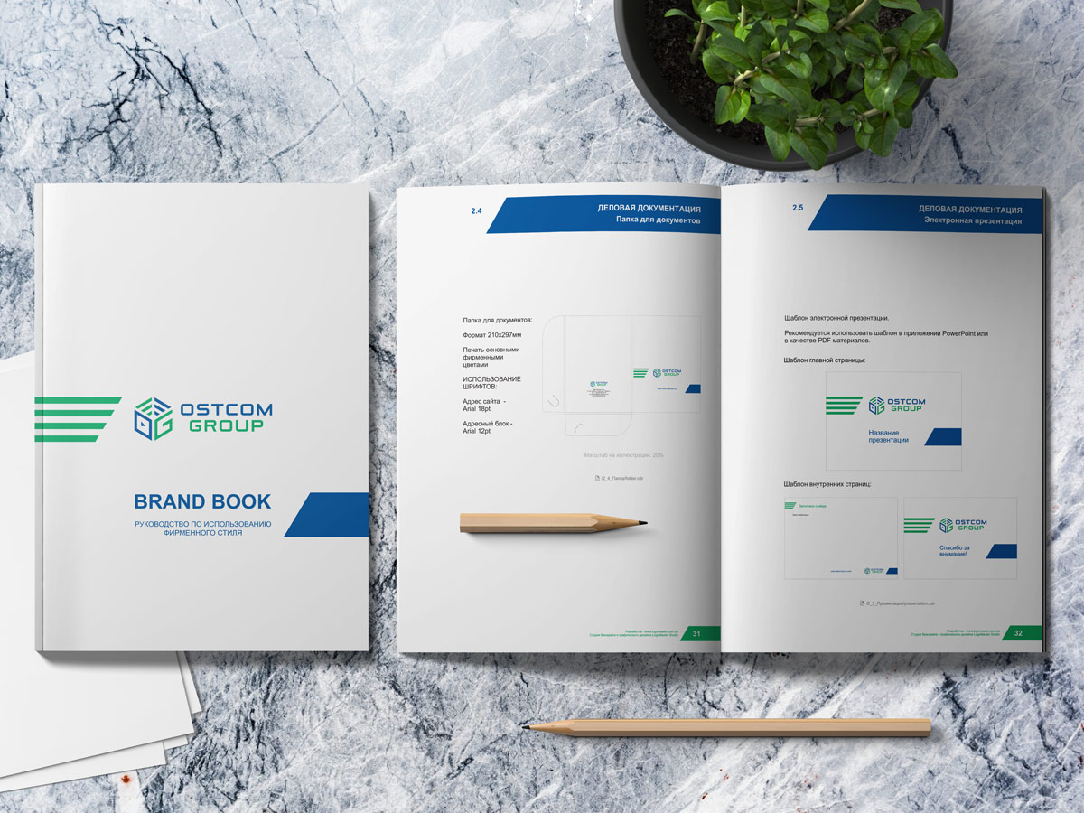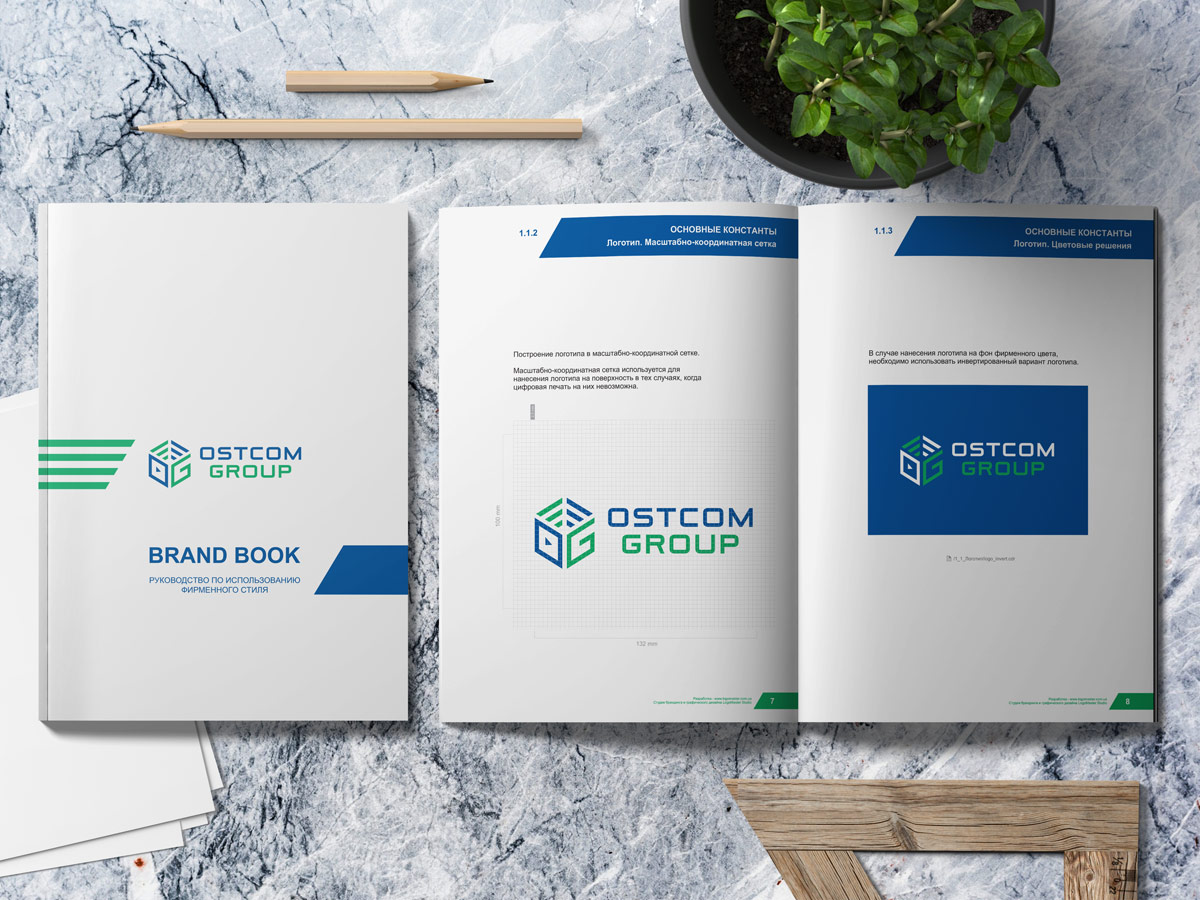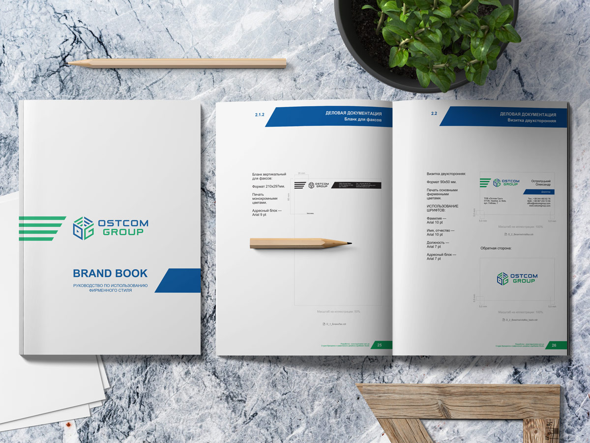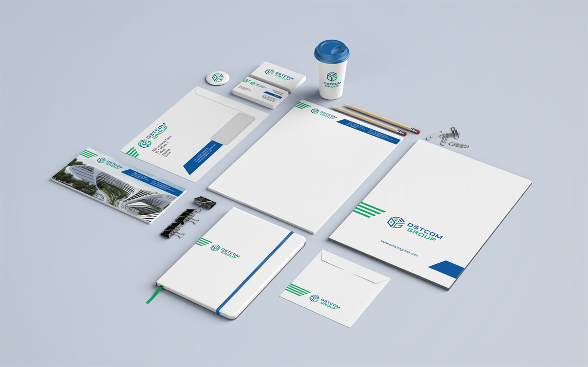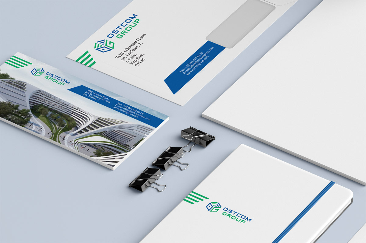 Шрифтове написання назви “OSTCOM GROUP” розроблено дизайнерами нашої студії та виконане у строгому стилі.