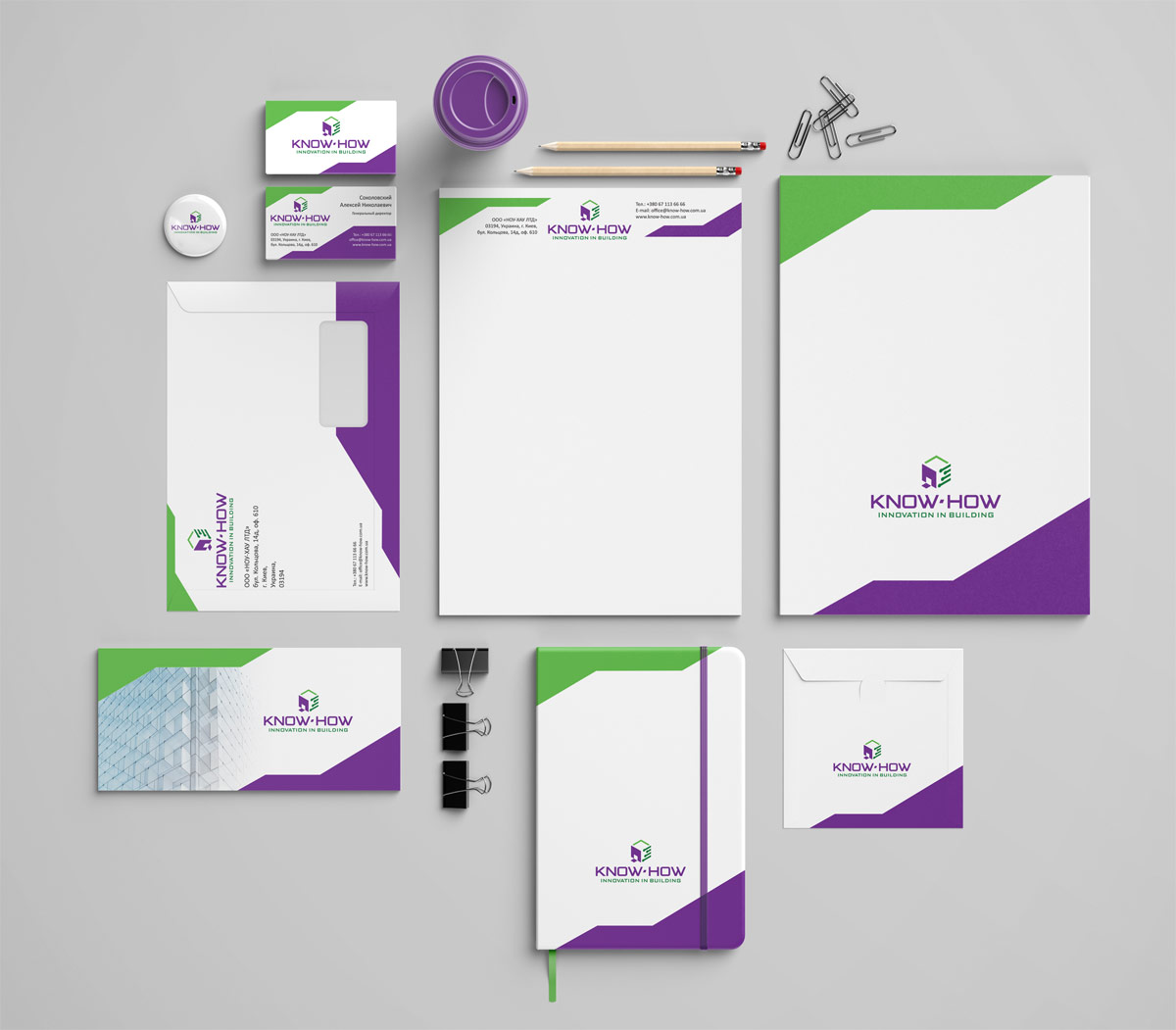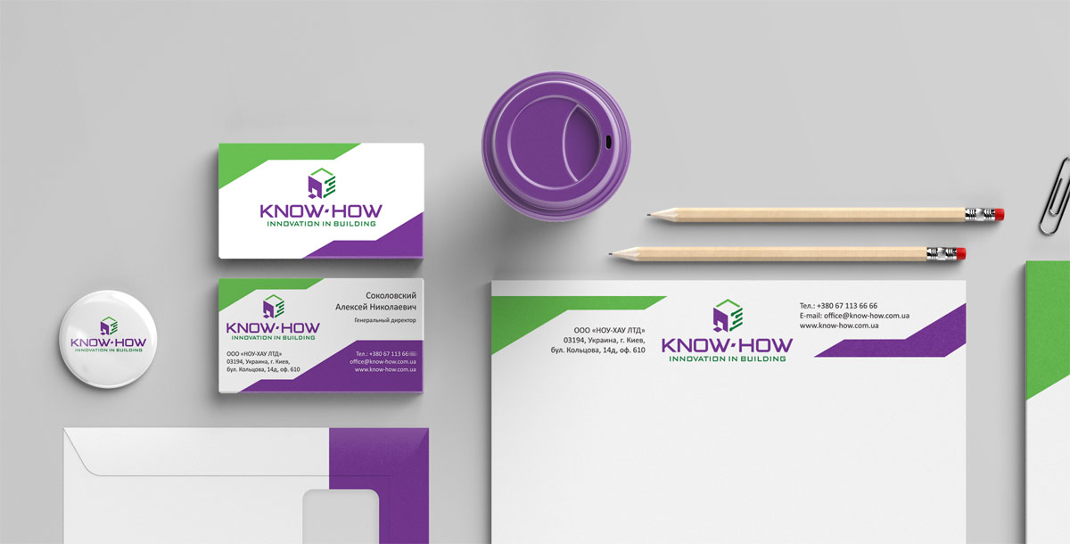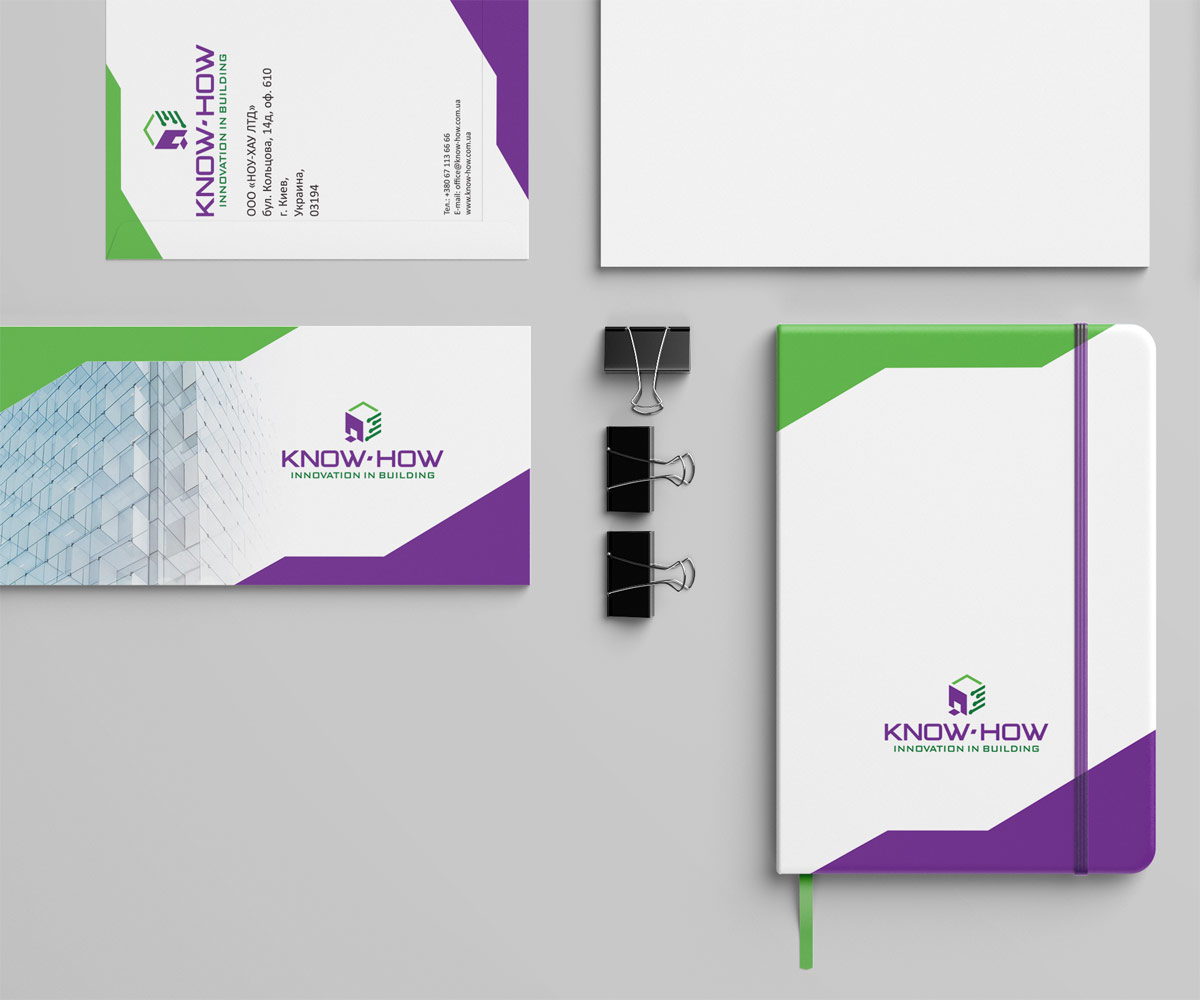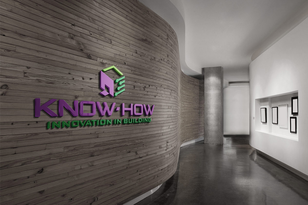 Шрифтове написання назви “KNOW-HOW” у логотипі розроблено дизайнерами нашої студії та адаптовано під загальний стиль бренду. Для розшифровки діяльності було прийнято використовувати у логотипі дескриптор "INNOVATION IN BUILDING".