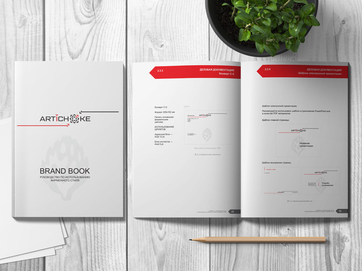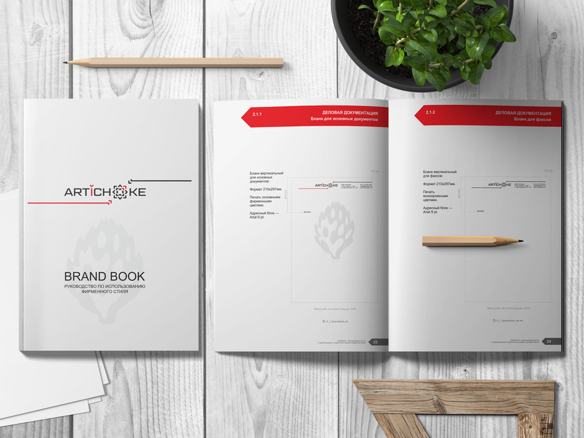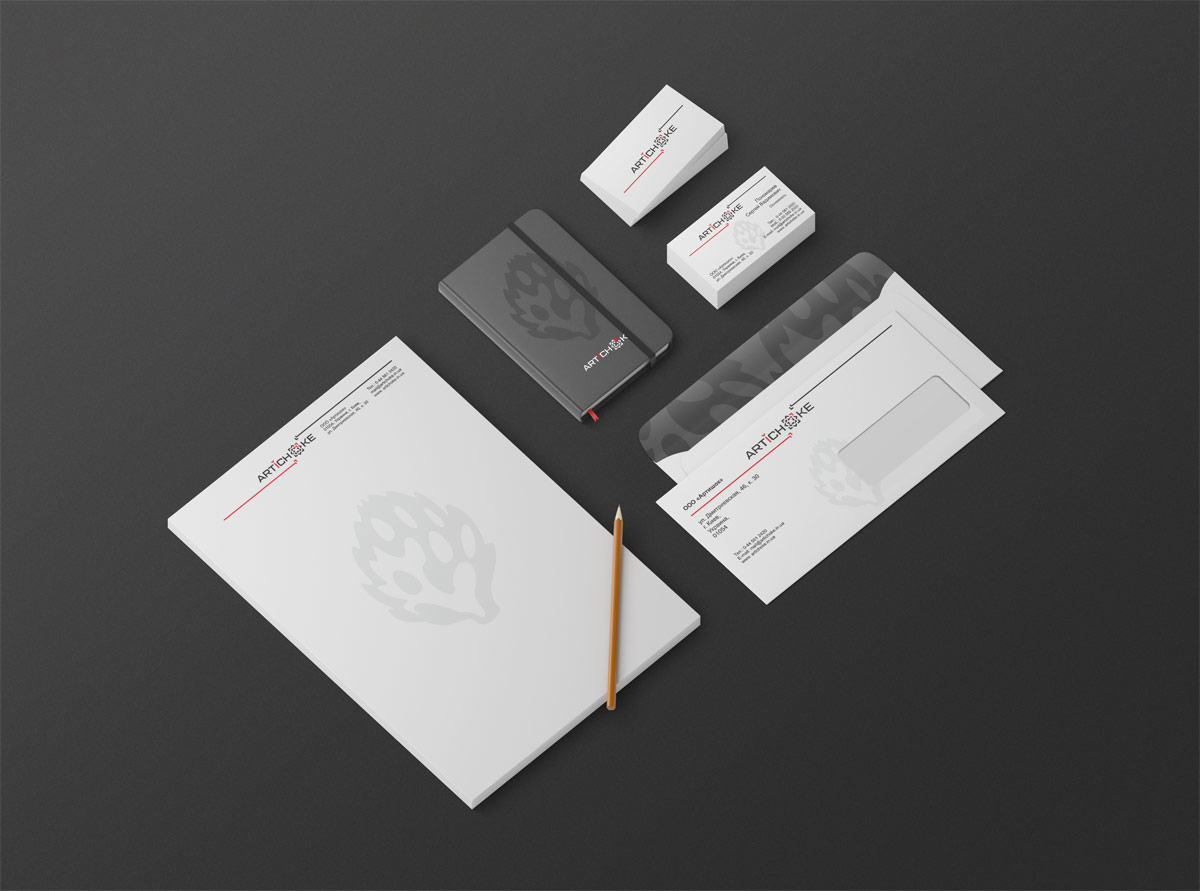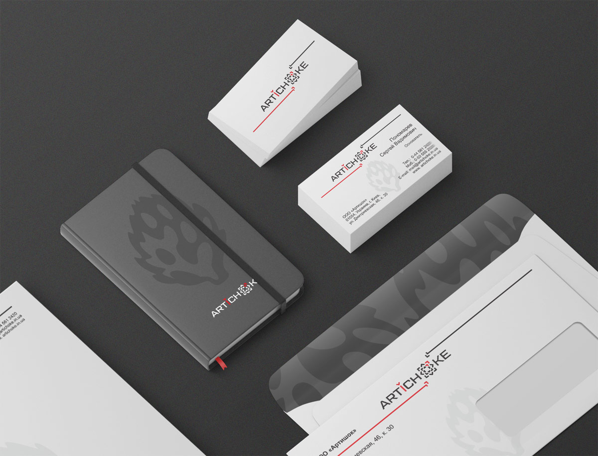 Особливу увагу хочеться приділити фірмовому стилю, який дизайнери студії пропрацювали досить ретельно. В рамках замовлення було розроблено розширений набір документів: візитні картки, конверти, фірмовий бланк, папка, шаблон презентації у PowerPoint та багато іншого. Розроблений фірмовий стиль своїми елементами (лінії зі стрілками та прозора рослина артишок) доповнює логотип, створюючи єдиний та універсальний блок інформації. Основною відмінністю стилю є простота, строгість і запам'ятовуваність.