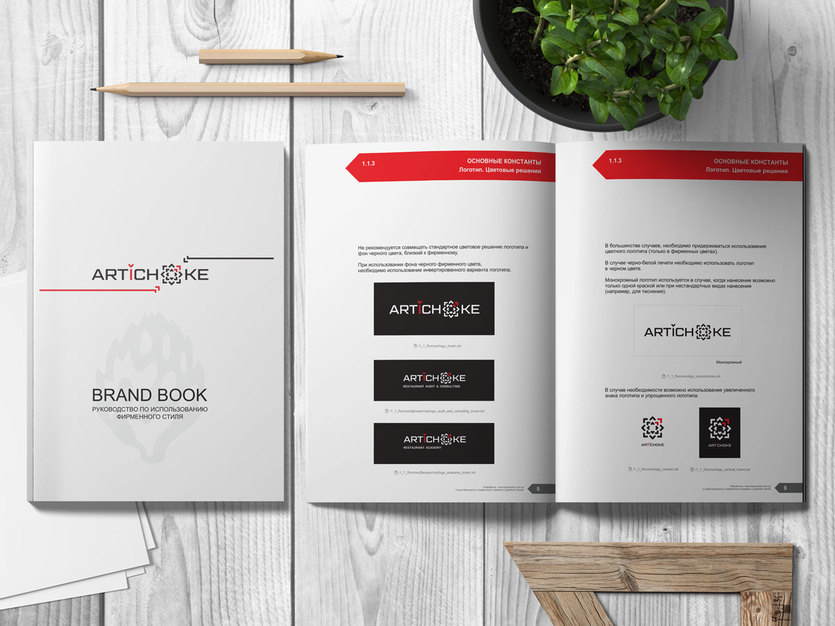 Шрифтове написання назви у логотипі “ARTiCHOKE” розроблено дизайнерами нашої студії та адаптовано під загальний стиль бренду. Для розшифровки діяльності було прийнято використовувати у логотипі дескриптор “RESTAURANT AUDIT & CONSULTING/ACADEMY”.