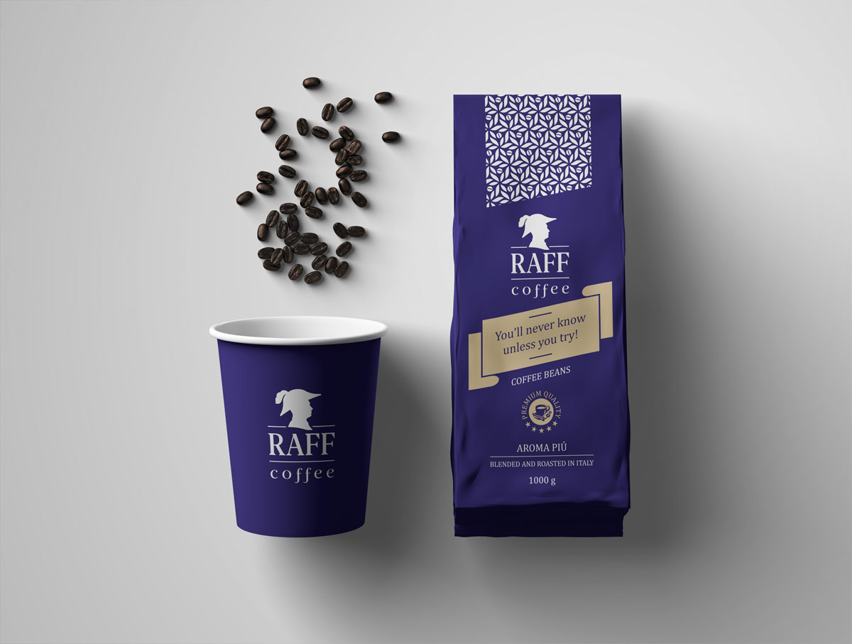 Шрифтове написання назви “RAFF Coffee” у логотипі розроблено дизайнерами нашої студії та адаптовано під загальний стиль бренду.