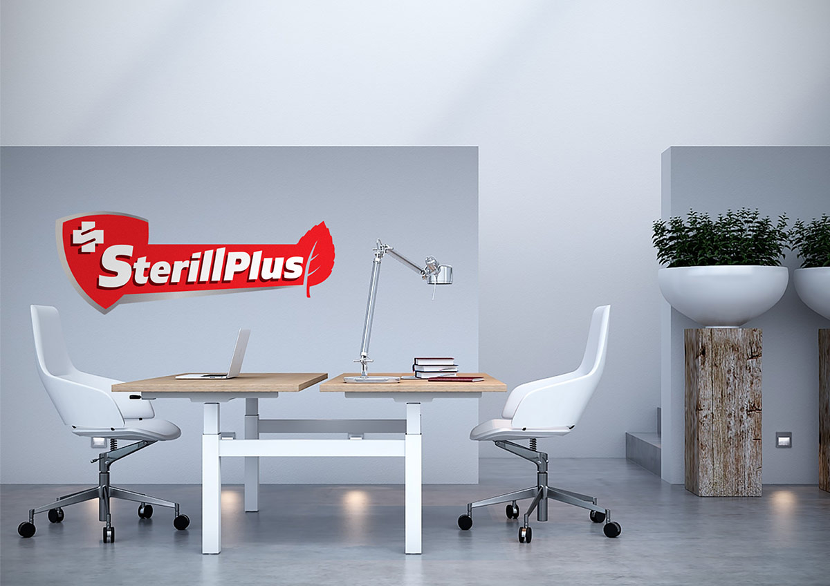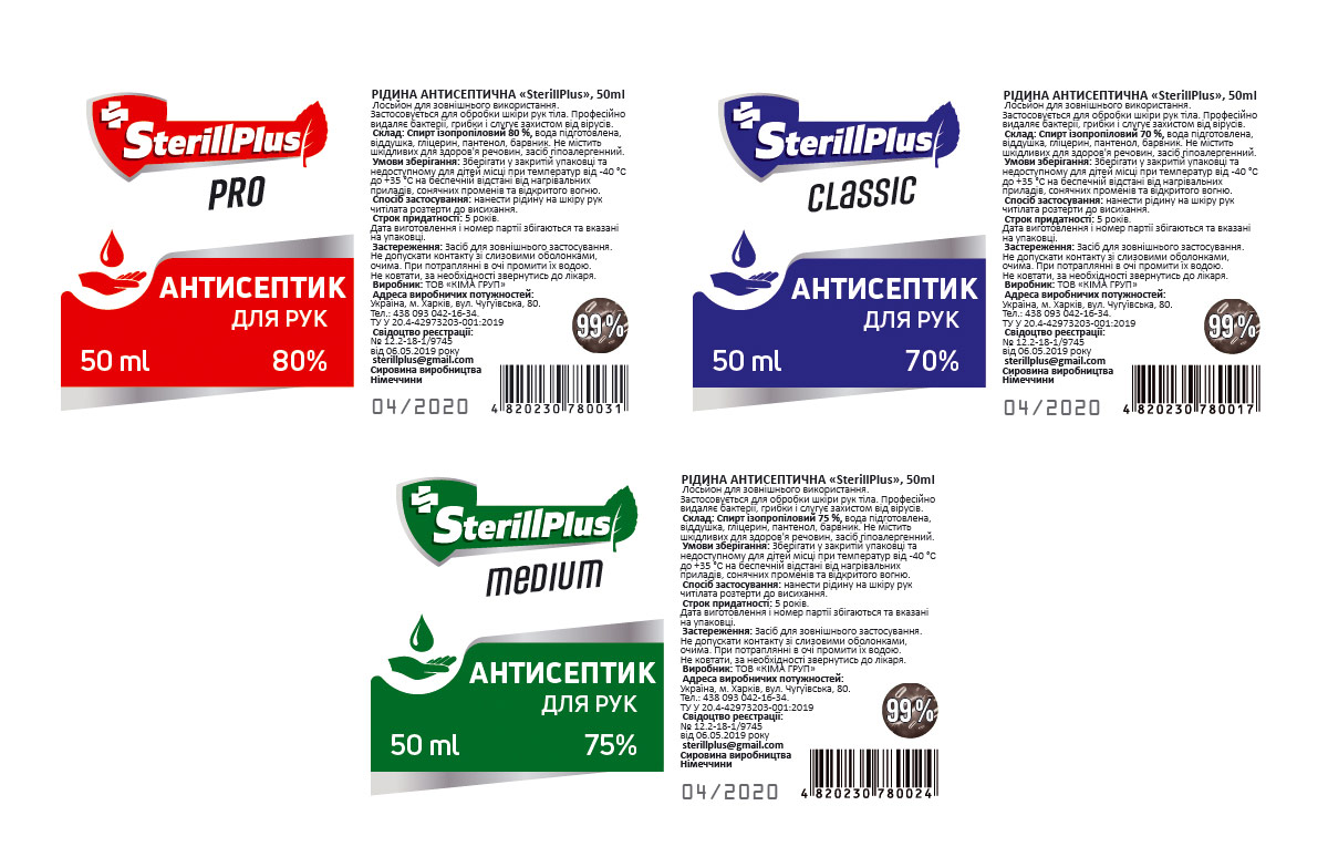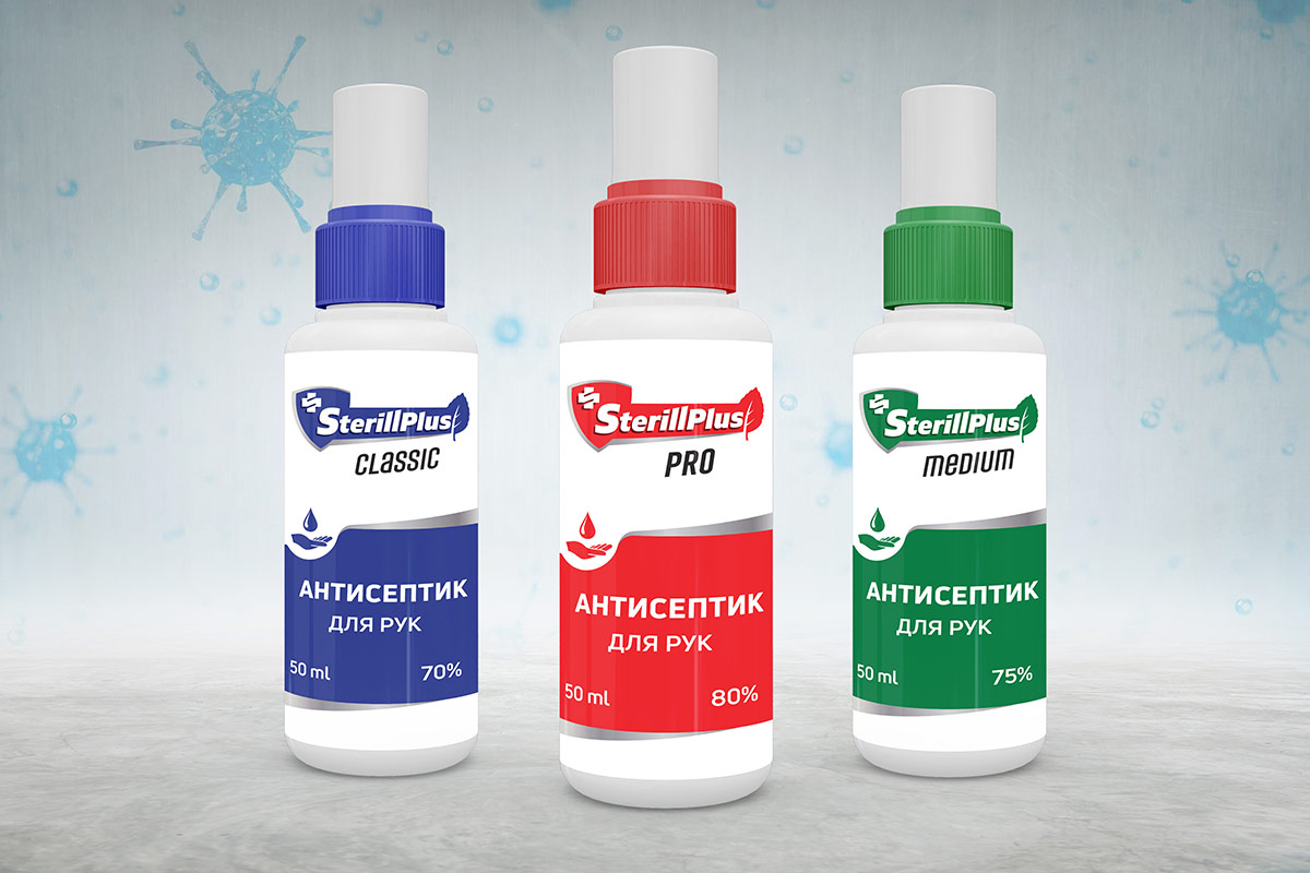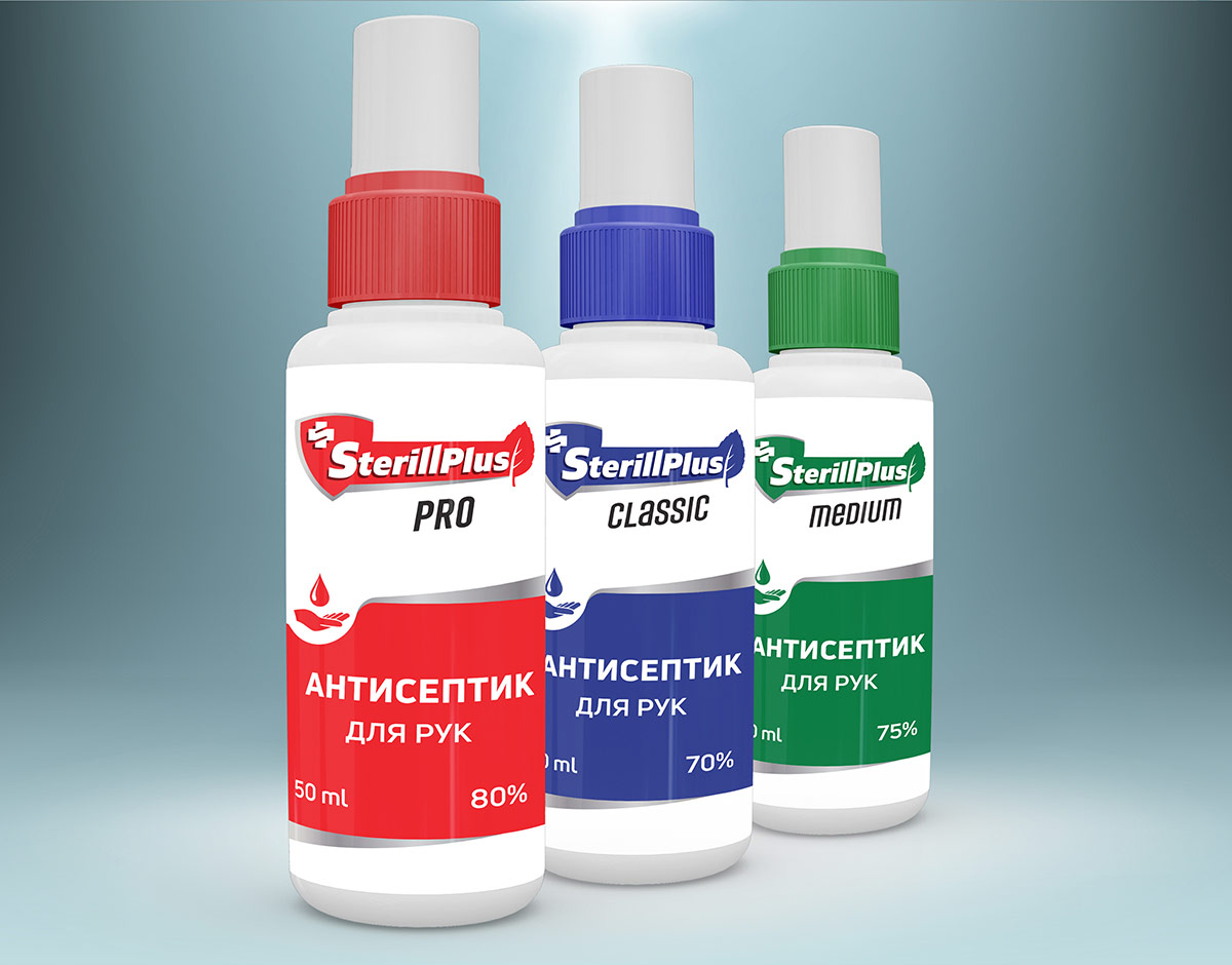 Після детального обговорення різних варіантів Замовник затвердив наведений нижче логотип, що складається зі щита (захист), хрестика (тематика медицини) та листка (натуральний склад антисептика) та шрифтового написання назви “SterillPlus” розробленої дизайнерами нашої студії. /p>