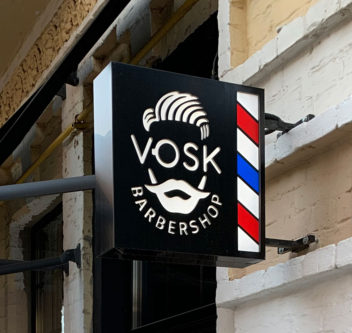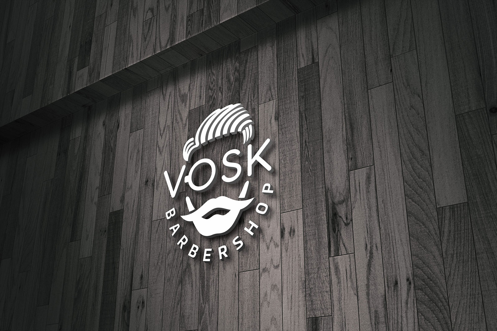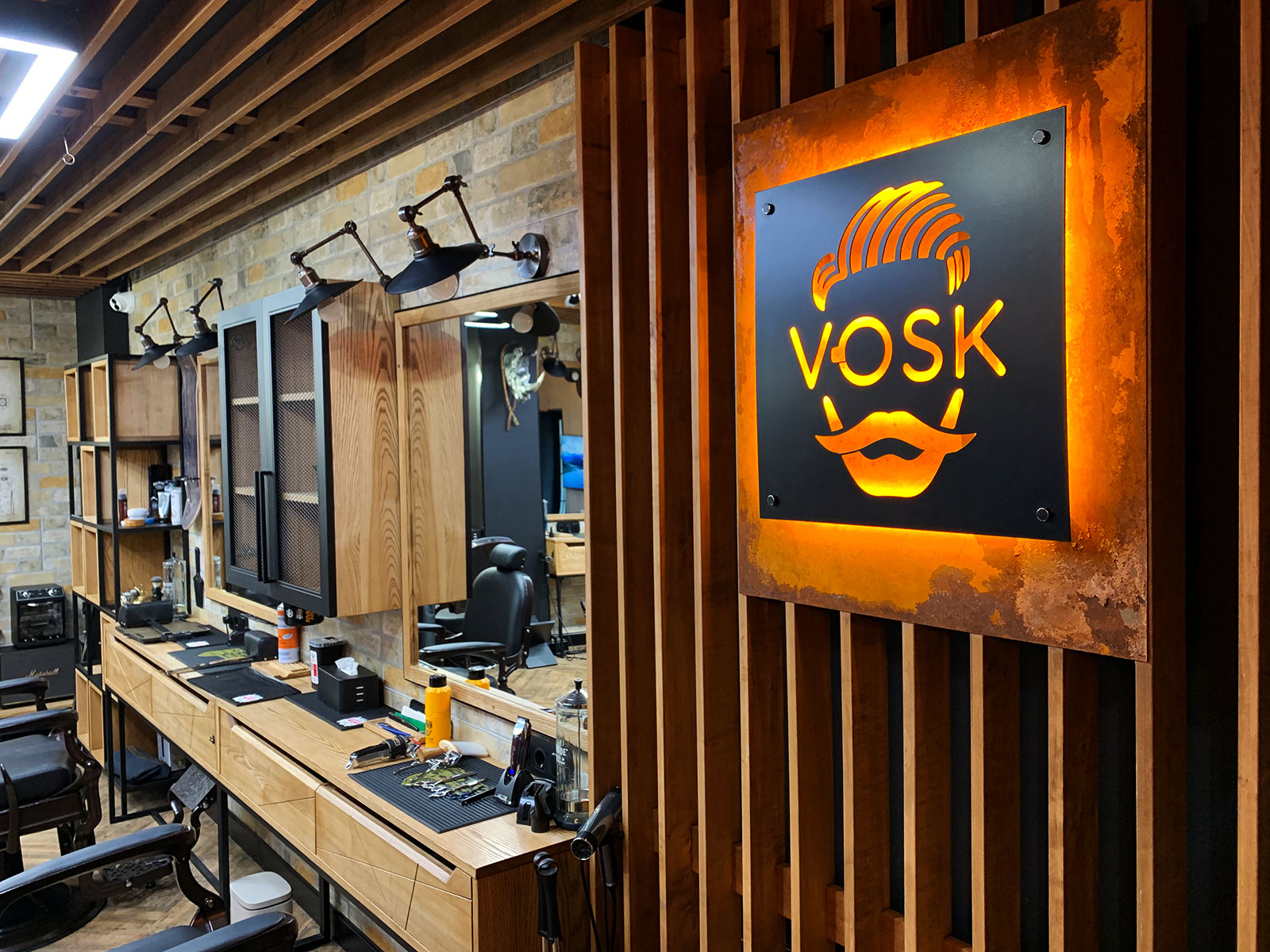 Шрифтове написання назви “VOSK” у логотипі розроблено дизайнерами нашої студії та адаптовано під загальний стиль. Для розшифровки діяльності було використано в логотипі дескриптор “BARBERSHOP”.