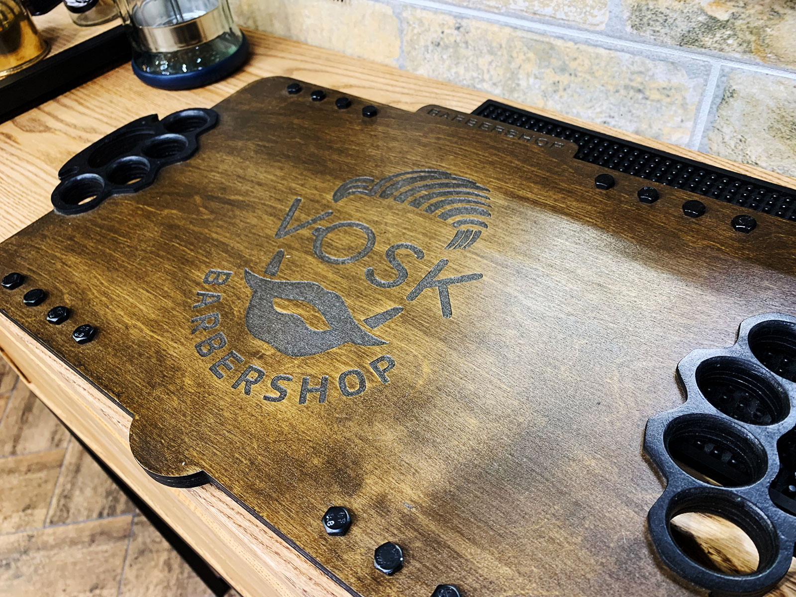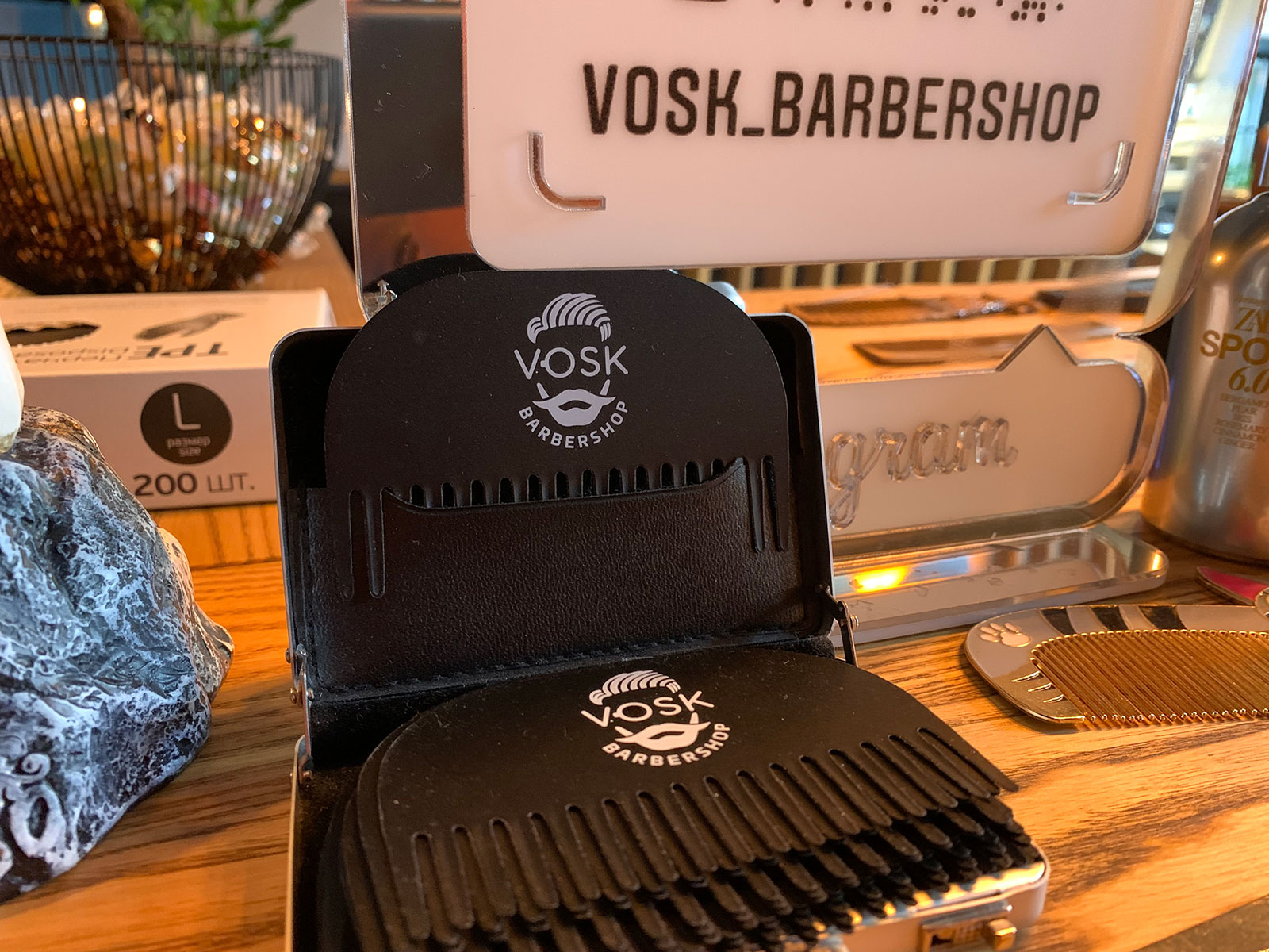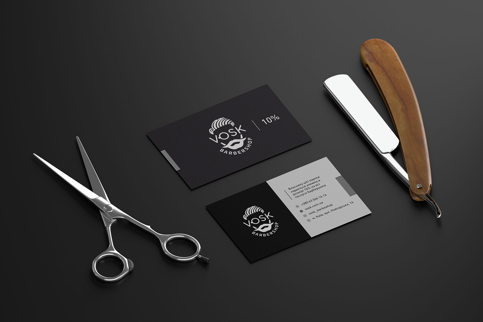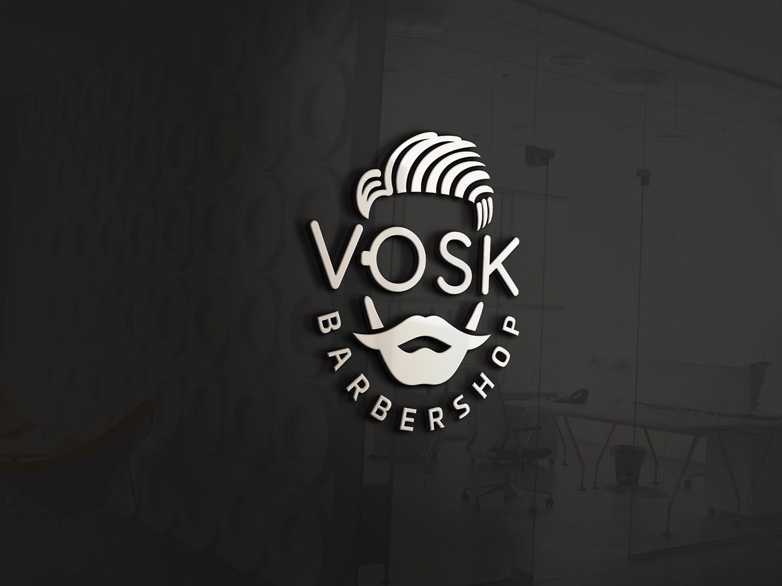 Шрифтове написання назви “VOSK” у логотипі розроблено дизайнерами нашої студії та адаптовано під загальний стиль. Для розшифровки діяльності було використано в логотипі дескриптор “BARBERSHOP”.