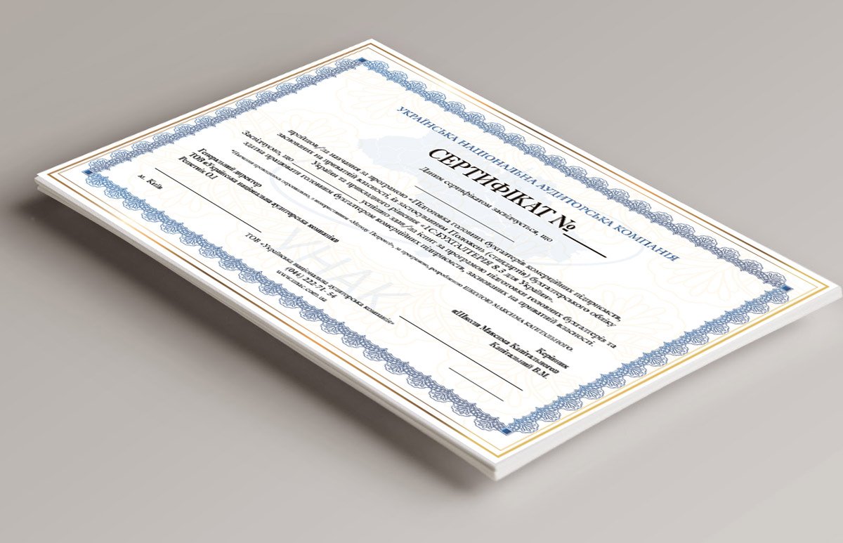 Розробка дизайну сертифікату для Української Національної Аудиторської Компанії (Україна). Компанія УНАК спеціалізується на наданні послуг в області: бухгалтерського обліку, фінансового аналізу, податкового консультування, реєстрації/ліквідації підприємств та багато іншого. Це команда досвідчених фахівців, яка знає бухгалтерський облік, любить бухгалтерський облік, щодня удосконалює свої знання з огляду на професійні вимоги.