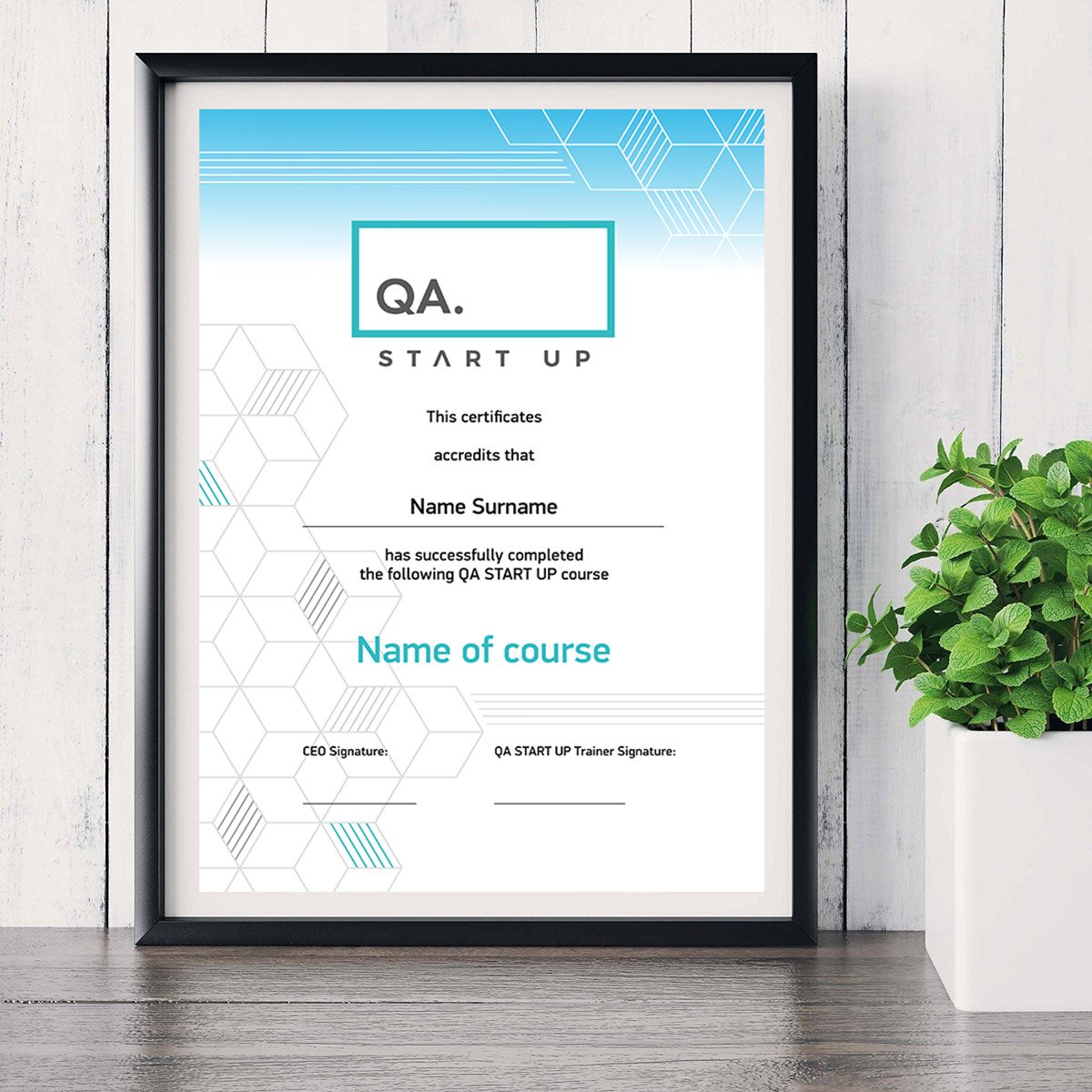 Розробка дизайну сертифікату для QA Start Up (Україна) – навчальний центр інформаційних технологій, в якому теоретичні знання підкріплюються реальними проектними завданнями. QA Start Up - вузькоспрямований навчальний центр, який спеціалізується на випуску спеціалістів напряму "Тестування програмного забезпечення". Закінчивши успішно наш навчальний центр, можна сміливо претендувати на позицію Junior чи Middle QA/Test Engineer.