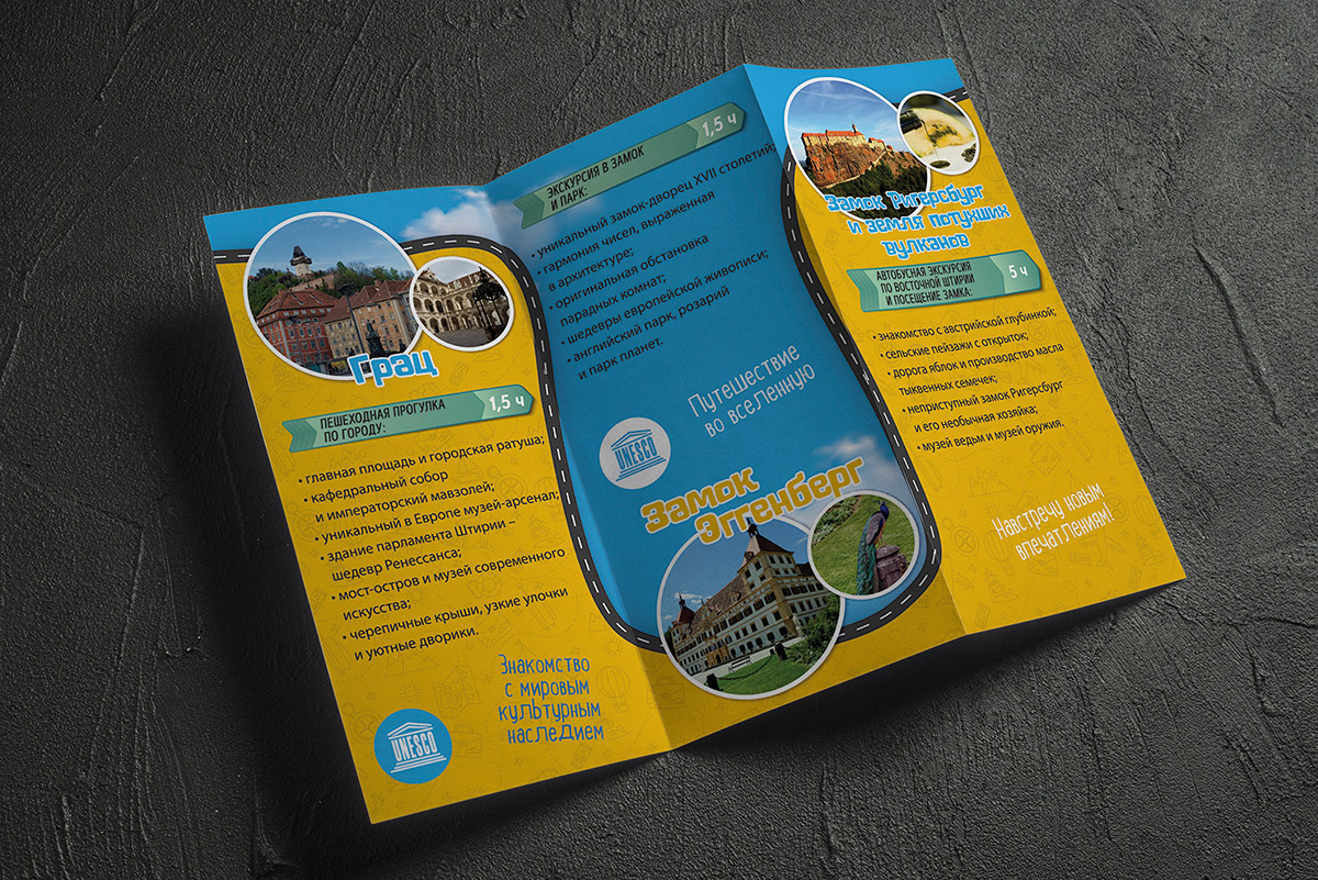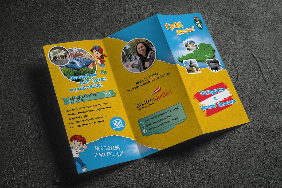 Розробка дизайну та верстка рекламного ліфлету для ліцензованого гіда по Австрії. Наше завдання полягало в тому, щоб представити послуги гіда у простій, красивій, зручній для розуміння та формі, що продає.