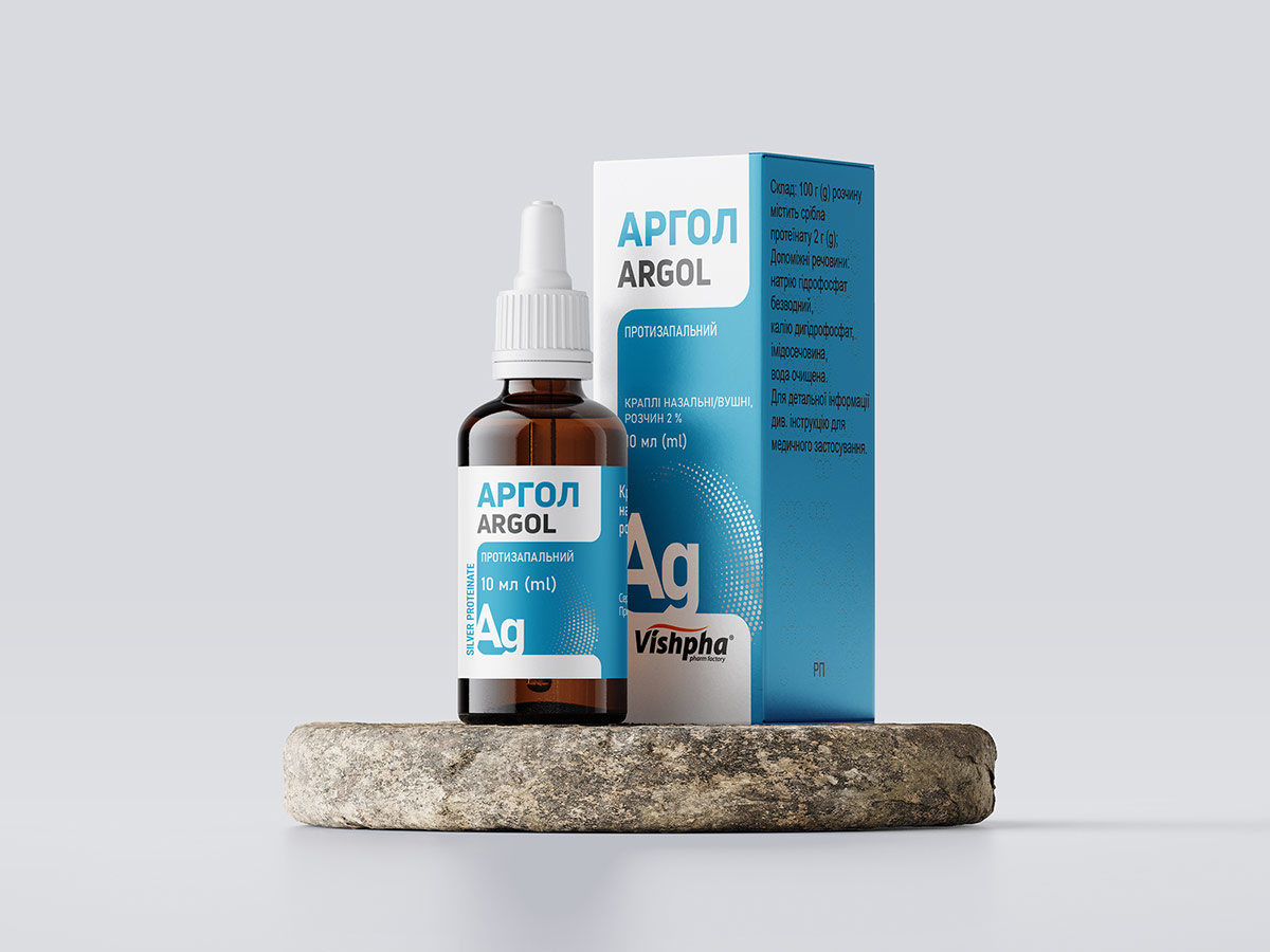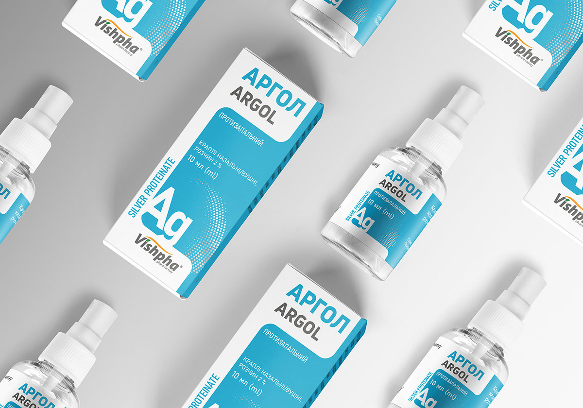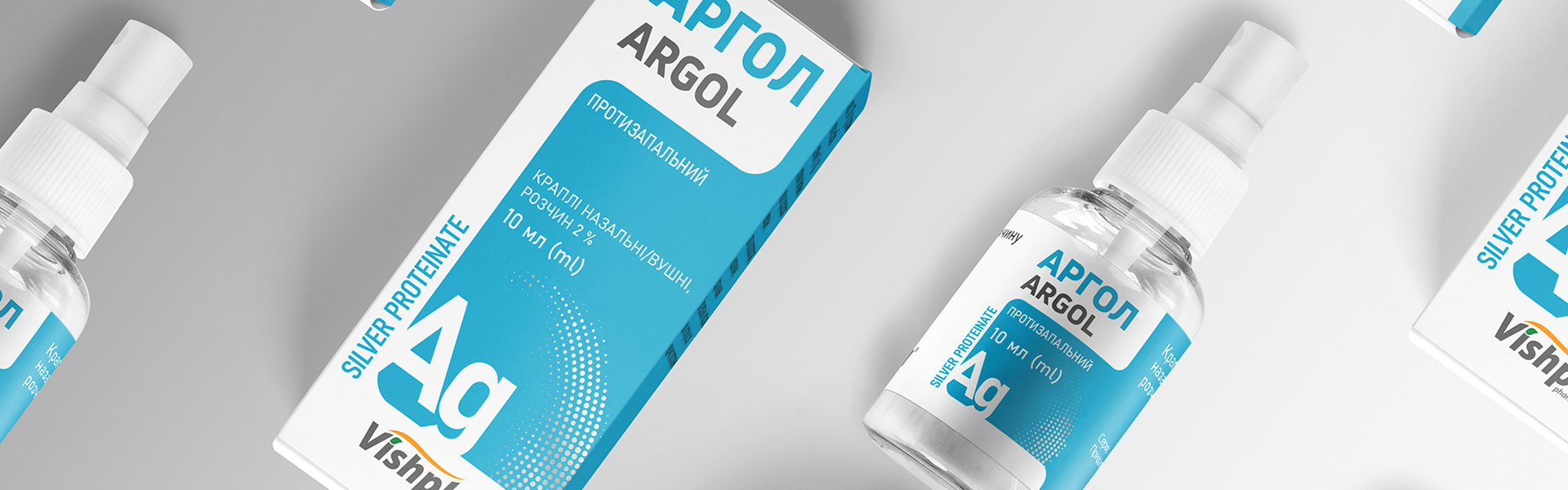 До нашої студії звернулася Житомирська фармацевтична фабрика Vishpha® (Україна), вітчизняний виробник лікарських препаратів, за розробкою дизайну упаковки та етикетки для ТМ АРГОЛ – природний рослинний препарат із широким спектром дії. Він має сприятливу дію при захворюваннях верхніх дихальних шляхів, при ангіні та гортані. Ефективний при застуді та грипі, знімає біль у м'язах та суглобах.