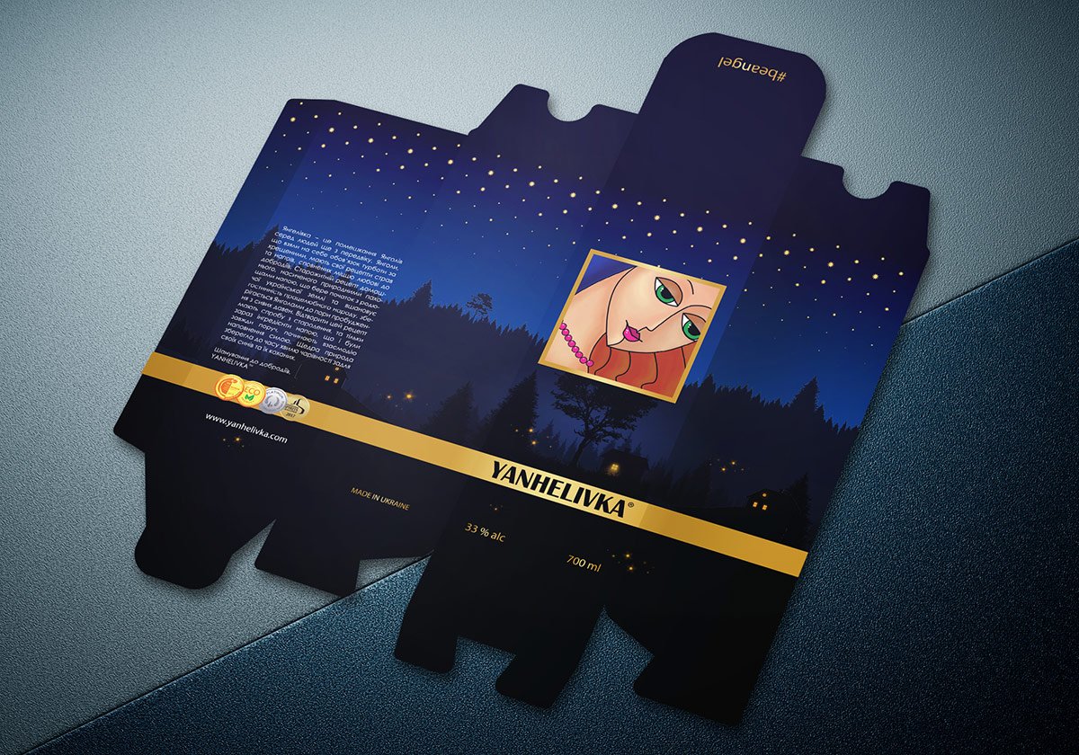 Розробка дизайну упаковки коробки «YANHELIVKA» була зроблена на основі дизайну пляшки та сайту замовника. Назва походить від слова Ангел. Старовинний рецепт домашнього, насиченого природними ароматами напою, бере початок із родючої української землі та шанує гостинність працьовитого народу з давніх-давен.