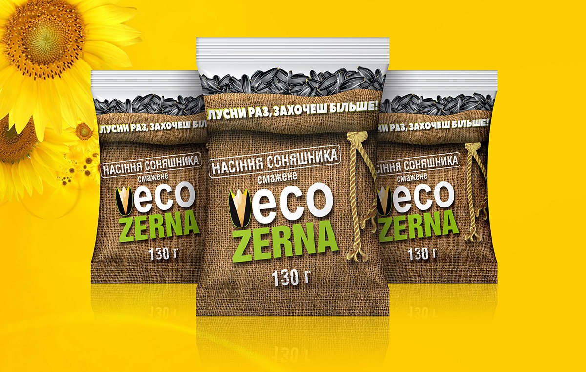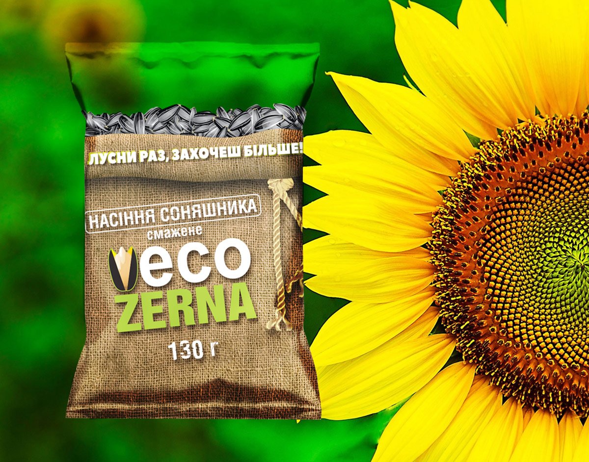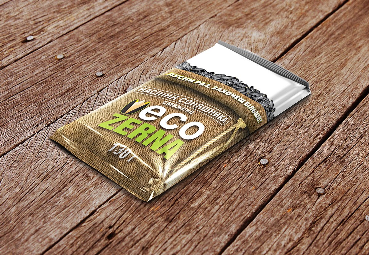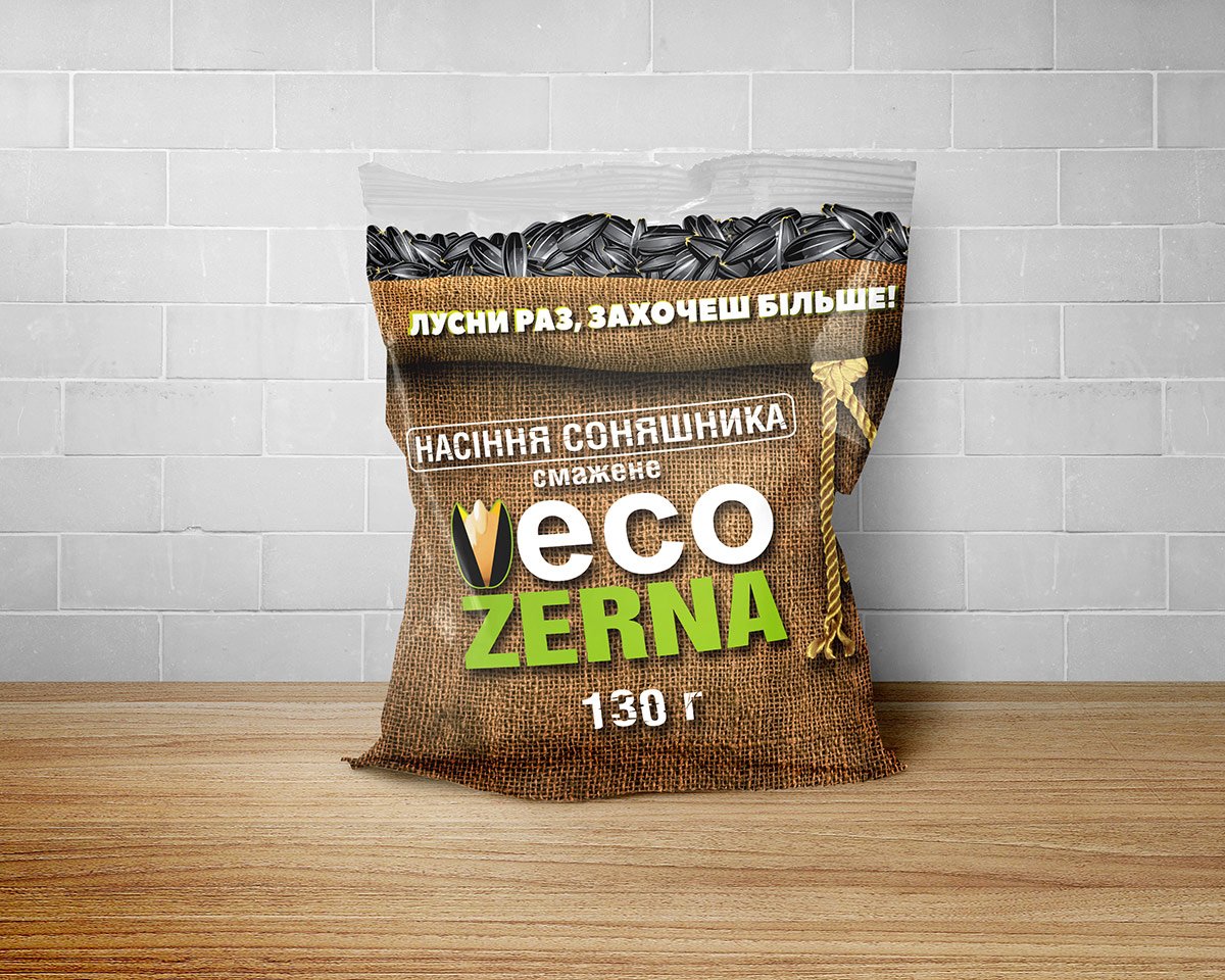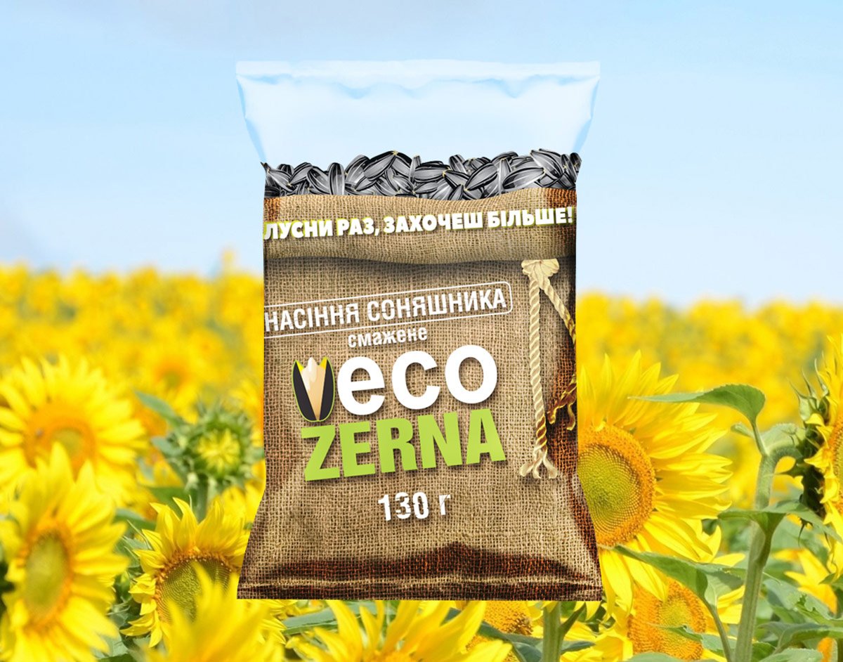 Фахівцям студії дизайну LogoMaster було поставлено завдання розробити дизайн упаковки смаженого насіння TM «ECO ZERNA» (Україна). Концепція упаковки повинна підкреслити виняткову натуральність та відмінний смак продукту.