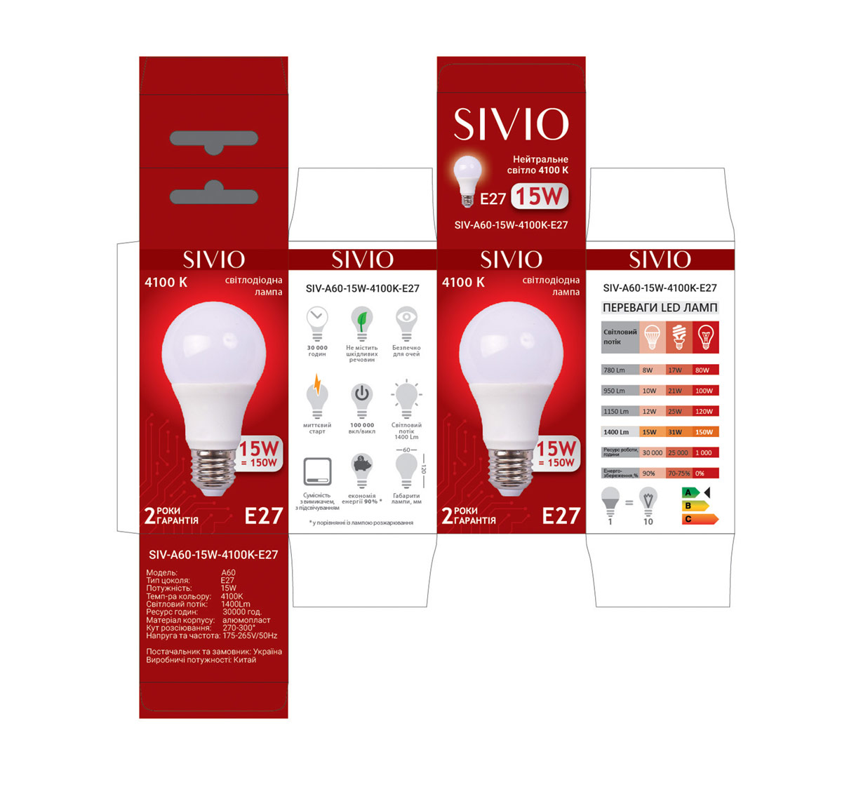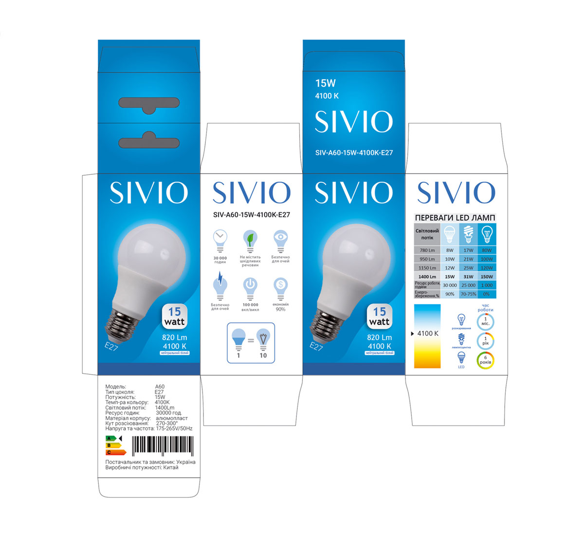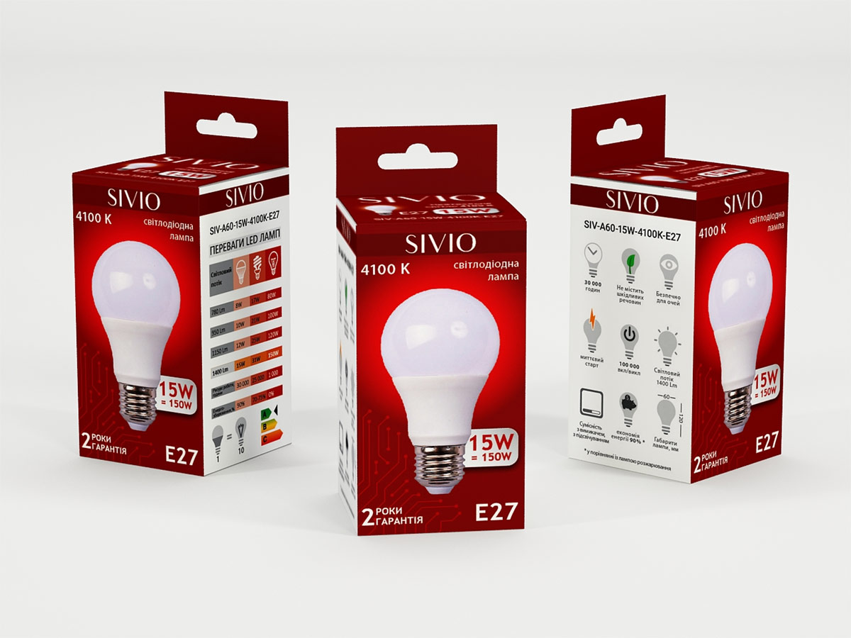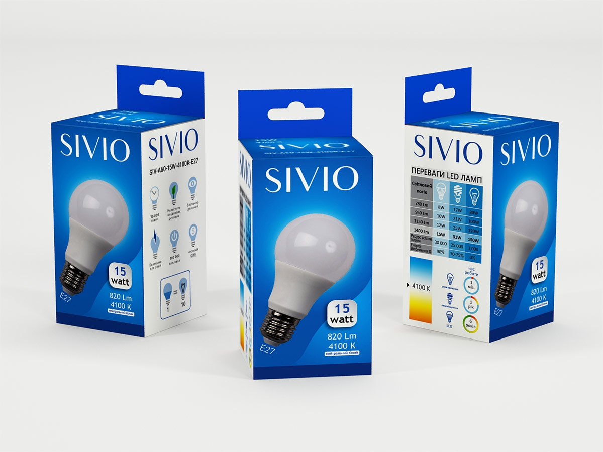 TM "SIVIO" займається виробництвом світлодіодної, освітлювальної Led продукції. Цього року торгова марка SIVIO представила на ринку світлодіодної продукції нову серію світлодіодних ламп. Корпус лампи Е27 складається з алюмінію та теплорозсіюючої пластмаси, що дозволяє чіпу швидше охолоджуватися. За рахунок незначного зменшення вмісту алюмінію в корпусі та зменшення гарантійного терміну ціна ламп зменшилася. Ресурс роботи складає 30 000 год. Дана модель ламп світить на 150W, споживаючи всього 15W.
