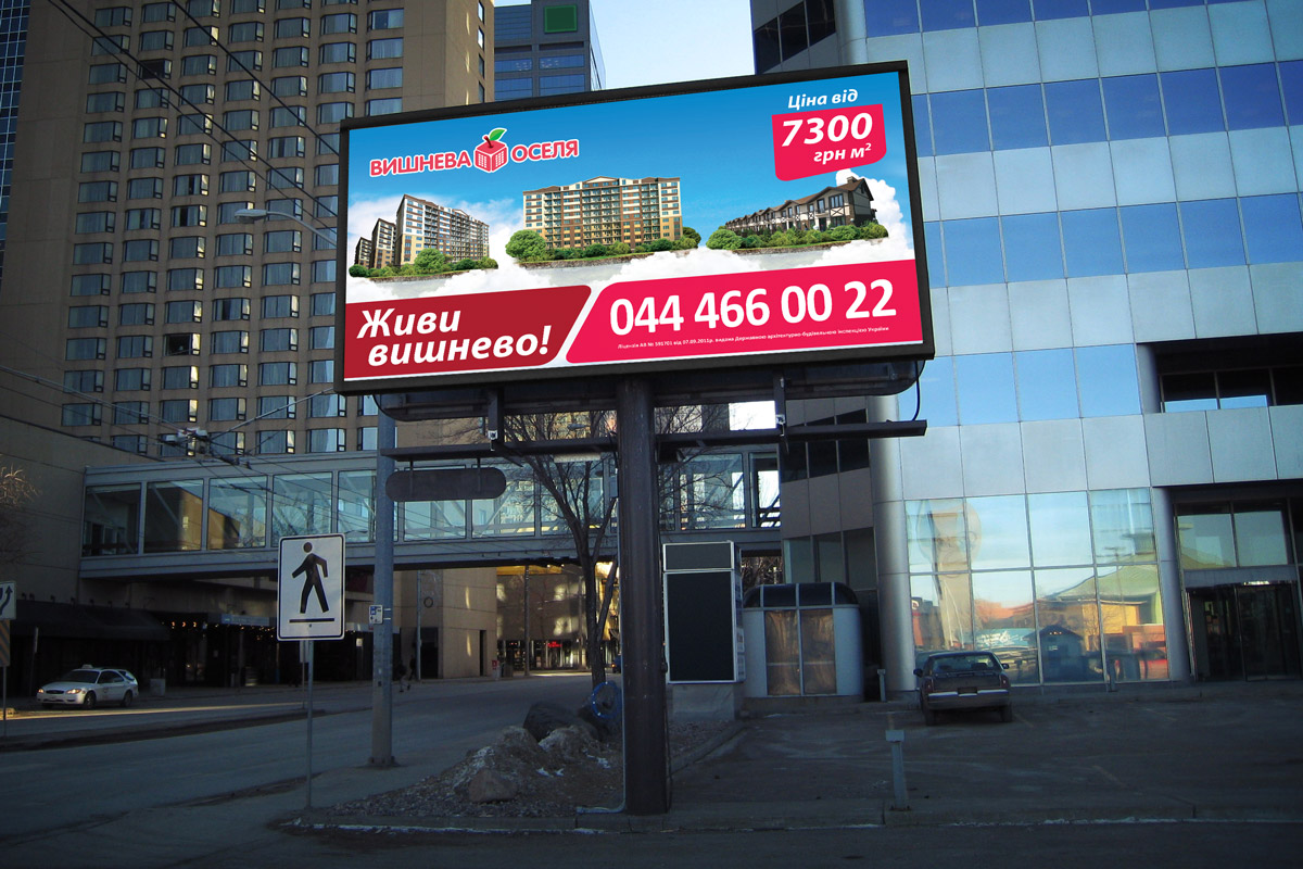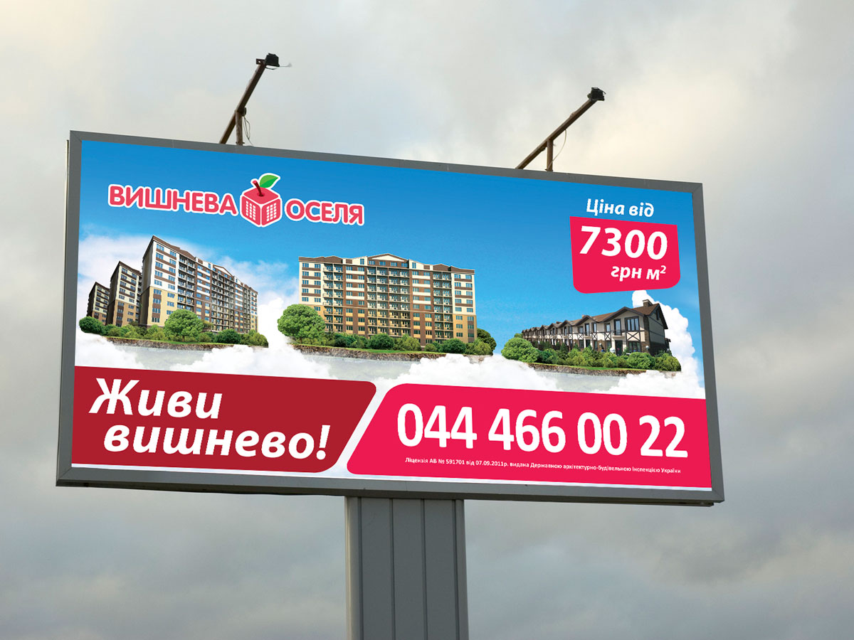 Розробка дизайну рекламного щита (біллборд, бігборд, борд, billboard) для житлового комплексу "ВИШНЕВА ОСЕЛЯ" (Україна) - це максимально зручне житло для кожного мешканця. Висока якість будівництва та зручне місце розташування будинків, розвинена інфраструктура, дитячий майданчик, школа, дитсадок, власна служба експлуатації, спортивні секції, Будинок творчості, школа танців, бібліотека, поліклініка, медичні центри, супермаркети, зупинки з громадським транспортом, 4 км до Києва.