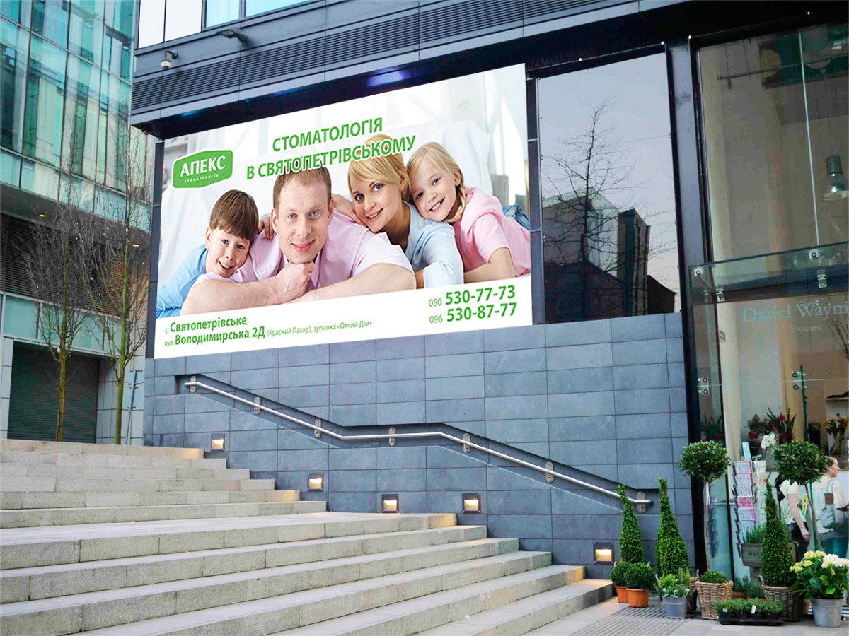Розробка дизайну рекламного щита (білборд, бігборд, борд, billboard) для стоматології АПЕКС. Клініка набула знаменитості завдяки європейському рівню сервісу, комплексному підходу та індивідуальному відношенню до кожного клієнта. Безболісно та швидко всі пацієнти отримують високопрофесійну допомогу, тим самим повертають своїм усмішкам здоров'я та красу. Під час усіх стоматологічних робіт використовуються інноваційні матеріали та сучасне обладнання, що гарантує високоякісне лікування та досягнення точного та ефективного результату. Завдяки високій технічній оснащеності стоматології тут можуть бути вирішені будь-які завдання, незалежно від рівня складності. У стоматології працюють лише висококваліфіковані фахівці, які мають значний досвід роботи, глибокі знання та практичні навички.