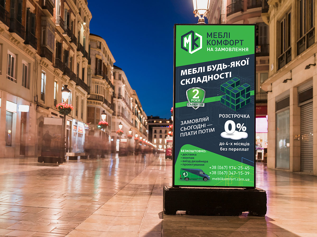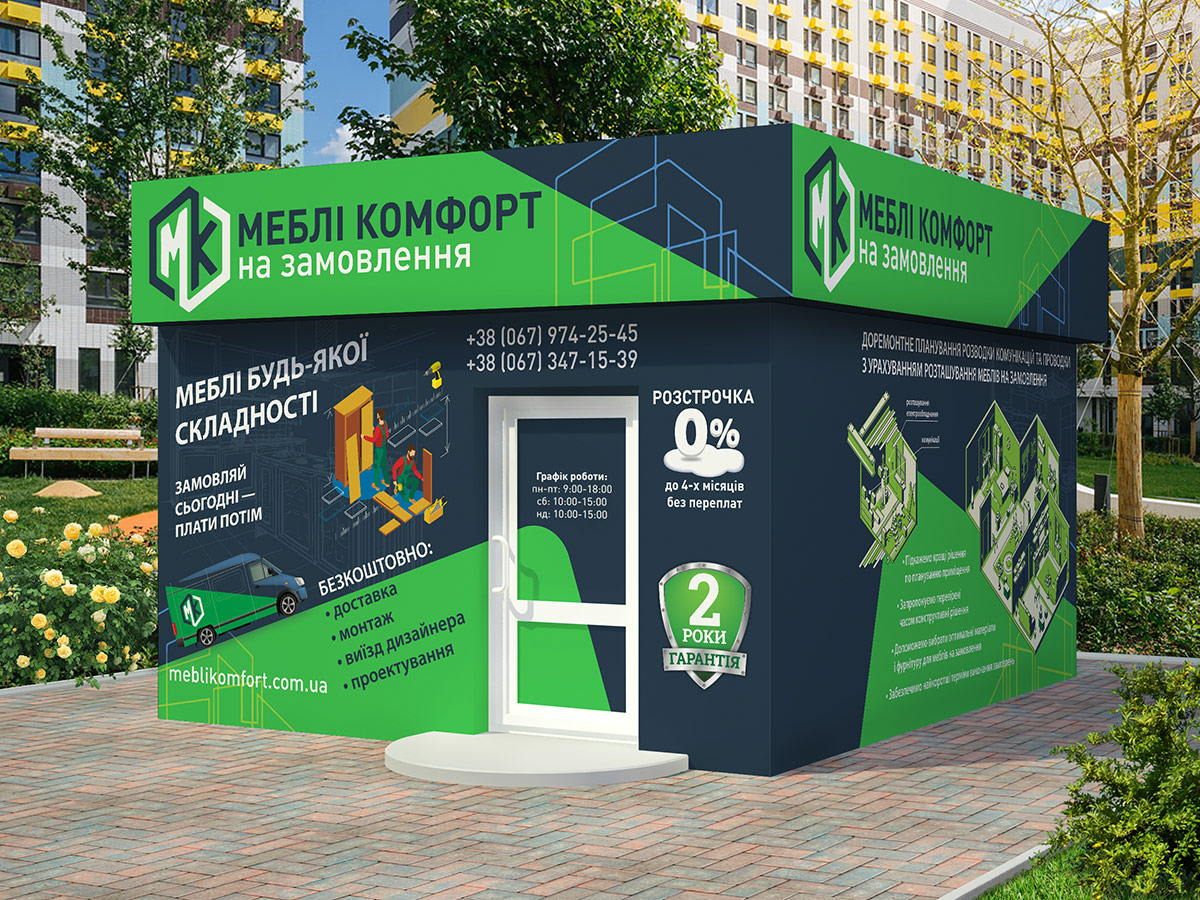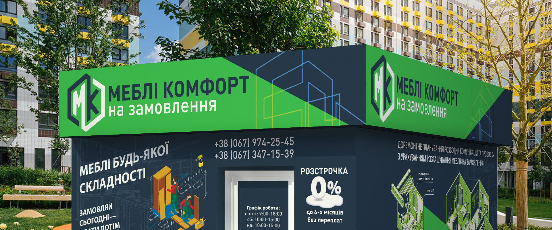 До нашої студії звернулися за розробкою дизайну оформлення торгової точки (МАФ) для компанії “Меблі Комфорт” - меблі на замовлення (м. Могилів-Подільський, Вінницька обл., Україна). В рамках роботи ми створили новий фірмовий стиль компанії та продумали до дрібниць всі елементи розташування дизайну з урахуванням специфіки об'єкта.