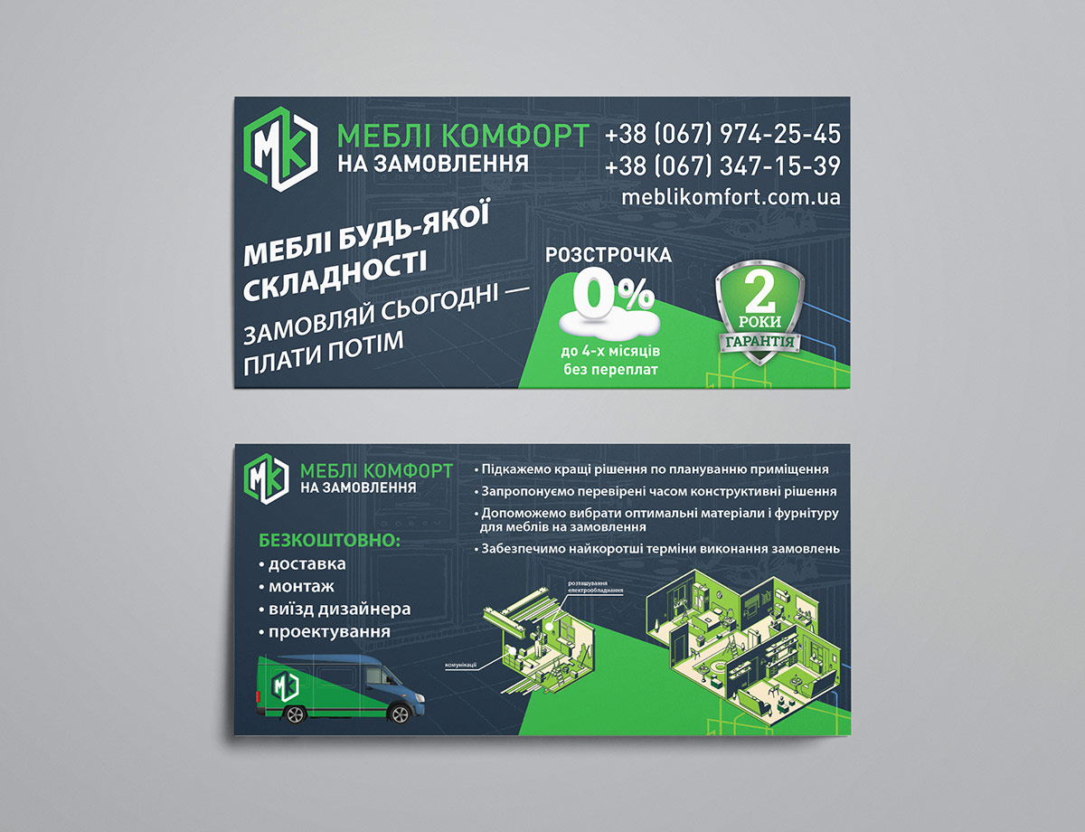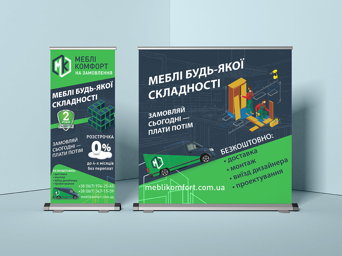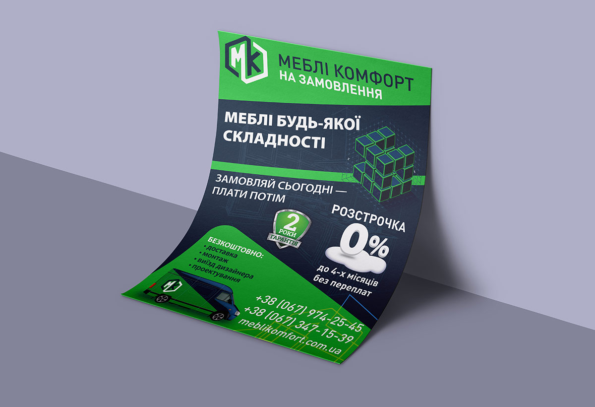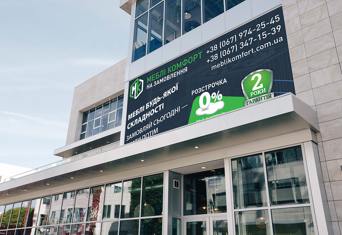 До нашої студії звернулися за розробкою дизайну оформлення торгової точки (МАФ) для компанії “Меблі Комфорт” - меблі на замовлення (м. Могилів-Подільський, Вінницька обл., Україна). В рамках роботи ми створили новий фірмовий стиль компанії та продумали до дрібниць всі елементи розташування дизайну з урахуванням специфіки об'єкта.