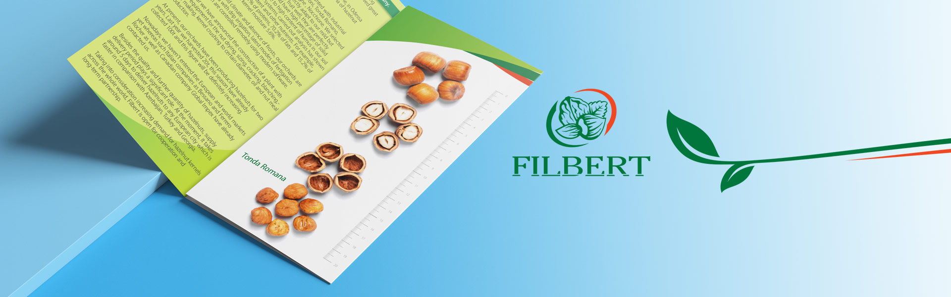 Розробка макета дизайну та верстка ліфлету для ТОВ НВО «Філберт» (Україна) - високотехнологічне сільськогосподарське виробництво, що використовує технології інтенсивного землеробства, краплинного поливу, датчики вологи в ґрунті, інтелектуальне підживлення рослин за принципом "необхідне вчасно" , віддалений контроль за поливом та виробництвом. Основні культури, що культивуються - горіхові, а саме: фундук, мигдаль, волоський горіх.