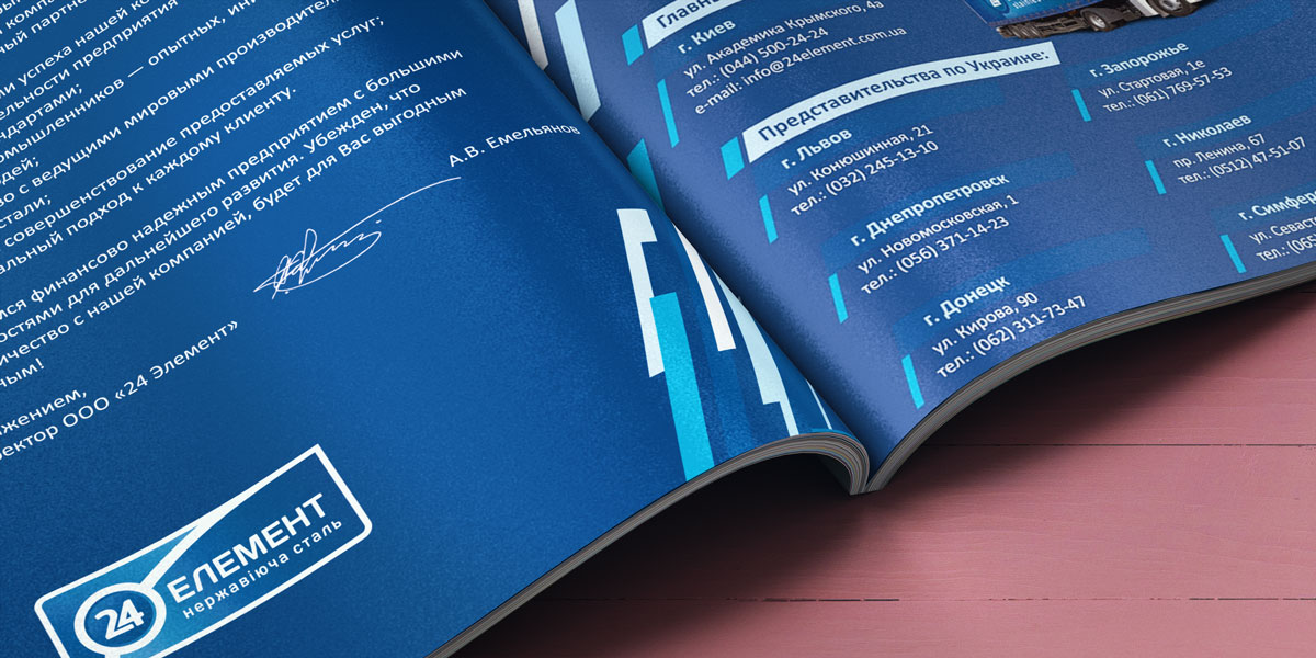 Розробка дизайну та верстка буклету для ТОВ «24 Елемент» (Україна). Компанія спеціалізується на постачанні сортового, трубного та листового металопрокату з нержавіючих корозійностійких сталей, вироблених провідними зарубіжними виробниками. Пропонує українським споживачам нержавіючий металопрокат у широкому сортаменті. Якщо потрібно купити металопрокат — компанія запропонує продукцію кращих іноземних виробників. Переваги взаємовигідного співробітництва вже оцінили понад тисячу постійних клієнтів — вітчизняні підприємства, які працюють у будівництві, хімічній, машинобудівній та харчовій промисловості.