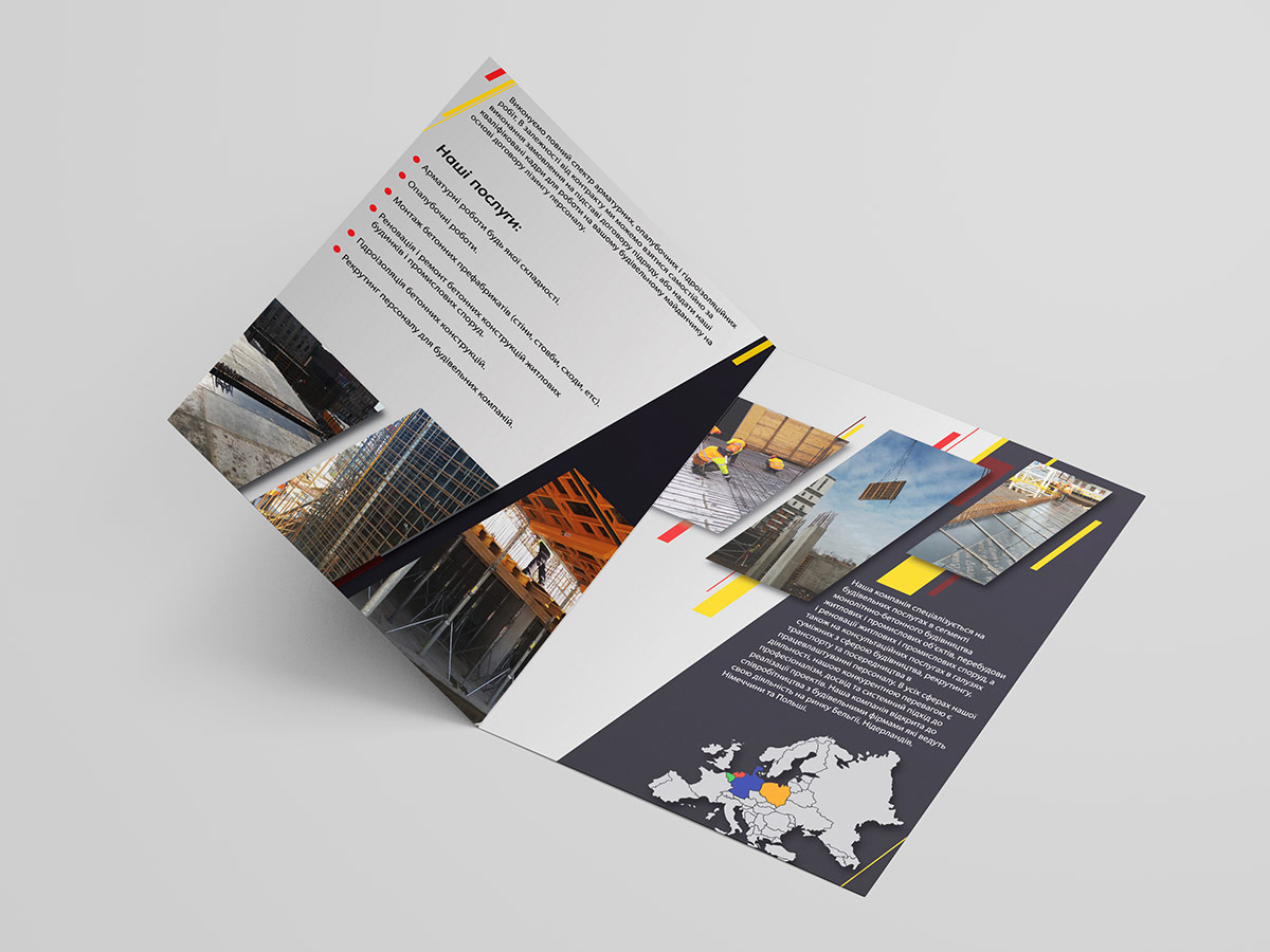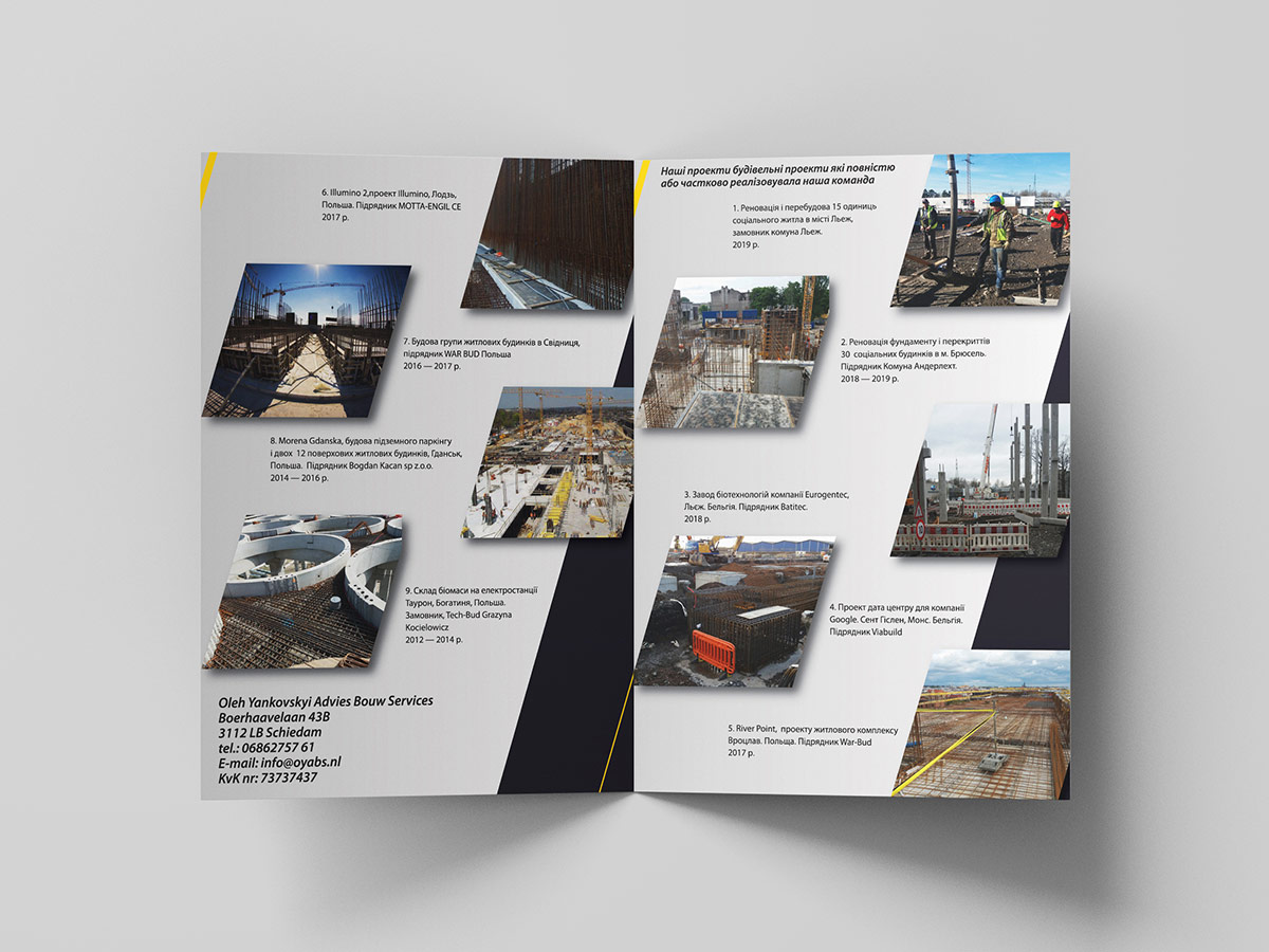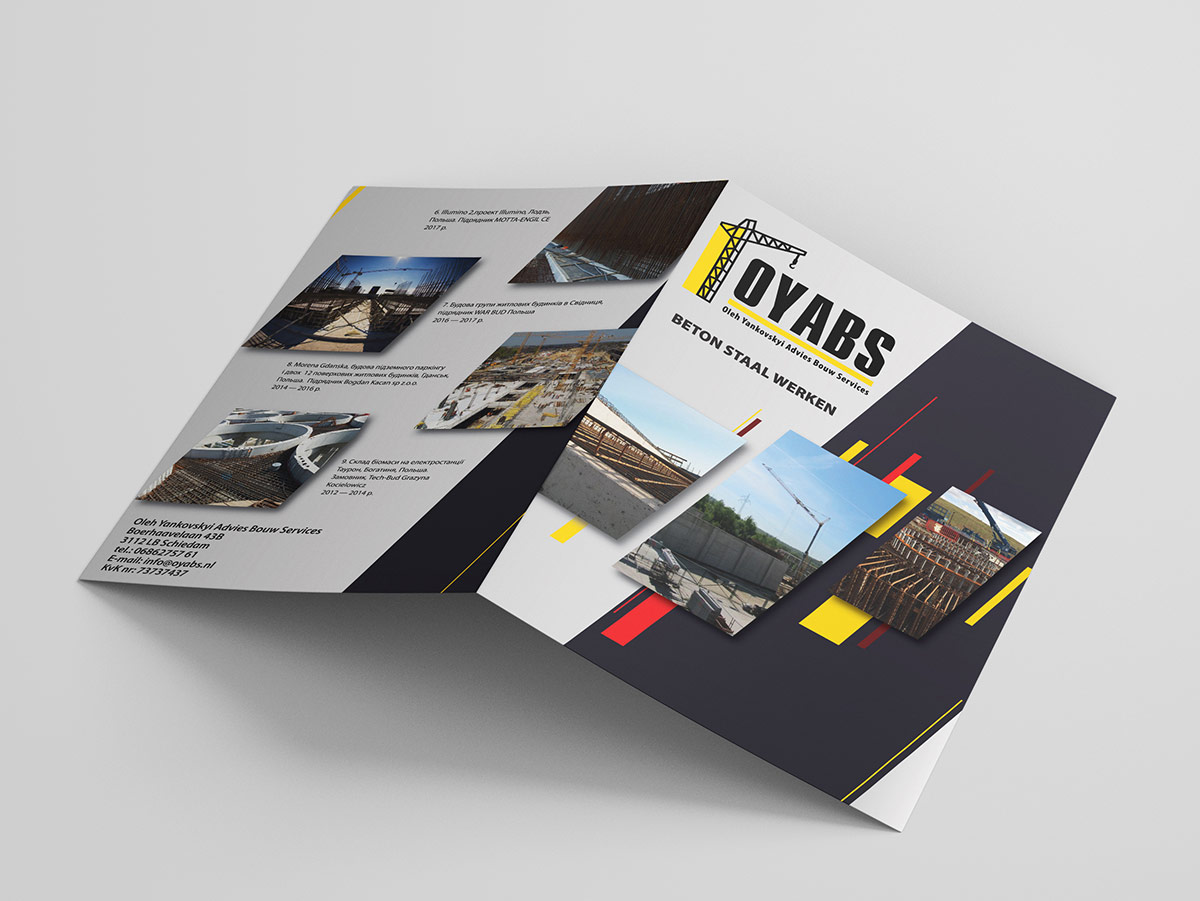 Розробка дизайну комерційної пропозиції, буклету для компанії «OYABS», що спеціалізується на будівельних послугах у сегменті монолітно-бетонного будівництва житлових та промислових об'єктів, перебудови та реновації житлових та промислових споруд, а також на консультаційних послугах у галузі суміжних зі сферою будівництва, рекрутингу, транспорту та посередництва у працевлаштуванні персоналу.