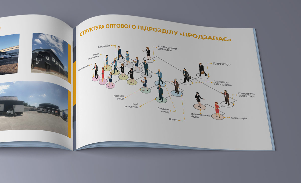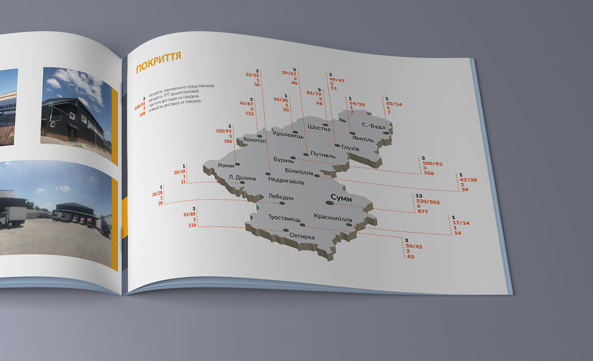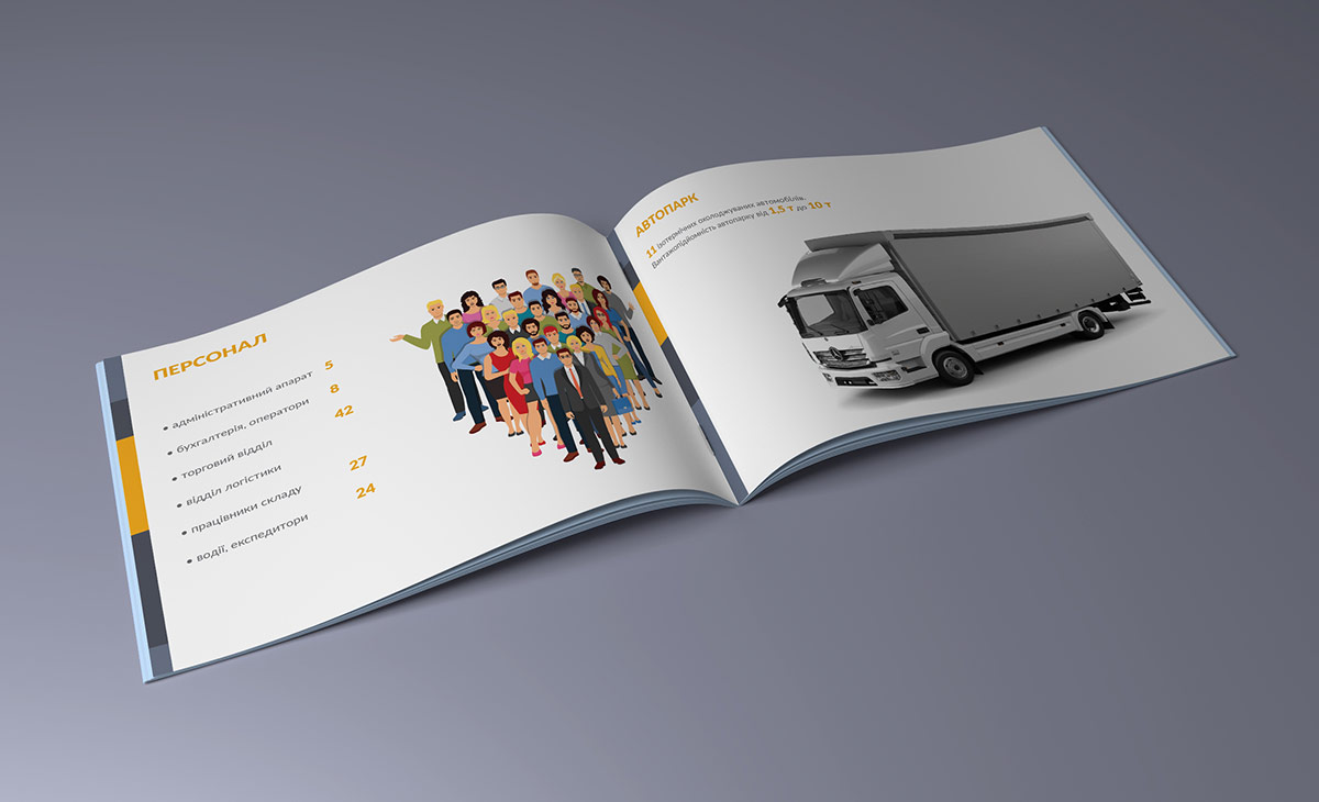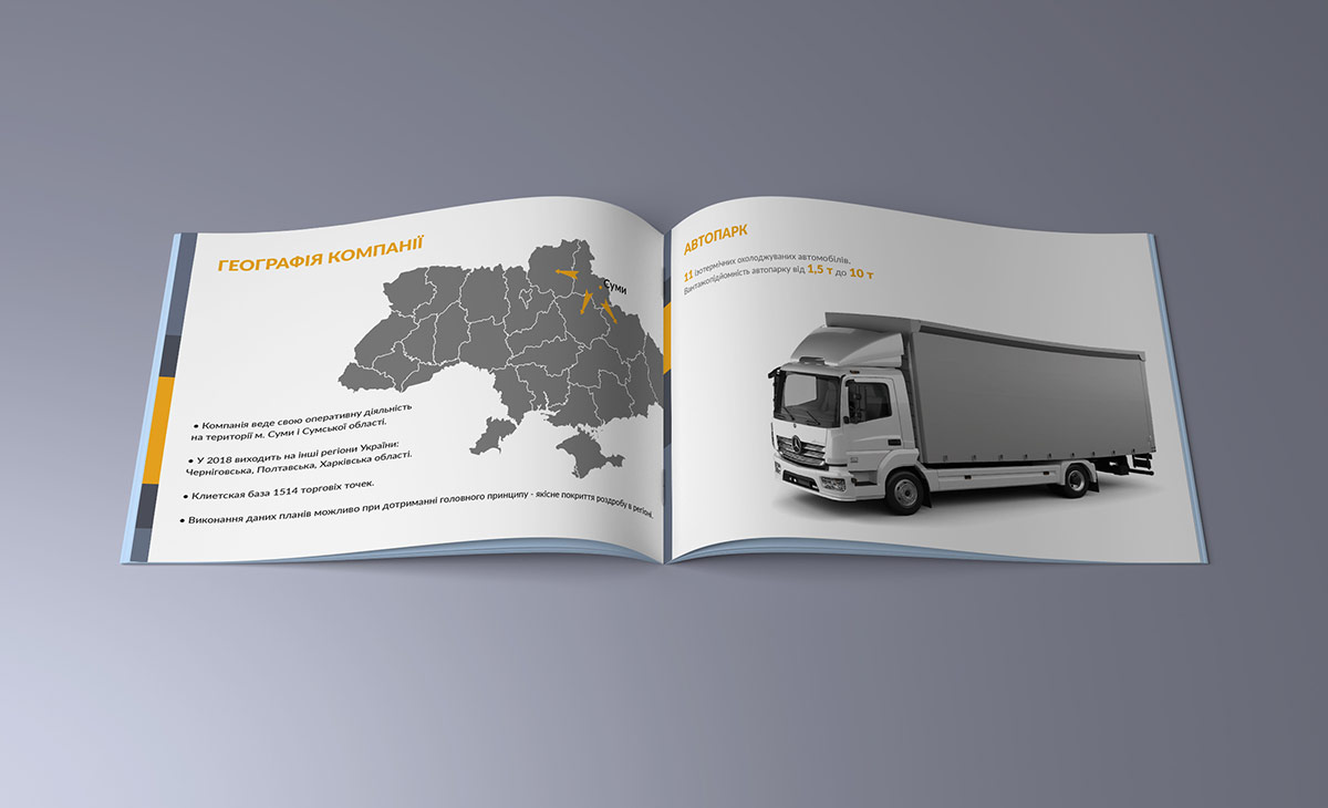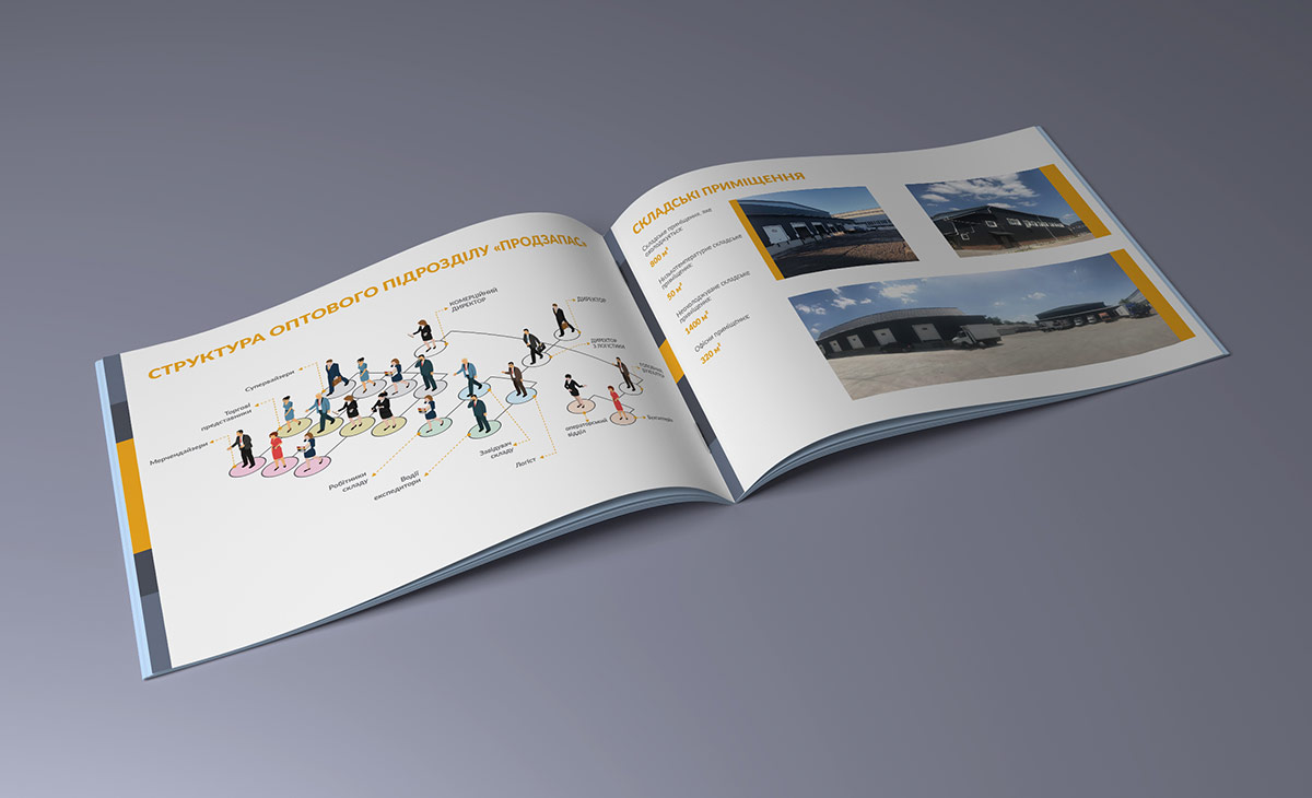 У студії було виконано роботу з розробки дизайну та оформлення презентації. В результаті проведеної роботи було створено дві версії презентації українською та англійською мовами - для розсилки електронною поштою (.pdf) та для друку в поліграфії.