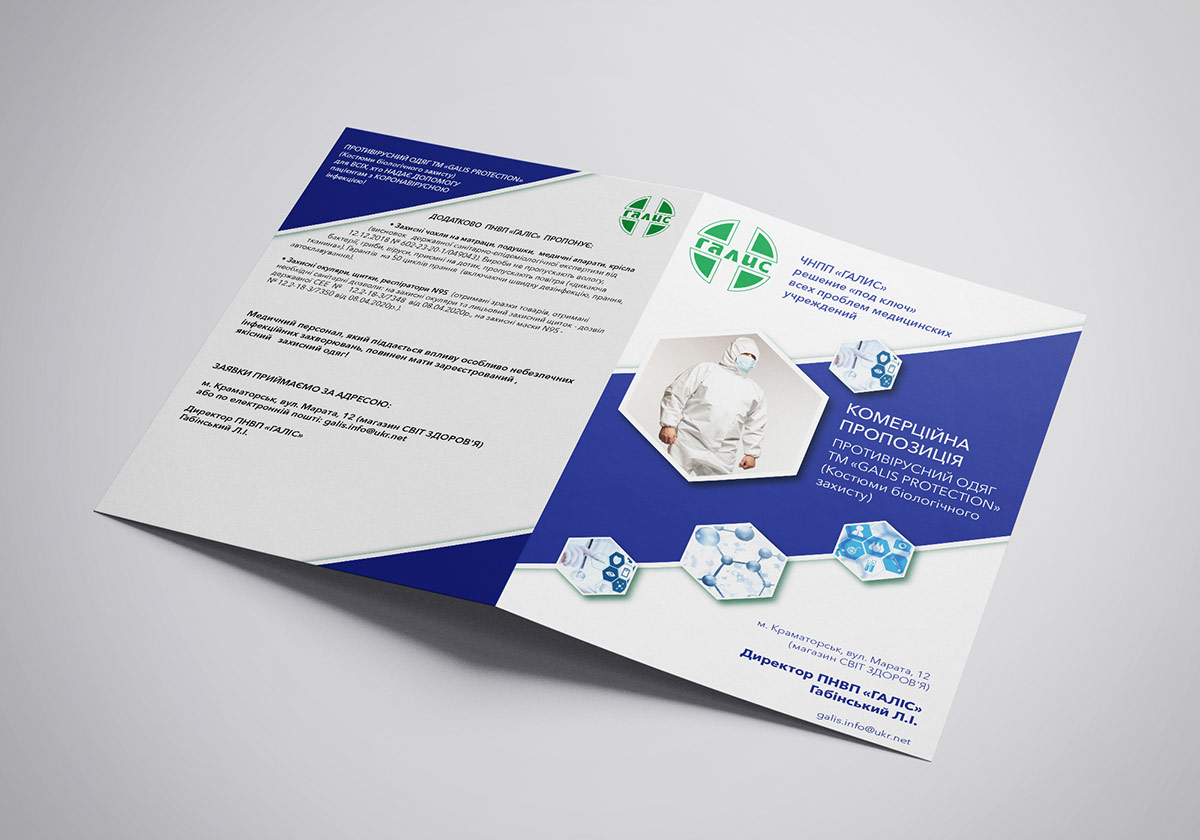 Розробка концепції дизайну та оформлення комерційної пропозиції (КП) для ПНВП «ГАЛІС» – рішення «під ключ» усіх проблем медичних закладів. Компанія «ГАЛІС» – це підприємство, яке спеціалізується на постачанні товарів медичного призначення для державних та приватних установ. Основні групи: медикаменти, медичне та лабораторне обладнання, мікроскопи, аналізатори, медичні та лабораторні меблі, дезінфекційні засоби, медичний одяг, повний спектр товарів для стоматології - від установки до пульпоекстрактора, одноразові вироби (шприци, рукавички, перев'язка, клейонка тощо) .).