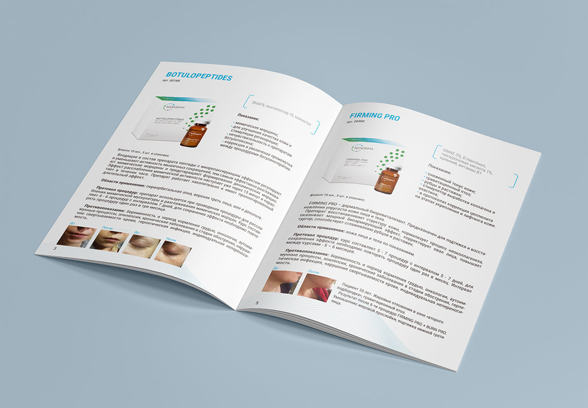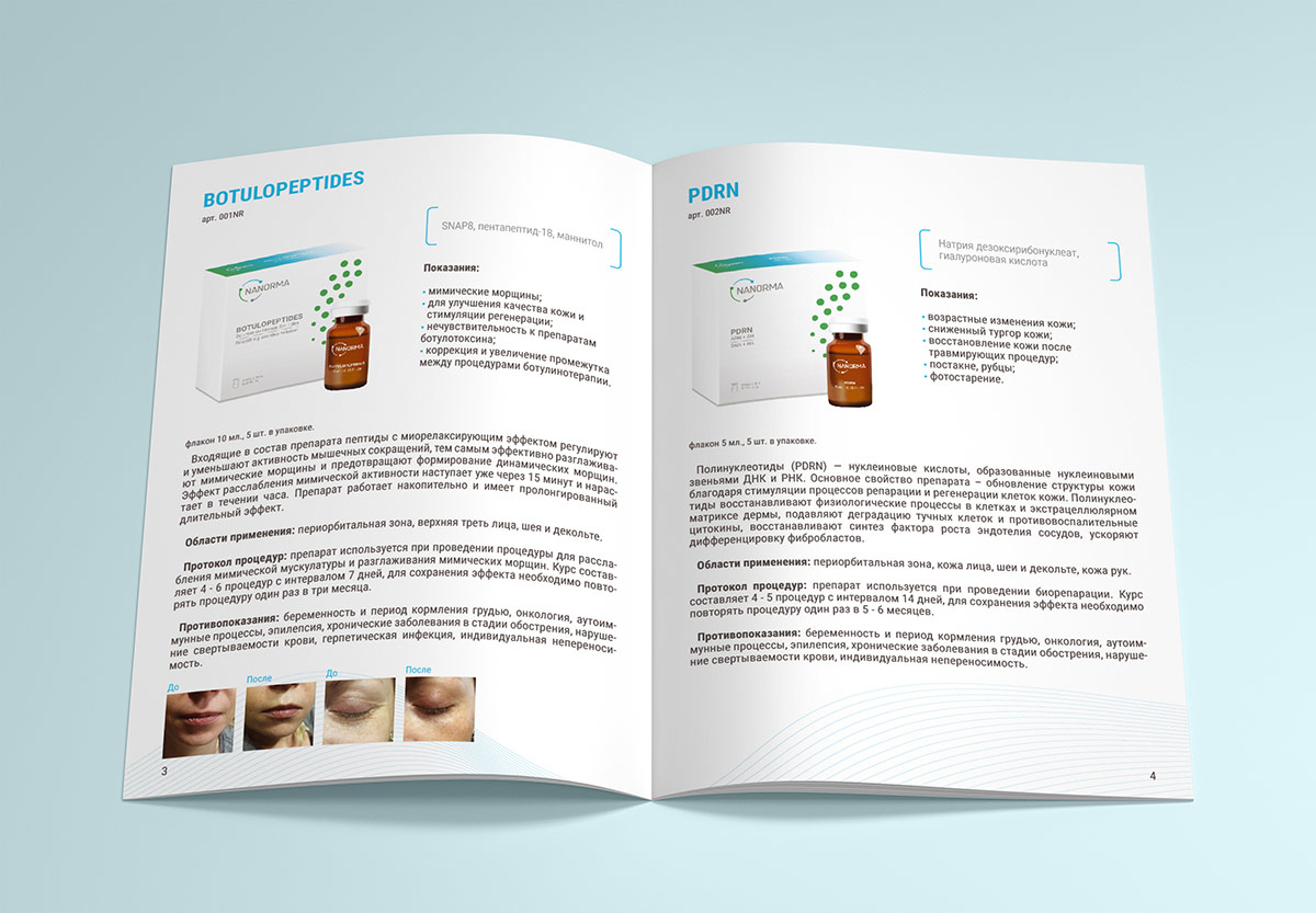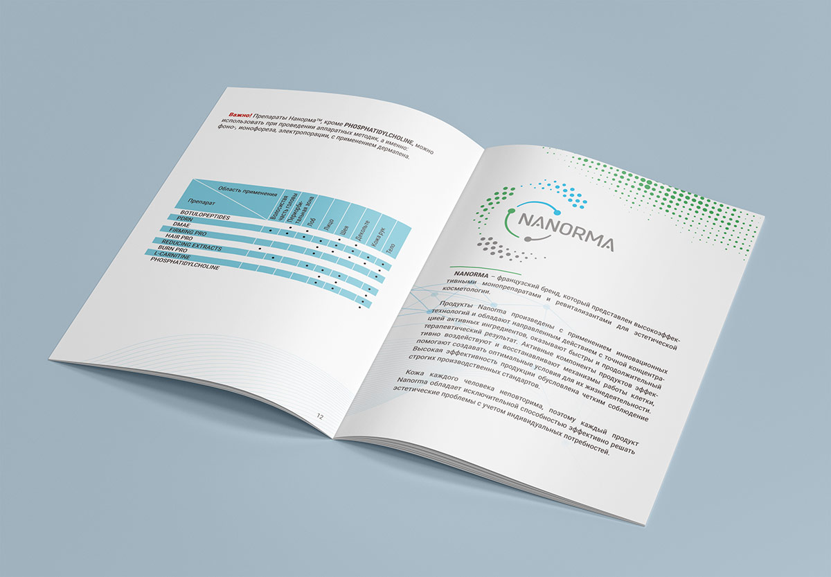 Розробка дизайну та верстка каталогу для NANORMA була виконана з урахуванням фірмового стилю бренду, описаного в бренд буку.