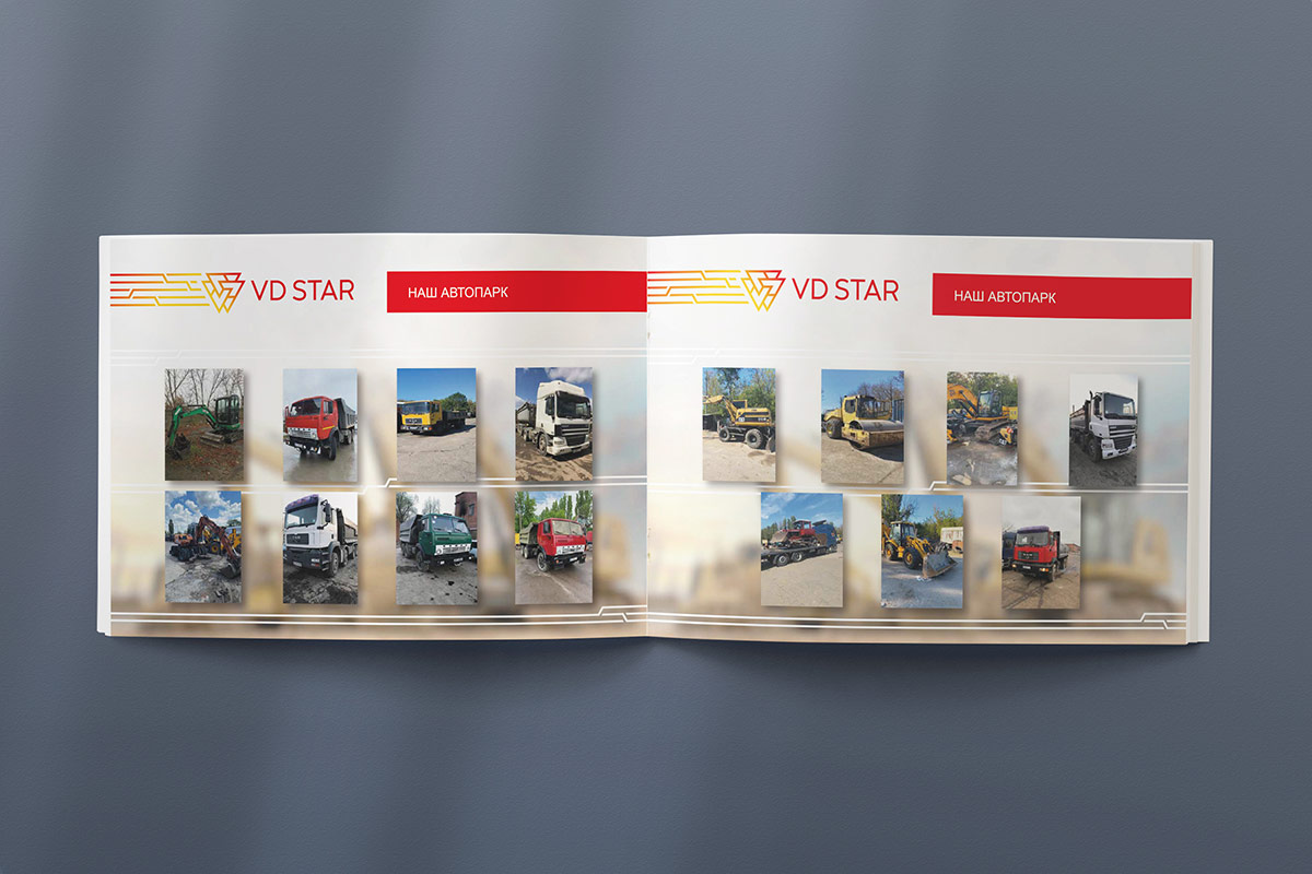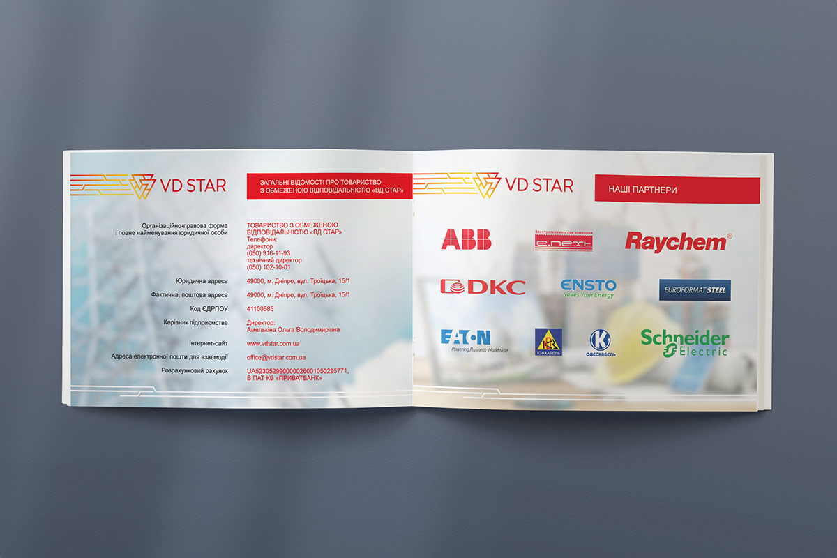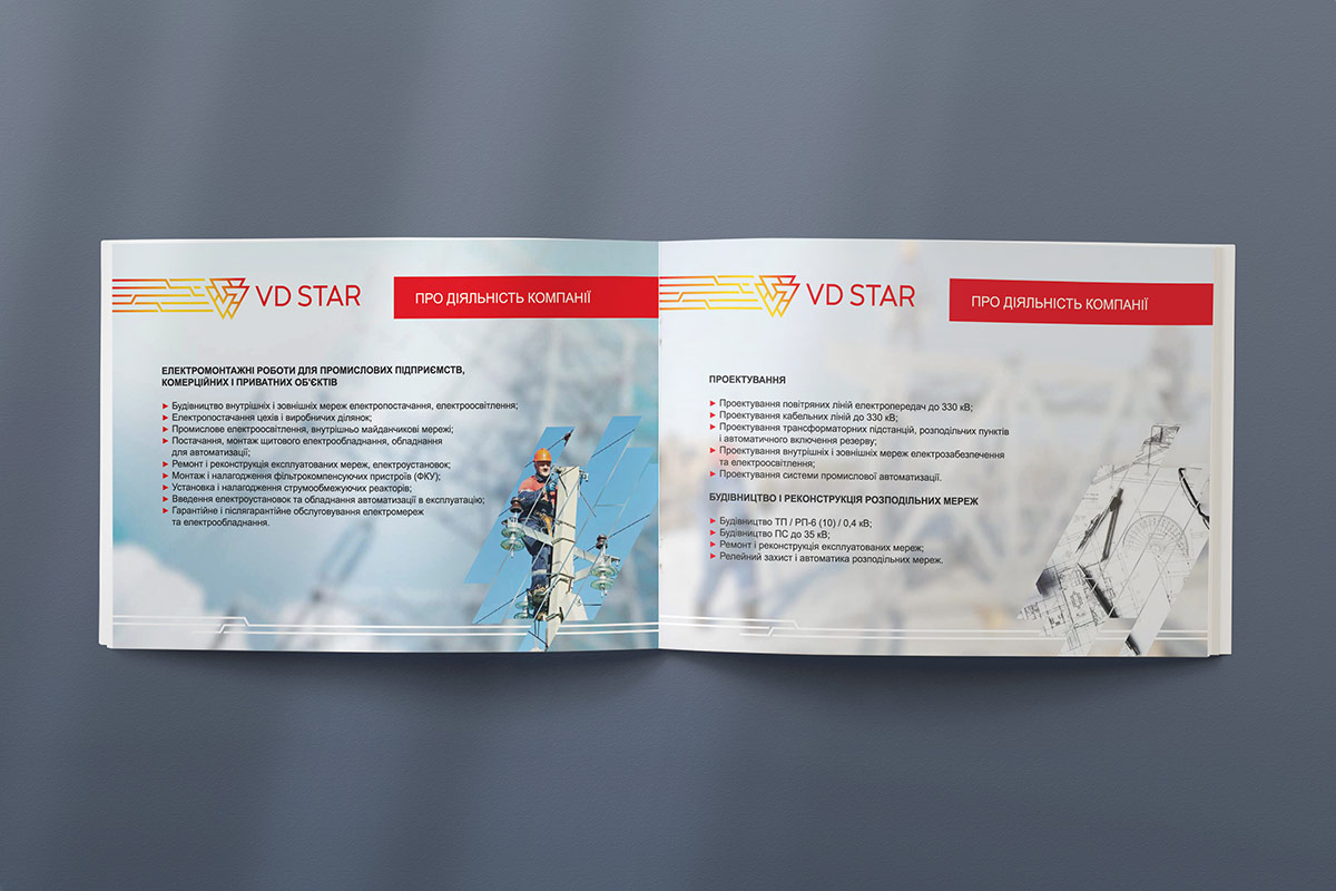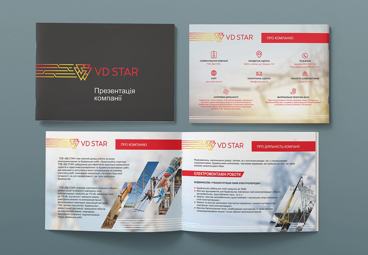 Розробка дизайну та верстка презентації компанії “VD STAR” була виконана з урахуванням розробленого в нашій студії логотипу та фірмового стилю, який детально описаний у брендбуку.