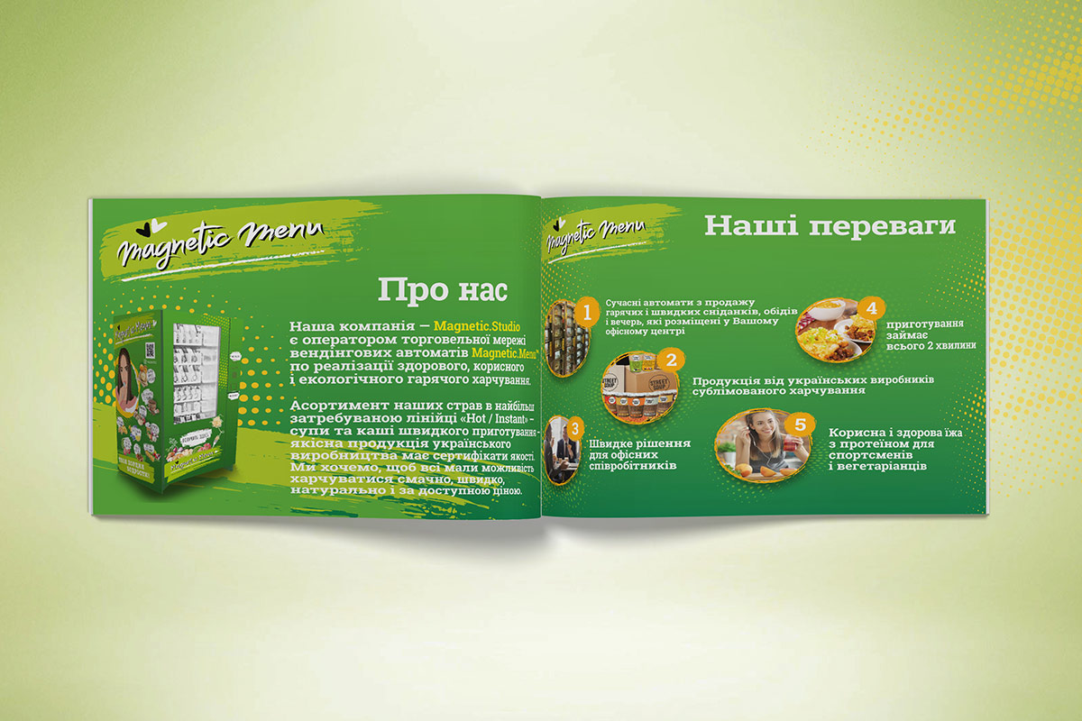 Розробка концепції дизайну та оформлення презентації для компанії Magnetic.Studio, яка є оператором торгової мережі вендингових автоматів Magnetic.Menu™ з реалізації здорового, корисного та екологічного гарячого харчування. Асортимент страв у найбільш затребуваній лінійці «Hot/Instant» – супи та каші швидкого приготування – якісна продукція українського виробництва має сертифікати якості.