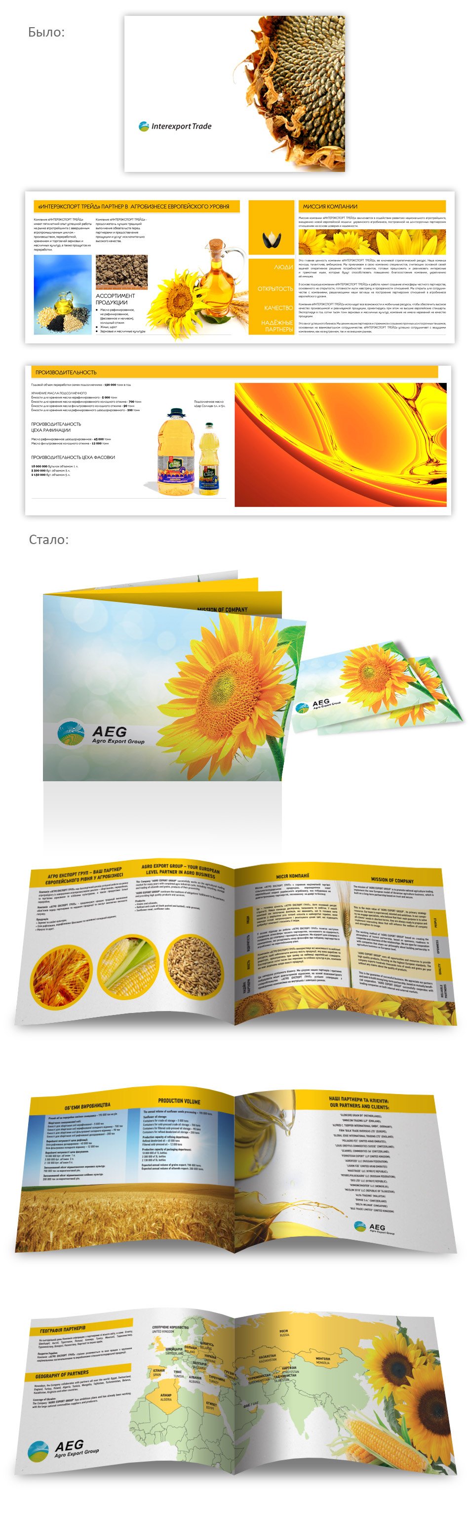 До нашої студії звернулися за редизайном фірмового стилю буклету компанії «АГРО ЕКСПОРТ ГРУП», яка займається сприянням національній торгівлі сільськогосподарською продукцією, виробляє впровадження нової європейської моделі українського агробізнесу, побудованої на довгостроковому партнерстві, заснованому на довірі та безпеці.