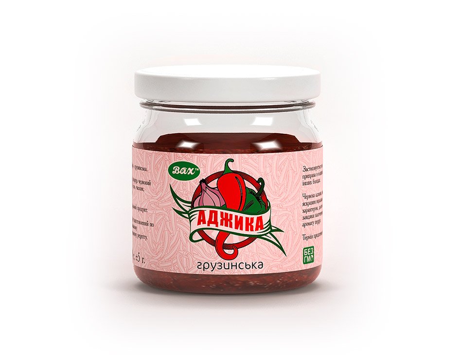 Дизайн етикетки виконаний у яскравих кольорах, щоб відобразити суть інгредієнтів приправи, а також доданий такими складовими, як часник та перець. Ви колись пробували справжню грузинську аджику? Якщо ні, тепер ви маєте можливість це зробити!
