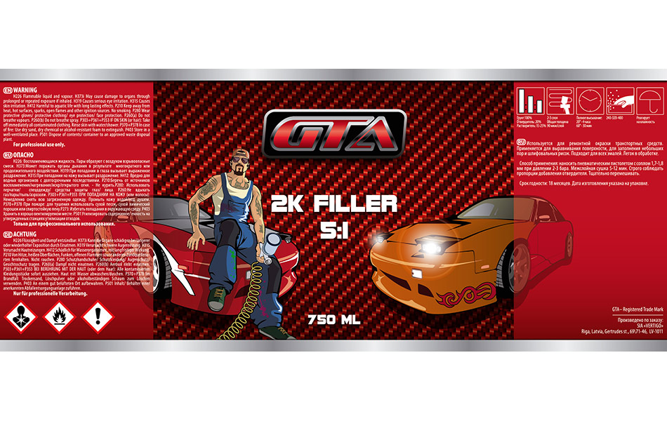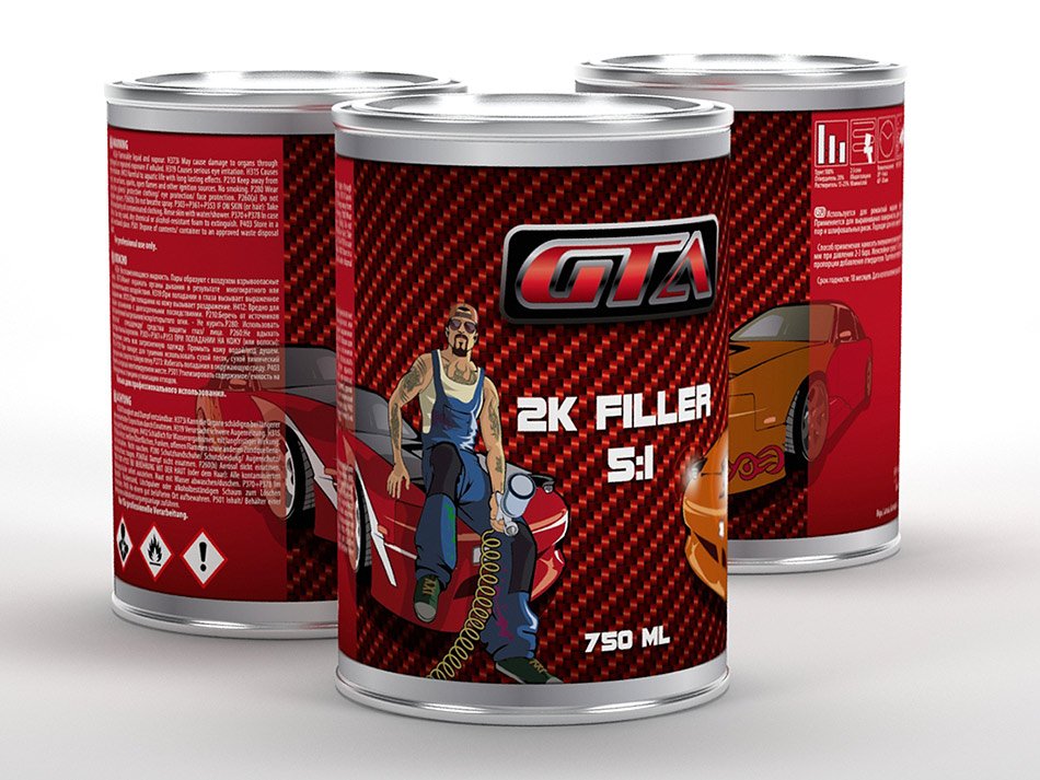 У нашу студію звернулися за створенням логотипу та етикетки ТМ “GTA” - автомобільні фарби, лаки, ґрунти, шпаклівки. Логотип повинен відображати автомобільну тематику та бути шрифтовим. Дизайнерами було прийнято рішення розробити логотип у стилі “GT” – позначення гоночного класу в автомобільних змаганнях (німецький аналог індекс – GTI). Для надання динаміки в логотипі використовується похилий шрифт, а для відображення спортивної тематики – червоний, чорний та сталевий колір.
